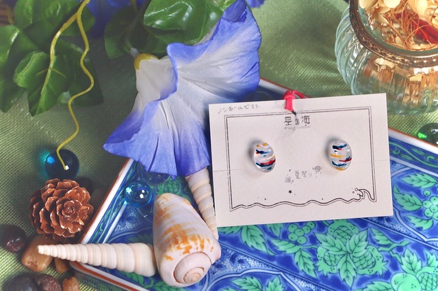 ノンホールピアスのみ 「なにやら祭の声がする。」 涼しげで合わせやすい軽量アクセサリーが入荷! トップは透明なオーバル。その上に赤、青、黄色、白でヨーヨーの柄を手描きし、表面を風船のようにマットに加工しました。 ひんやりとした氷のようなデザインにパリッとしたカラーが夏らしくて可愛いです♡ ノンホールピアスのため金属アレルギーの方や重いアクセサリーが苦手な方でも大丈夫ですよ! 浴衣や和装はもちろん、普段着に合わせるだけで夏っぽいコーディネートに仕上げてくれます♪ 「ひとつ残された水風船」 耳シートの左は平均的な女性の普通〜大きめの耳、右は小さめの耳のモデルとなっております。ご参照ください。 ※ハンドメイド品であることを考慮の上ご購入ください。 検索用 ハンドメイド アクセサリー ピアス イヤリング お祭り 浴衣 コーデ ファッション コーディネート 和風 チャイナ 中華 かわいい 綺麗 プレゼント ギフト 不思議 ヨーヨー 水風船 夏祭り 祭の 神社 赤 白 マット クリア 透明 オリジナル デザイン あやかし 妖狐 夏