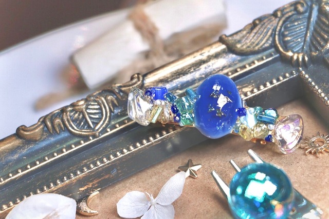 サイズ:約 4.5×1.7 cm 「いつも見上げるあの光へ届くまで。」 キラキラがギュッと詰まったミニバレッタの登場! トップは薄い青を敷いた深い水底のようなオーバルパーツ。金箔を散らしつつ、緑に偏光するオーロラ加工がさりげなく輝きます… 周りは水色、青、緑、クリアをメインにぎっしりとビーズやストーンを敷き詰めています♡間に散らばるゴールドのブリアンやミニパールで可愛らしさもばっちり! ヘアアレンジに足すだけで、一気に華やかに、そして小ぶりなサイズが程よい煌めきを出してくれますよ♪ ※ハンドメイド品であることを考慮の上ご購入ください。 検索用 ハンドメイド アクセサリー ミニ 小さめ ヘア バレッタ アレンジ レジン チェコ ガラス ビーズ キラキラ オーロラ 色が変わる ゴールド 金 喫茶店 レトロ キャンディ ドロップ 美味しそう かわいい プレゼント スイーツ カフェ 好き ギフト お子さん 子ども 彼女 恋人 友人 ご褒美 ぎっしり 原色 大人っぽい 青 クリア 水色 金 クリア 透明