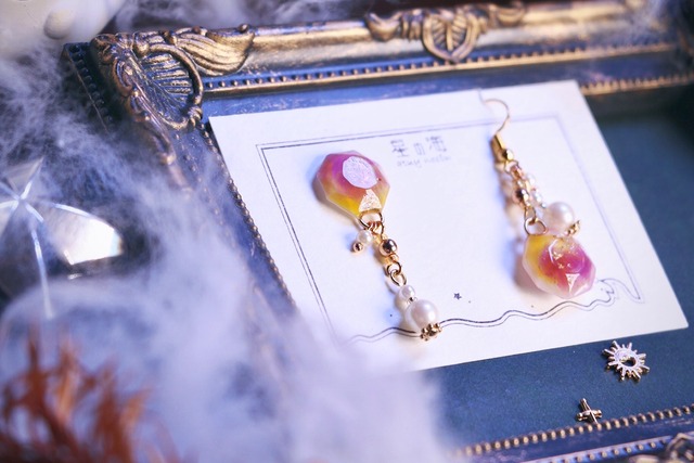 イヤリング等への変更可(「イヤリングへの変更」等を選択して購入してください。) 「どんなにモヤがかかろうと、どんなに道を阻まれようと、この夢は絶対に失わない。」 マットでも可愛らしくキラキラなパーフェクトアクセサリーが新入荷…♡ 三角の型にはぼかした白を敷き、後ろが透けすぎないように。その上にパールラメを混ぜたレジンを乗せて水色を中心としたオーロララメを詰め込んでいます。デザインを締めるためにゴールドのブリオンも配置♪ 上側をすりガラスのようなマットコートにしているため、中で輝くオーロラの光も少し控えめになってまるでコットンキャンディのようです♡ 霧やモヤで閉じ込められたような雰囲気の中、キラリと光るオーロラフィルムとふんわりとした輝きを持つパールラメが存在感を失わない姿が大事に持っている憧れのようで「夢」というタイトルをつけました。 角度による色の変化を楽しむのはもちろん、三角の向きを左右で変えてアシンメトリーな使い方もできちゃいます! どんなお洋服にも合わせやすいので、プレゼントなんかにもおすすめですよ♡ 耳につけるパーツをつけていないため、台紙にはマスキングテープで留めている状態です。耳シートの左は平均的な女性の普通〜大きめの耳、右は小さめの耳のモデルとなっております。ご参照ください。 ※ハンドメイド品であることを考慮の上ご購入ください。 検索用 ハンドメイド アクセサリー ピアス イヤリング ノンホールピアス クリア マット オーロラ ネイル パールラメ 白 ふんわり きれい 雲 かわいい パフスリーブ 三角 シアーカラー 韓国風 アシンメトリー 女の子らしい ゆめかわ シナモンロール シナモロール 雰囲気