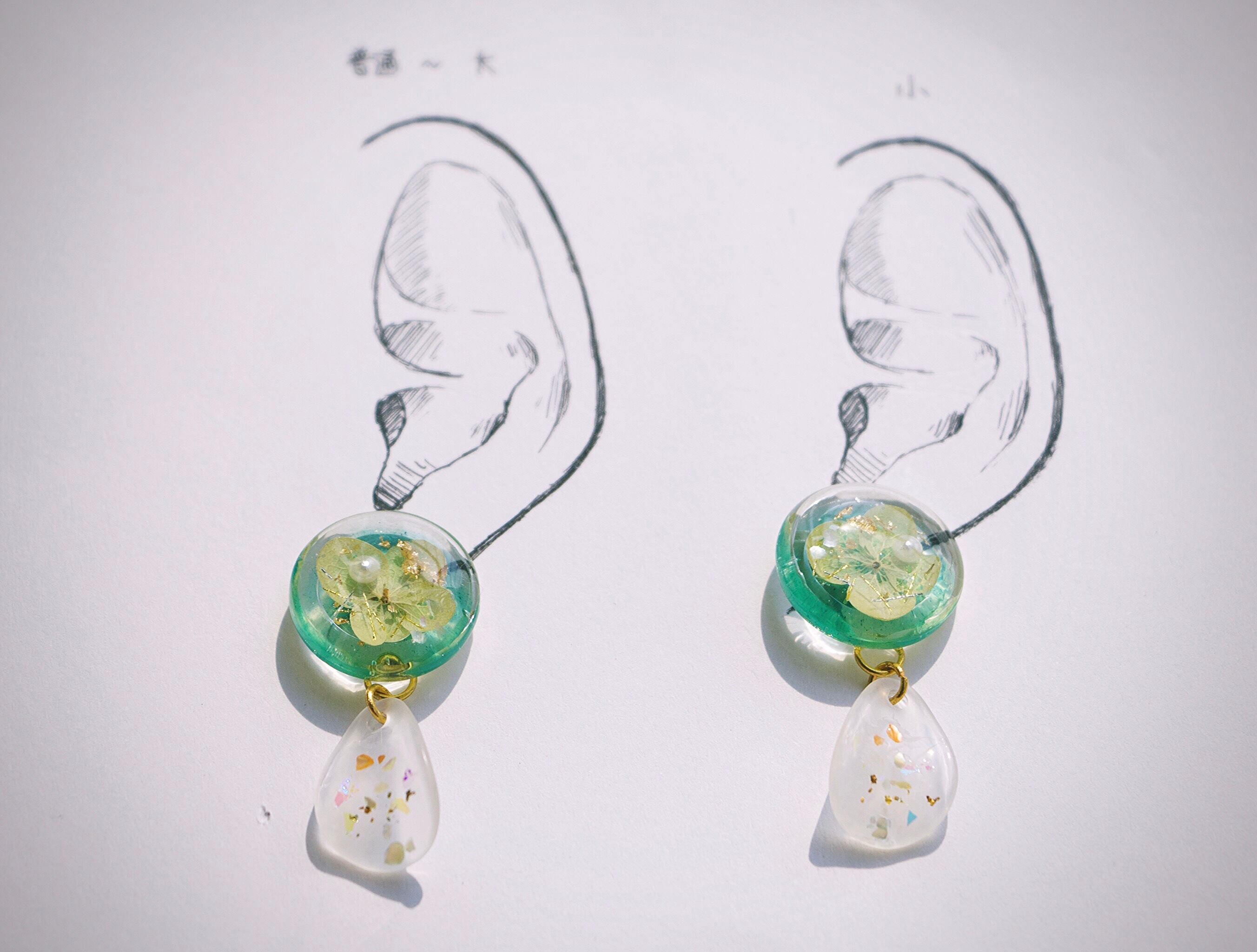 クリアパーツやレジンの塗り方など、透明感のあるぷっくりとしたフォルムで花弁に溜まった雨をイメージをしています。