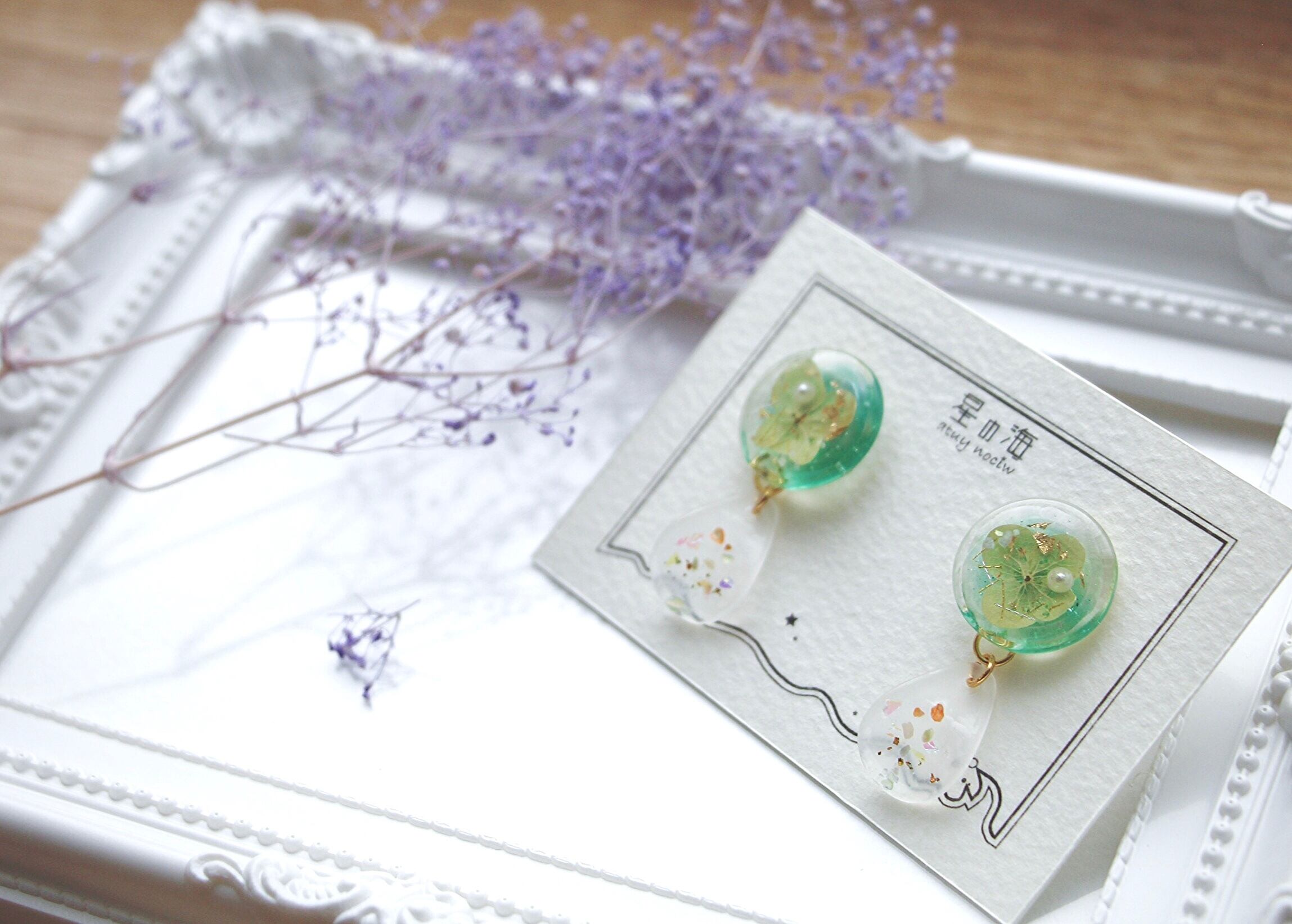 花弁のようなチャームパーツにはシェルやフィルムなどを散らし、さりげない輝きを放ってくれます♡