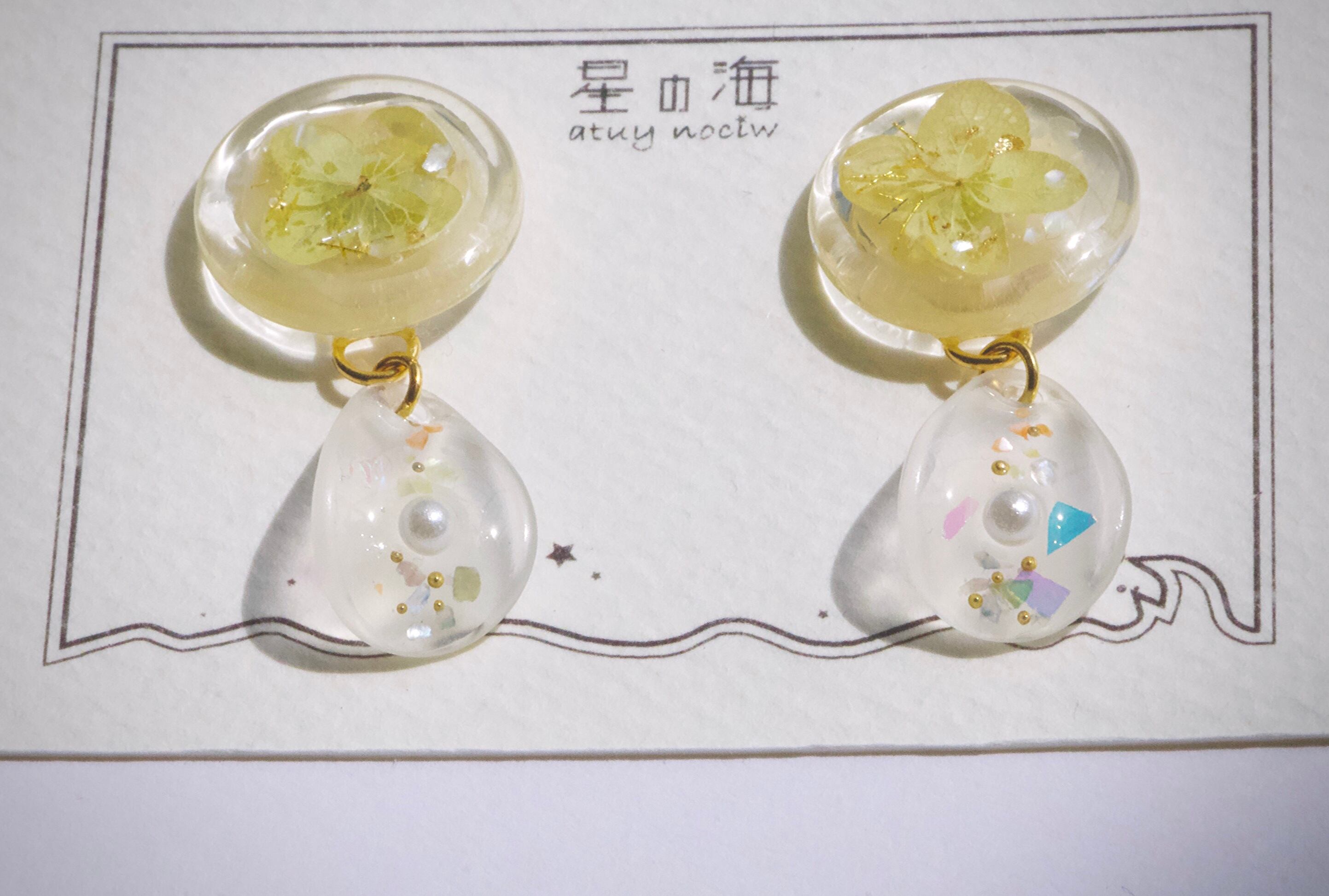 花弁のようなチャームパーツにはシェルやフィルムなどがさりげない輝きを放ってくれるだけでなく、落ちる滴のような小さなパールもポイントです♡