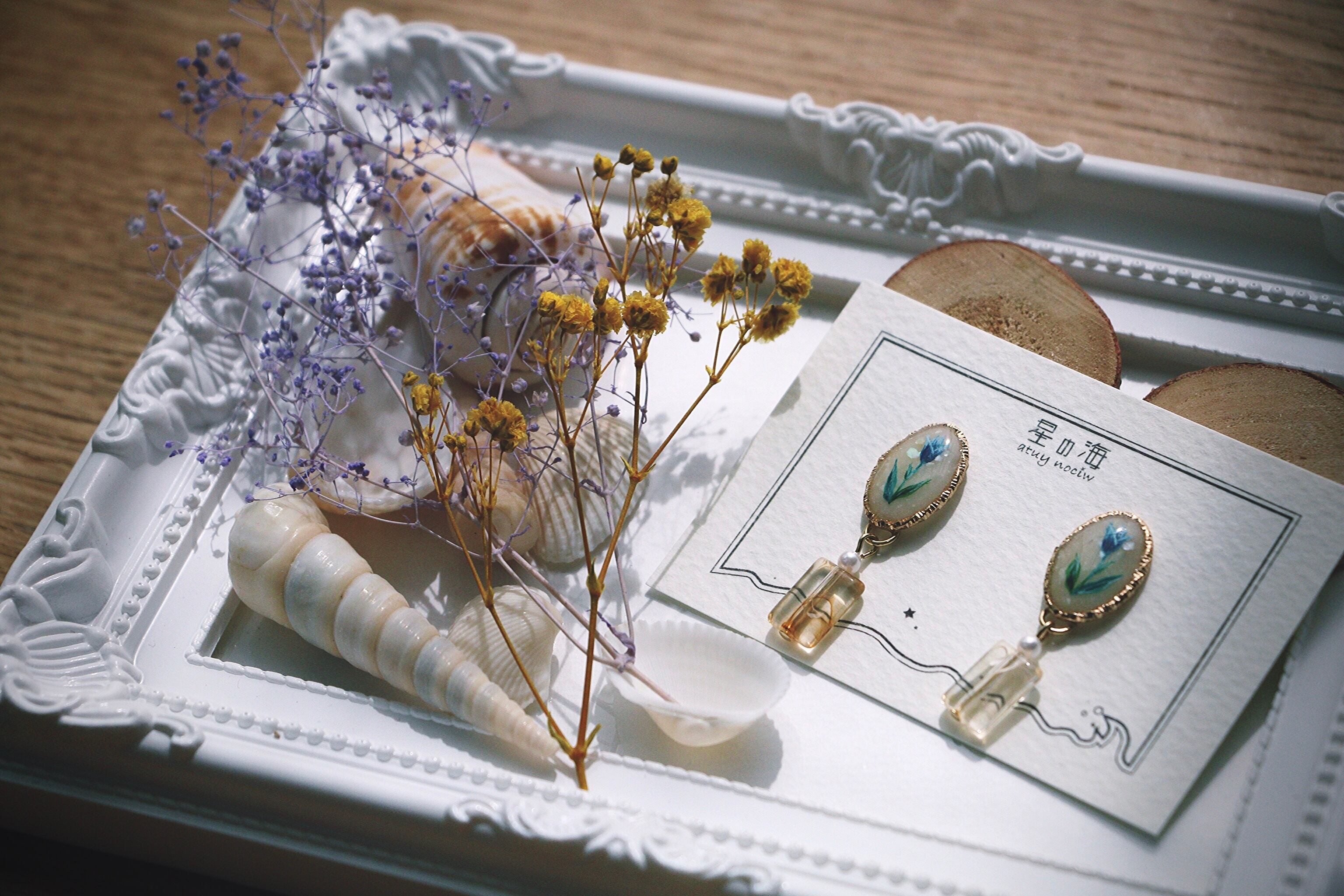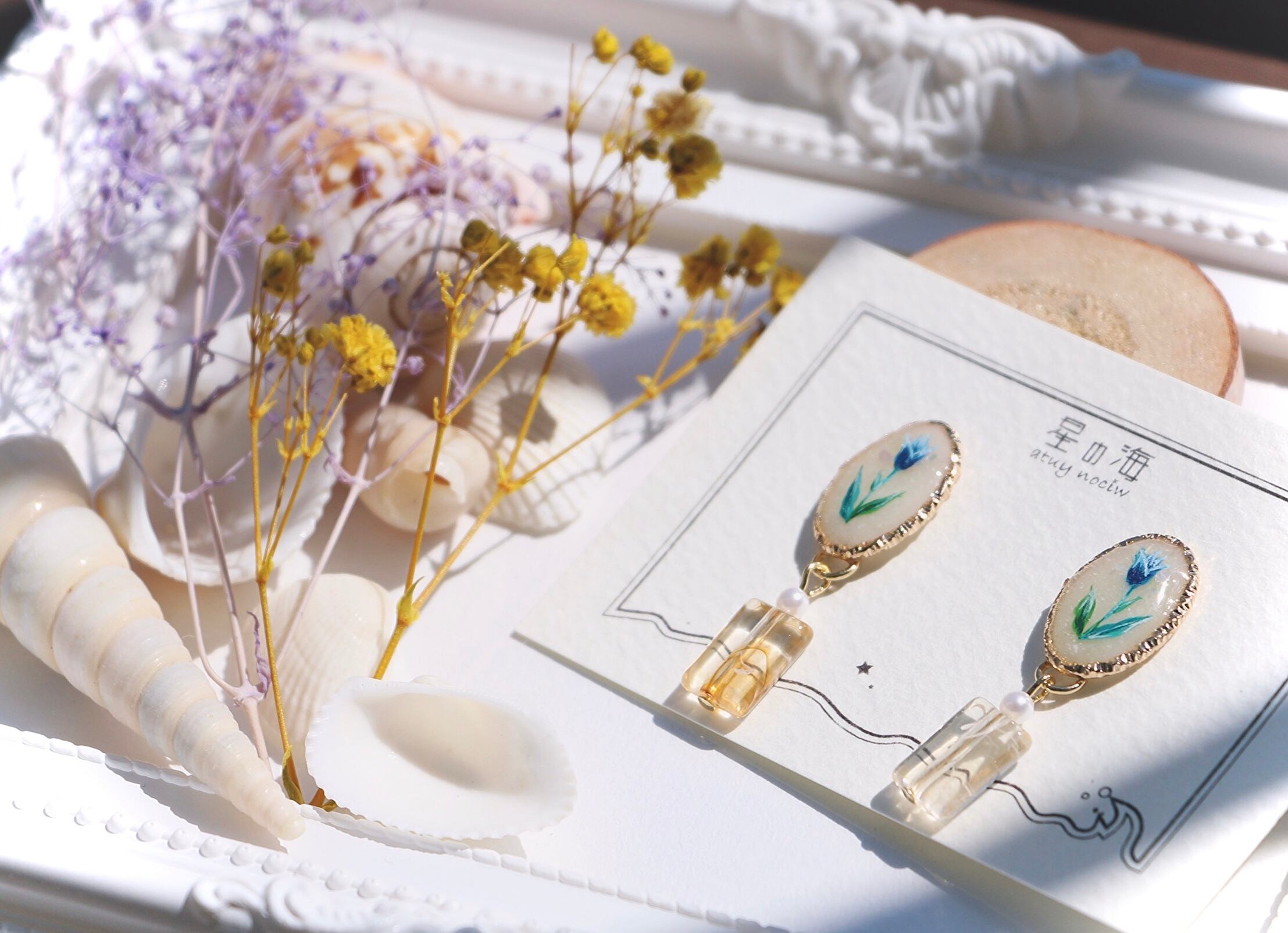 小ぶりな金パーツにチューリップと花の香りを表したシェル、パールとべっこうビーズでコロンを表現。