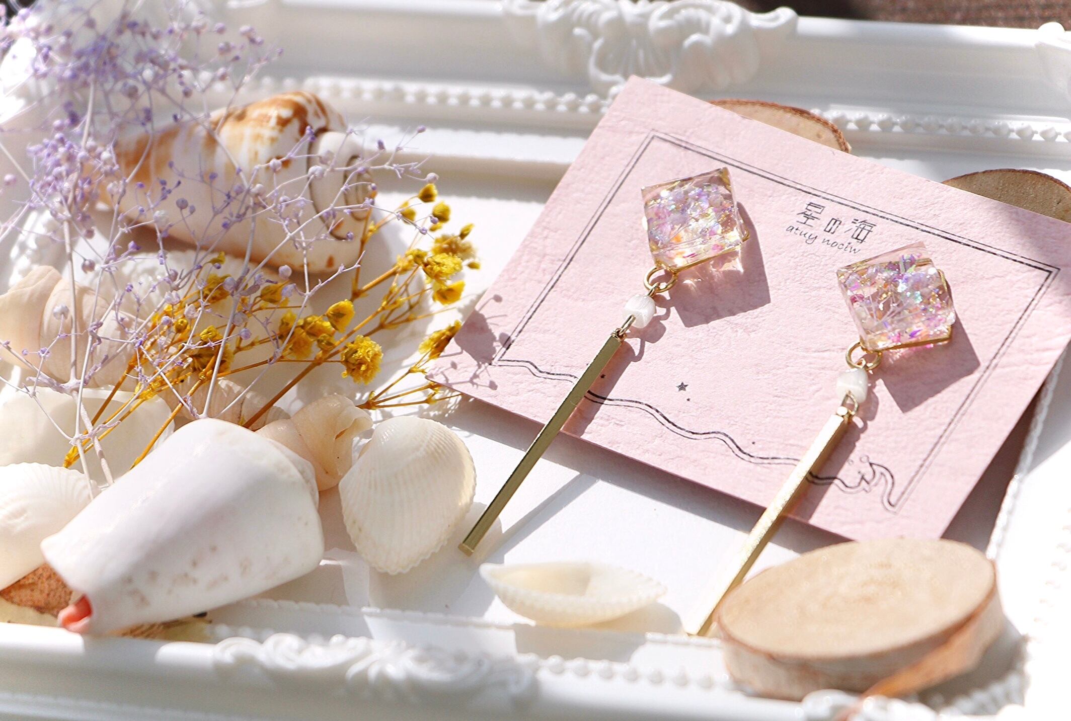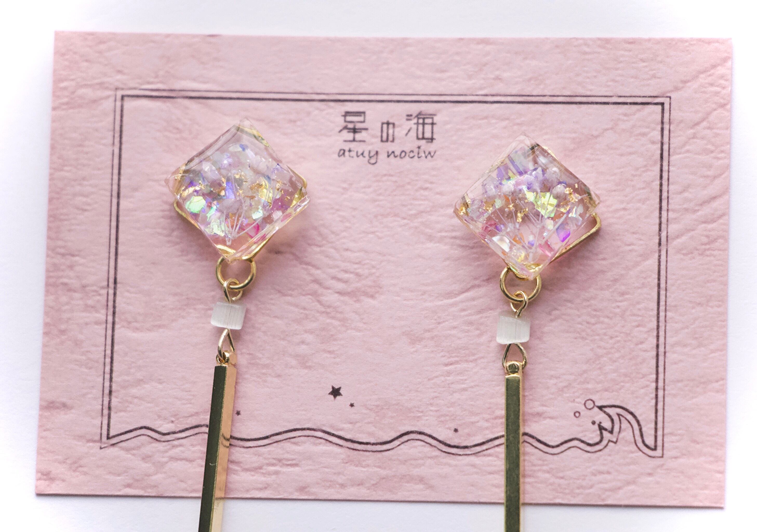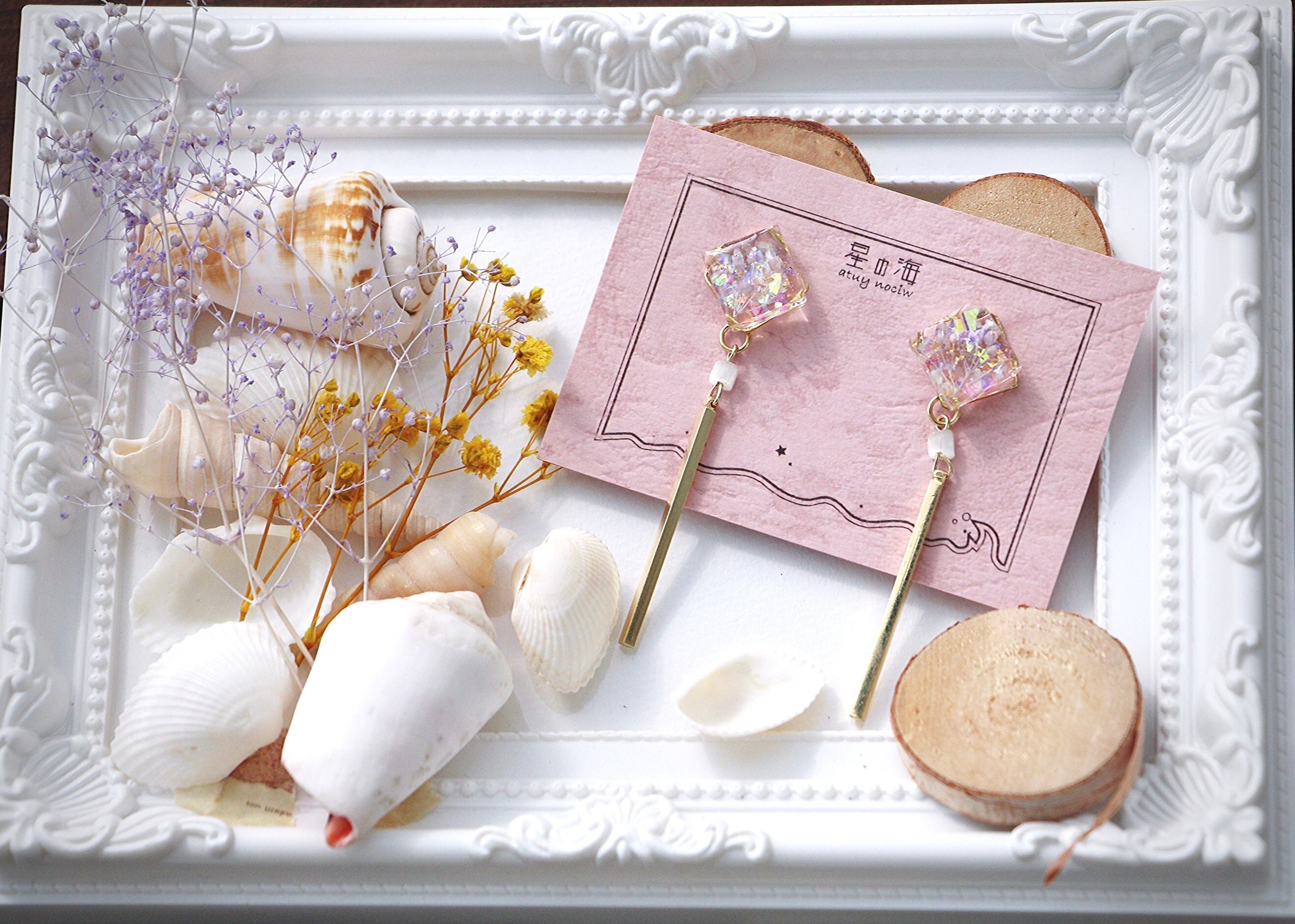お花に偏光フィルム、キャンディーのようなシェルに金箔。ずらしたスクエアのゴールドパーツが個性を引き出してくれます♡