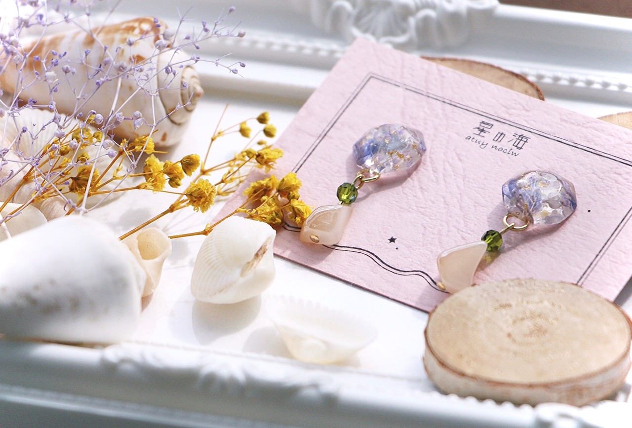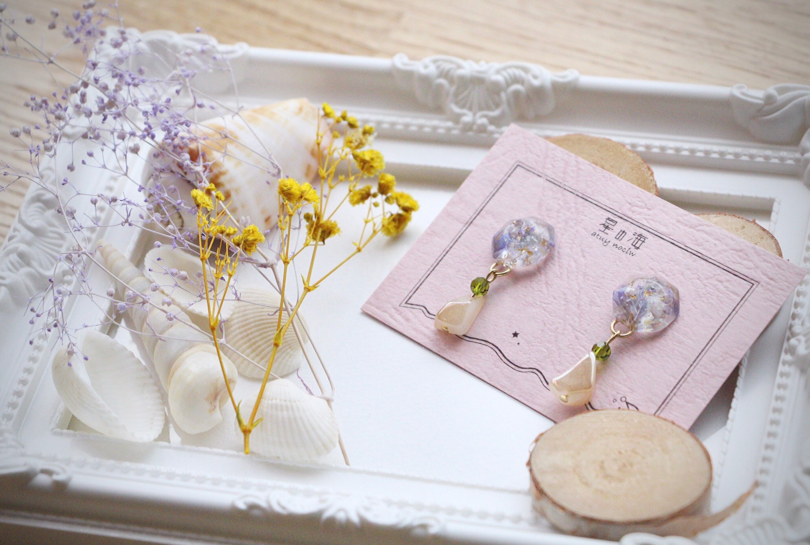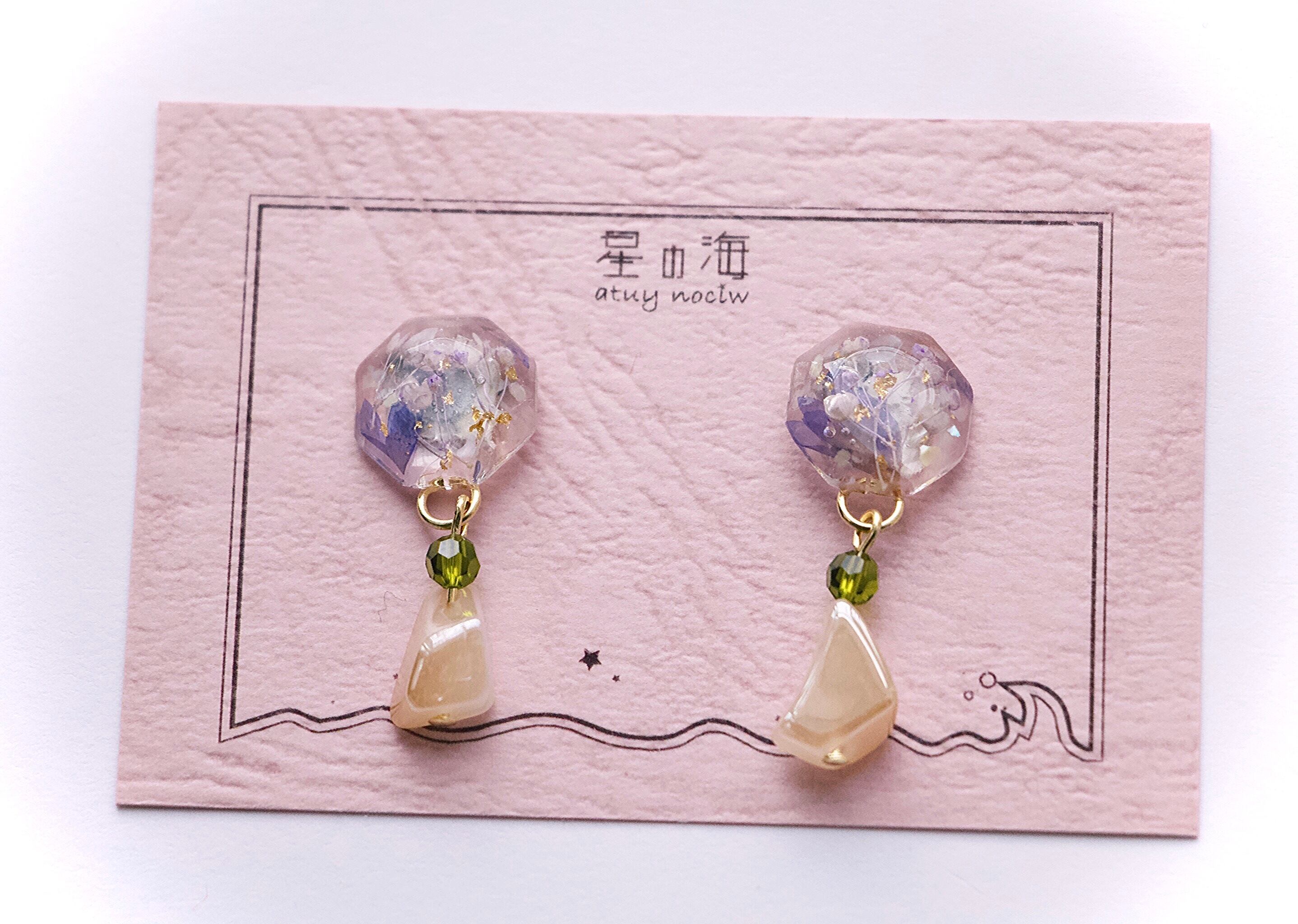 宝石の型に二種類の花にシェル、金箔、さざれビーズを落ち着いた彩りでまとめてみました。