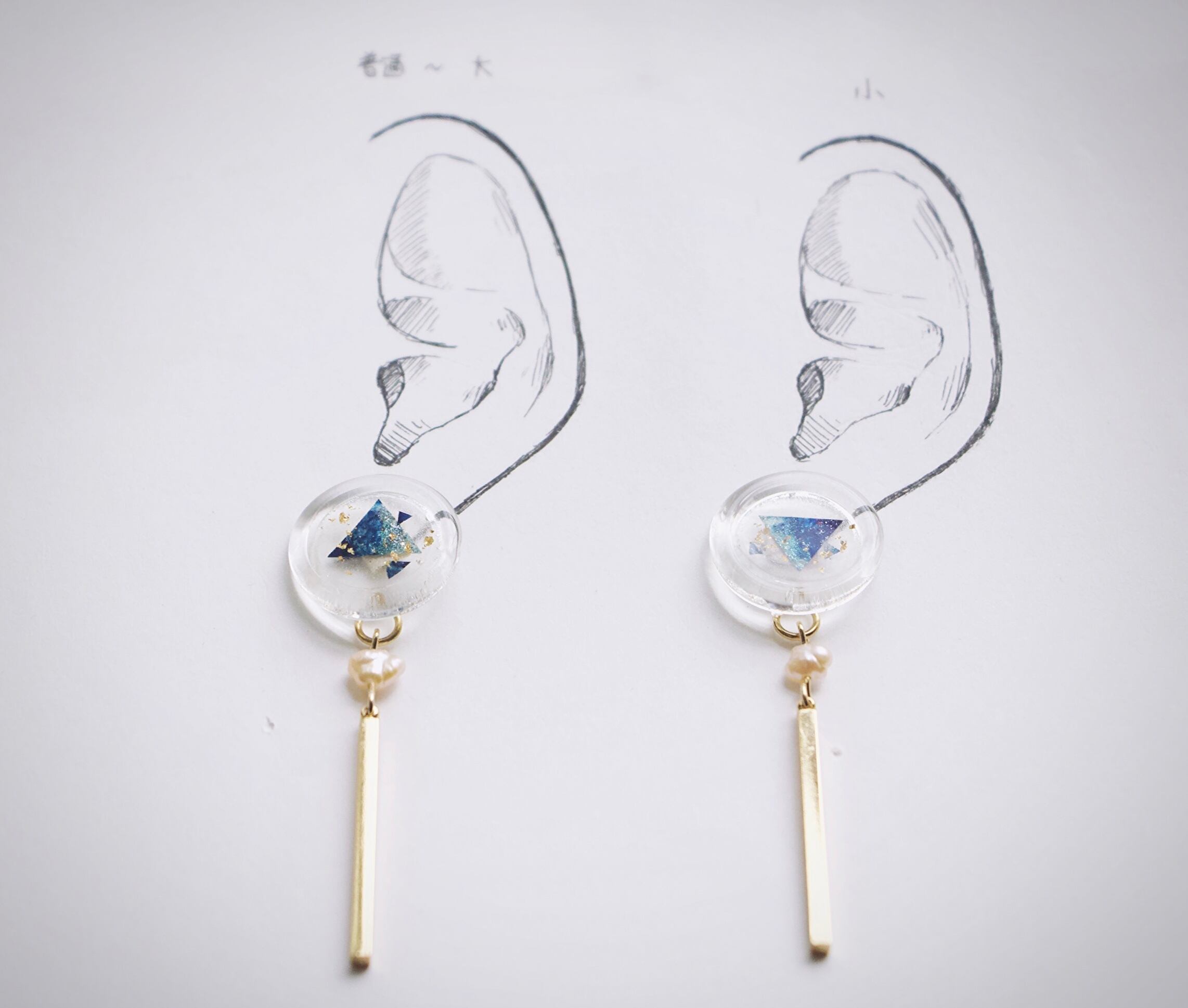 耳につけるパーツをつけていないため、台紙にはマスキングテープで留めている状態です。左は平均的な女性の普通〜大きめの耳、右は小さめの耳のモデルとなっております。ご参照ください。