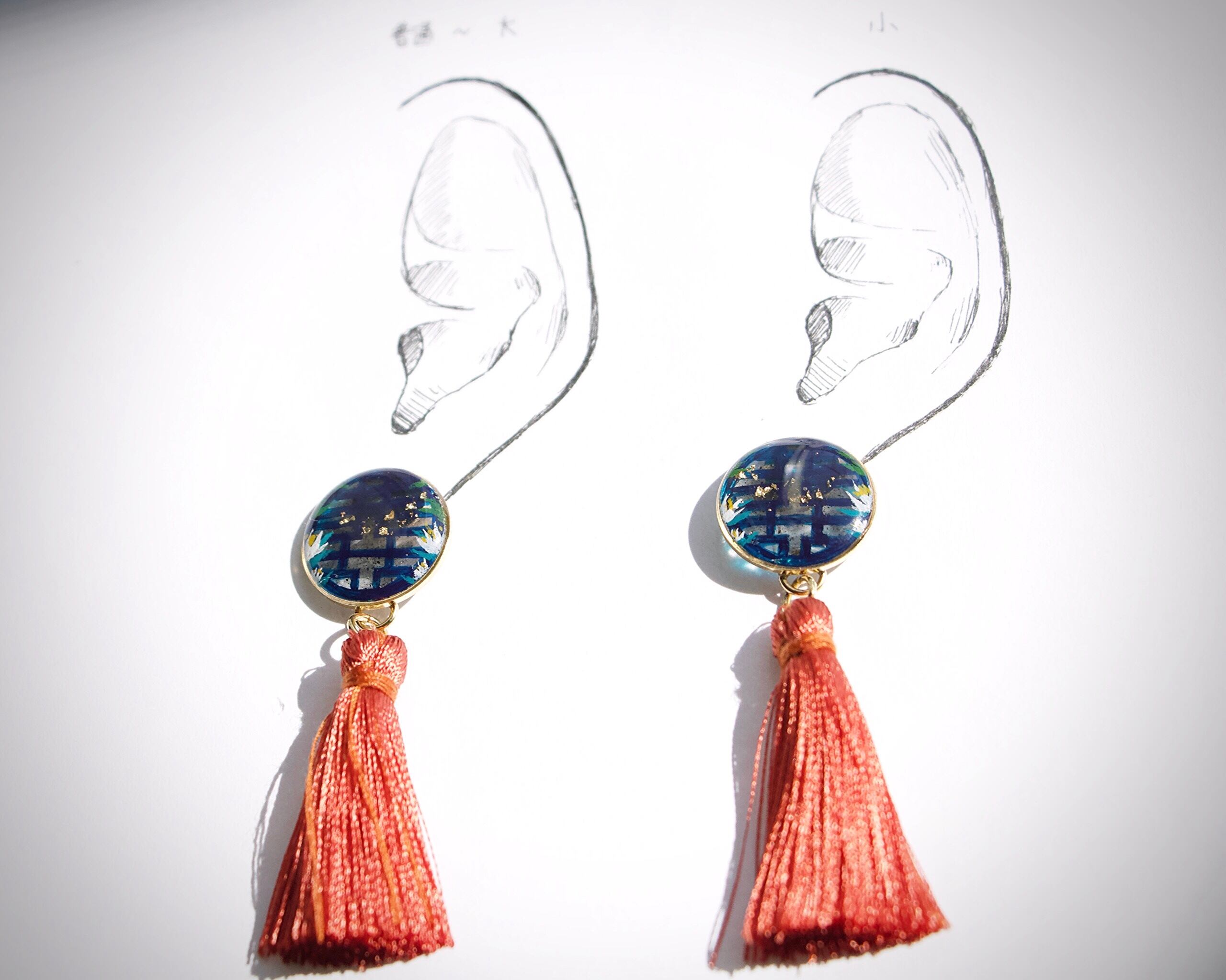 中華風で印象的な双喜紋と蓮のような花を手描きし、金箔が風が舞うようなイメージで作ってみました。