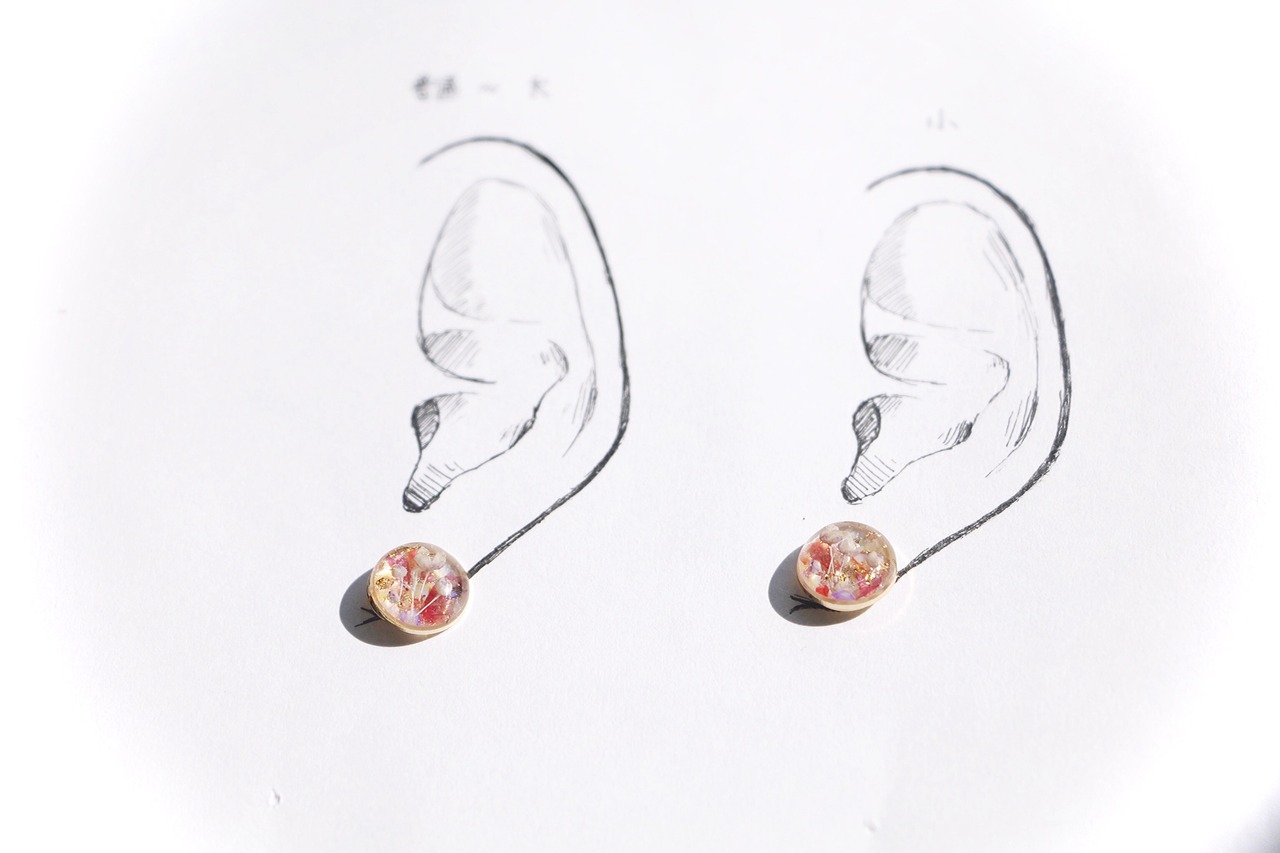 耳につけるパーツをつけていないため、台紙にはマスキングテープで留めている状態です。耳シートの写真ではピアスパーツを当てています。左が平均的な普通〜大きめの耳、右が小さめの耳になっています。ご参照ください。