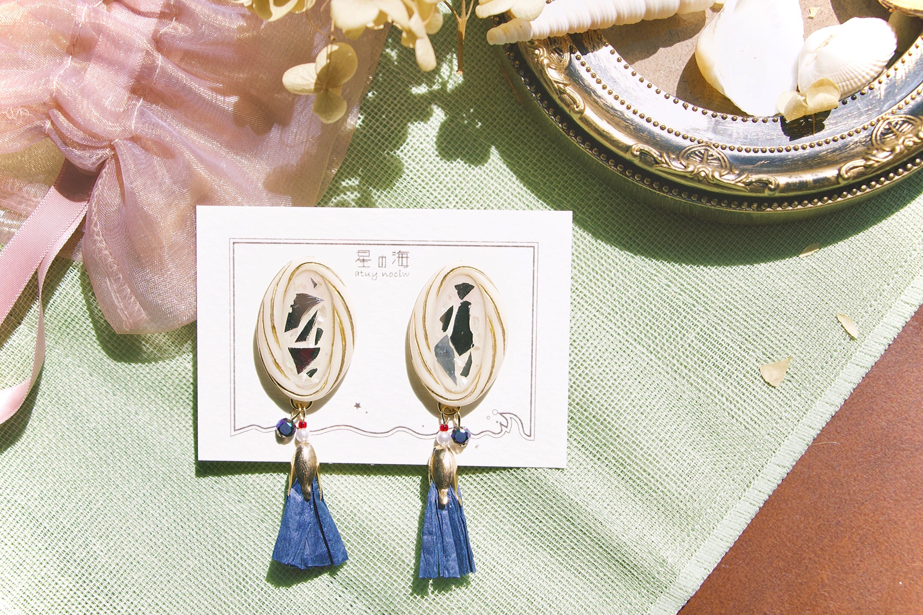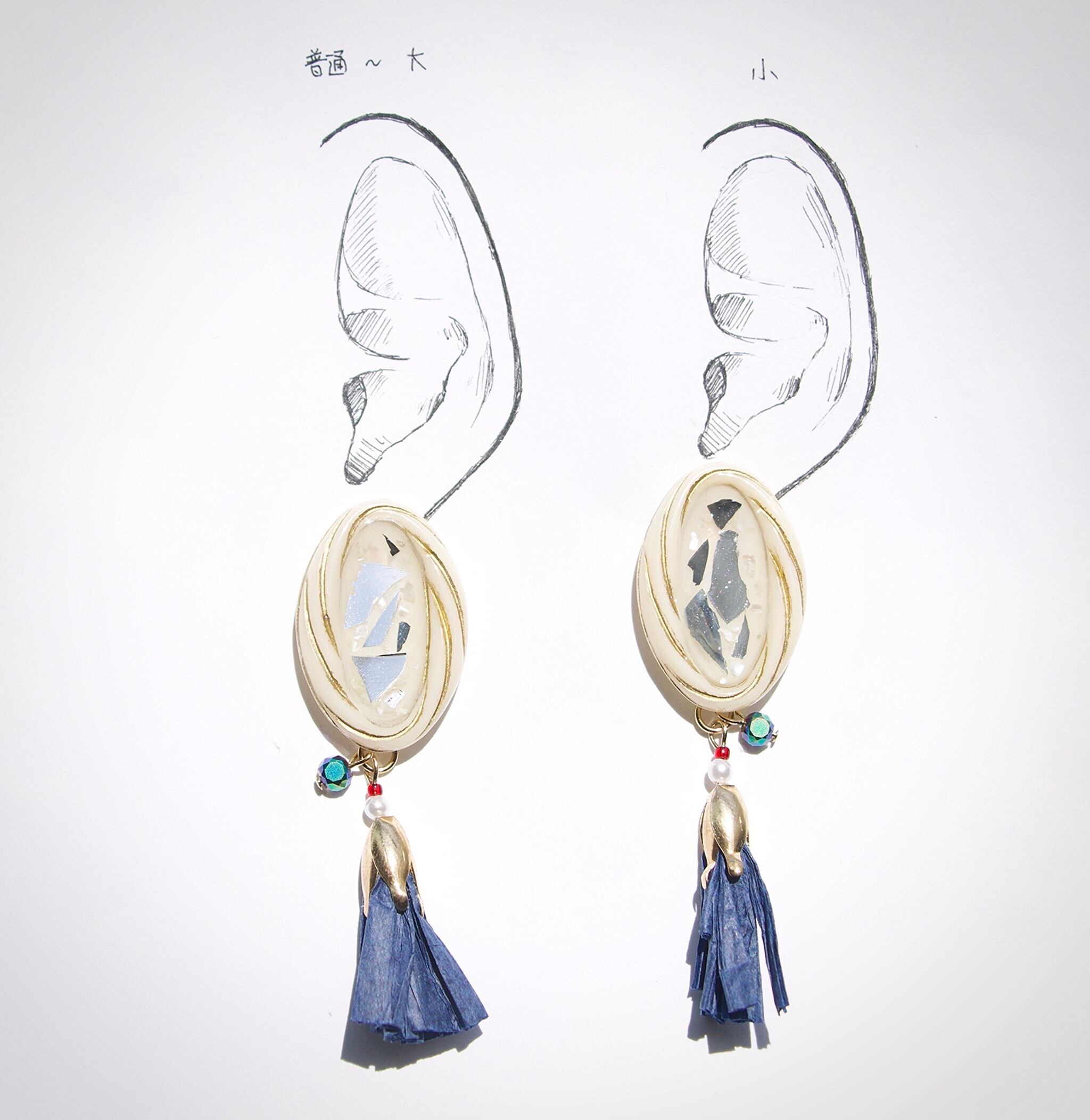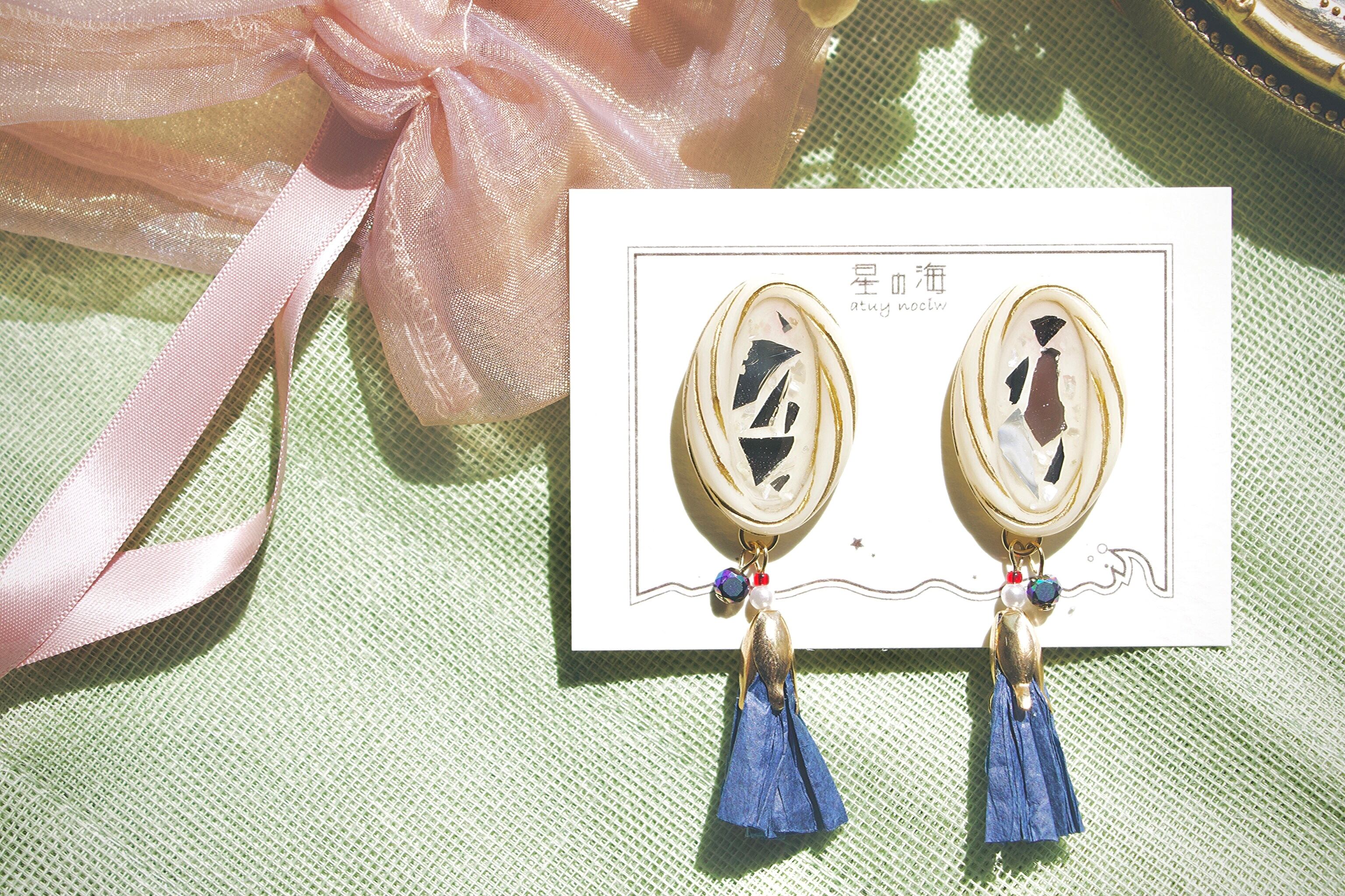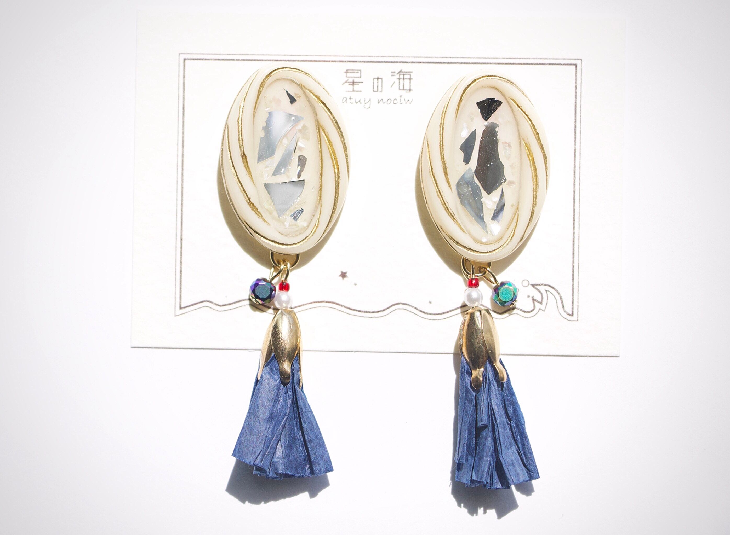 その美しさと儚さを散るシェルで表現し、赤い唇と白い肌をビーズとパールで。姫のドレスを表現したタッセルとゴールドパーツはゆらゆらと揺れます。