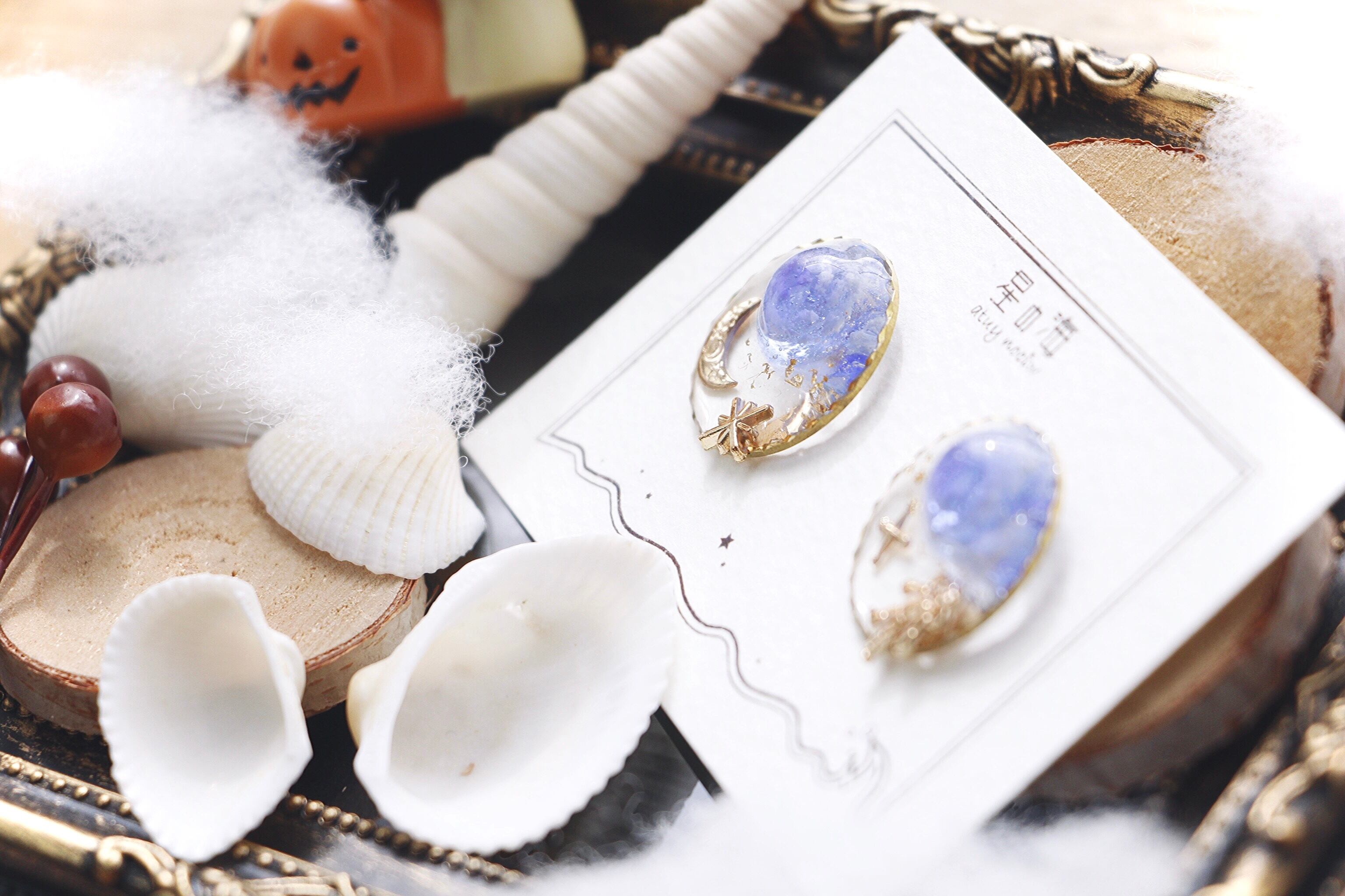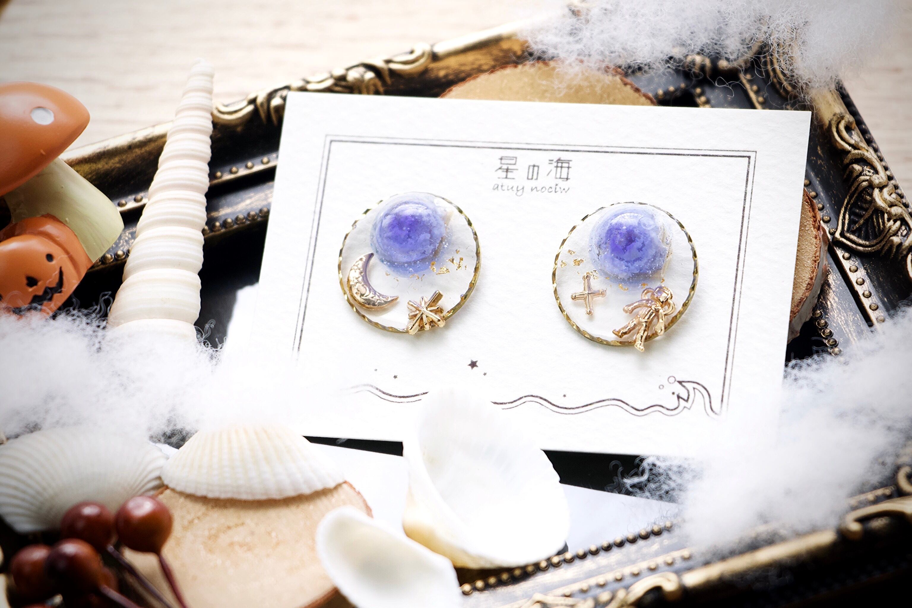 寒さが際立つ夕闇に包まれる時間帯の空の色を、天体のように閉じ込めました。周りには金箔の星雲と月や星の輝きに加え、宇宙飛行士も飛んでいます。