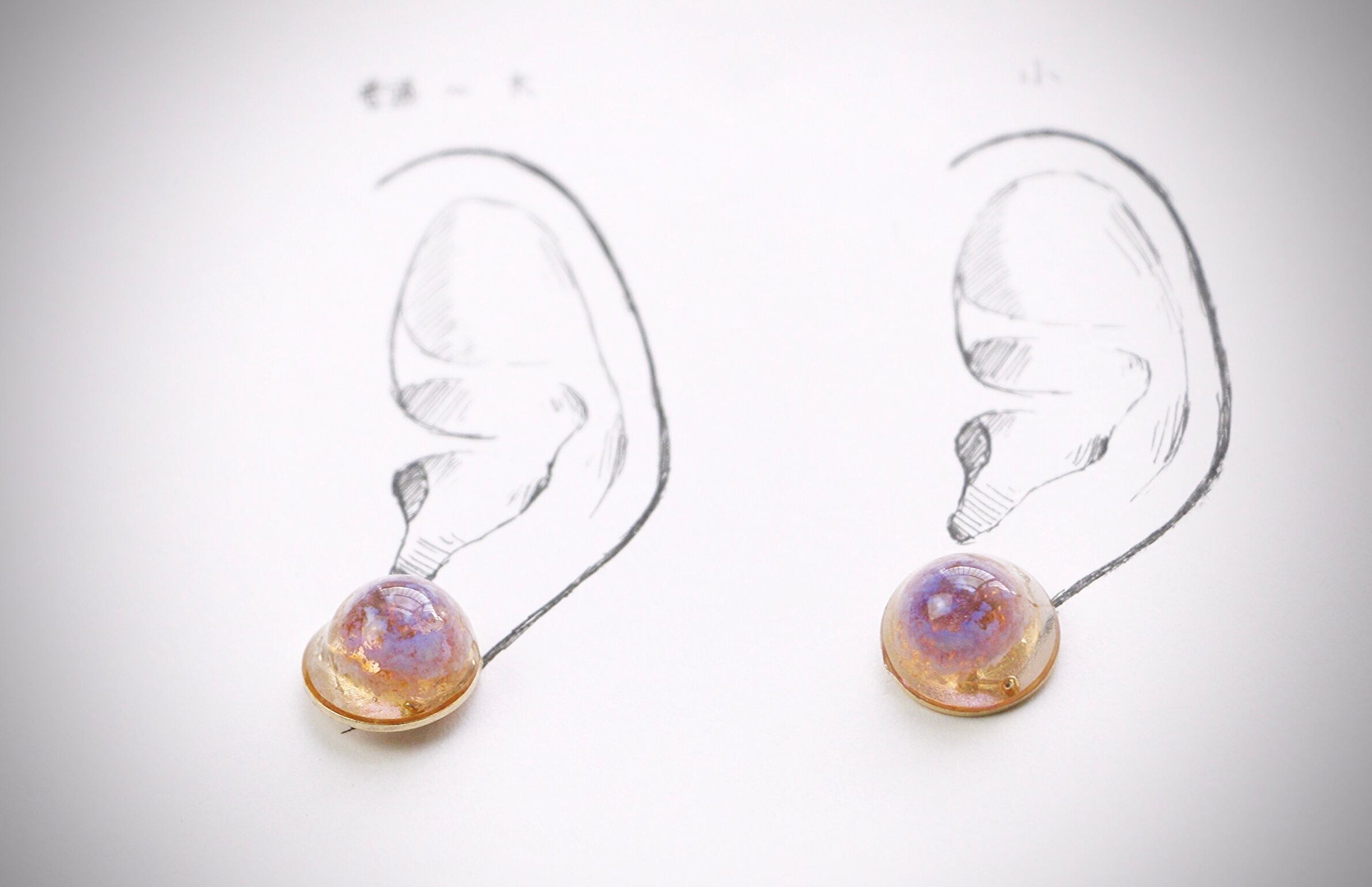 耳につけるパーツをつけていないため、台紙にはマスキングテープで留めている状態です。耳シートの写真ではピアスパーツを当てています。左が平均的な普通〜大きめの耳、右が小さめの耳になっています。ご参照ください。