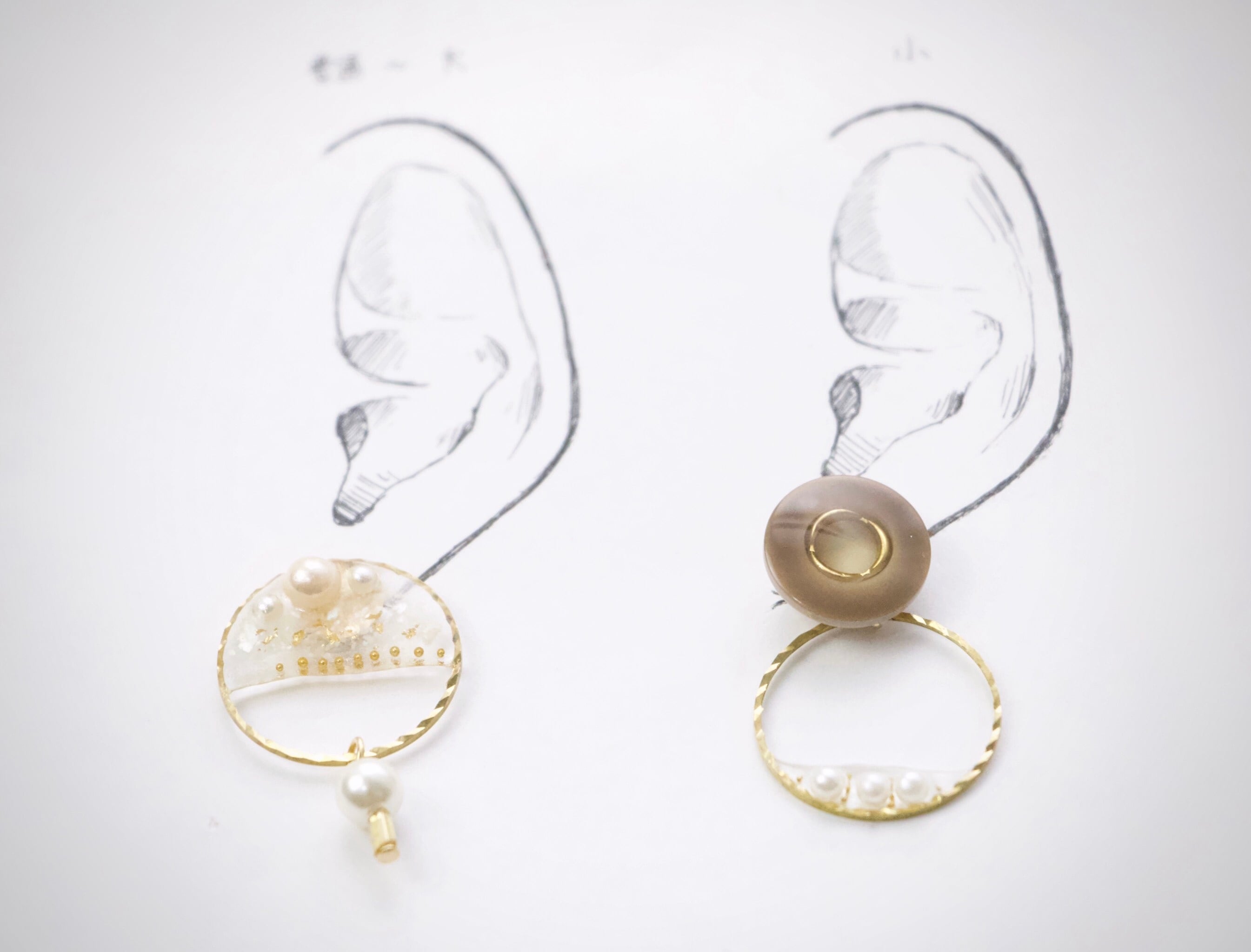 耳につけるパーツをつけていないため、台紙にはマスキングテープで留めている状態です。耳シートではピアスパーツを当てています。左は平均的な女性の普通〜大きめの耳、右は小さめの耳のモデルとなっております。ご参照ください。