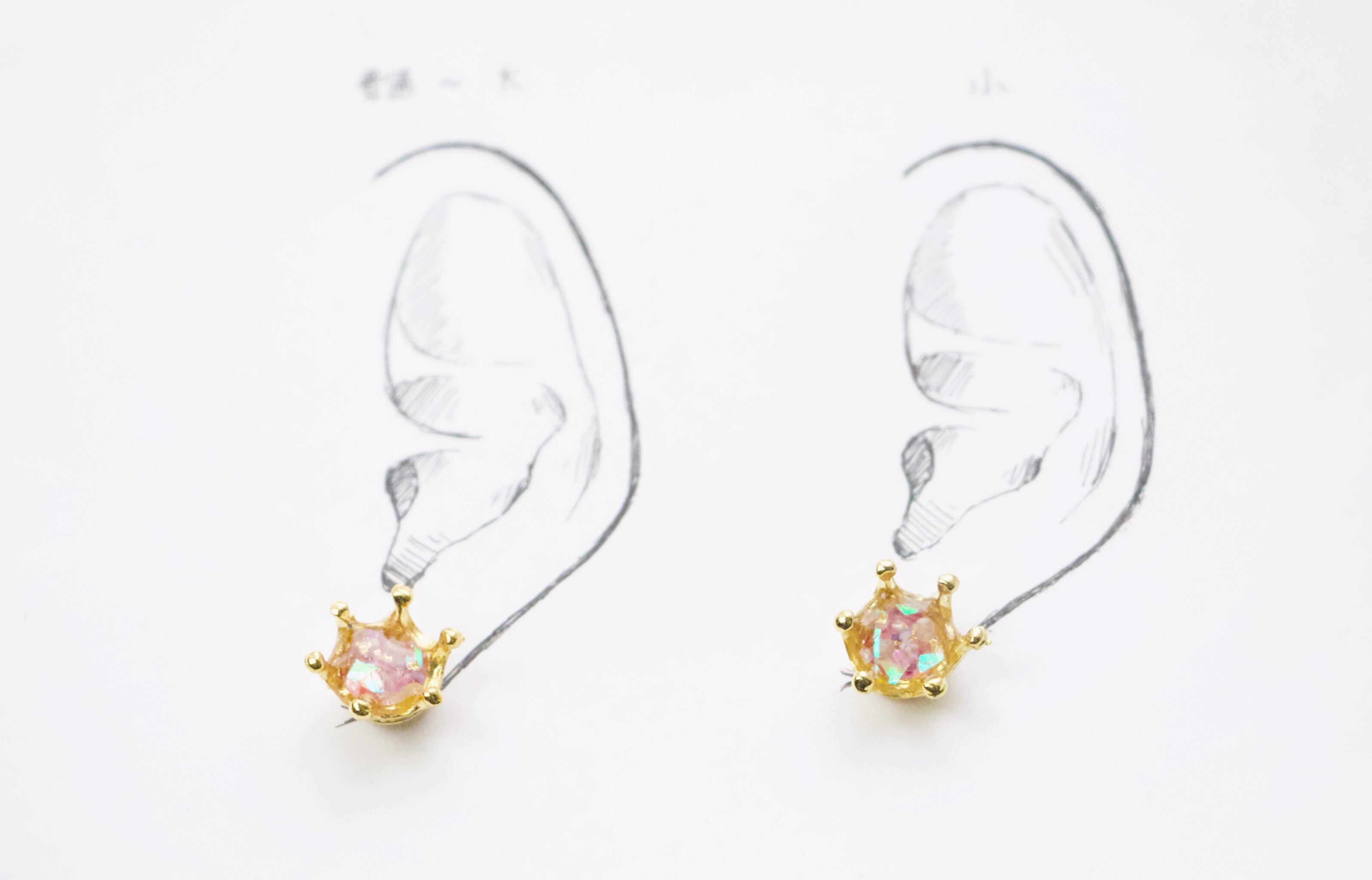 耳につけるパーツをつけていないため、台紙にはマスキングテープで留めている状態です。耳シートではピアスパーツを当てています。左は平均的な女性の普通〜大きめの耳、右は小さめの耳のモデルとなっております。ご参照ください。