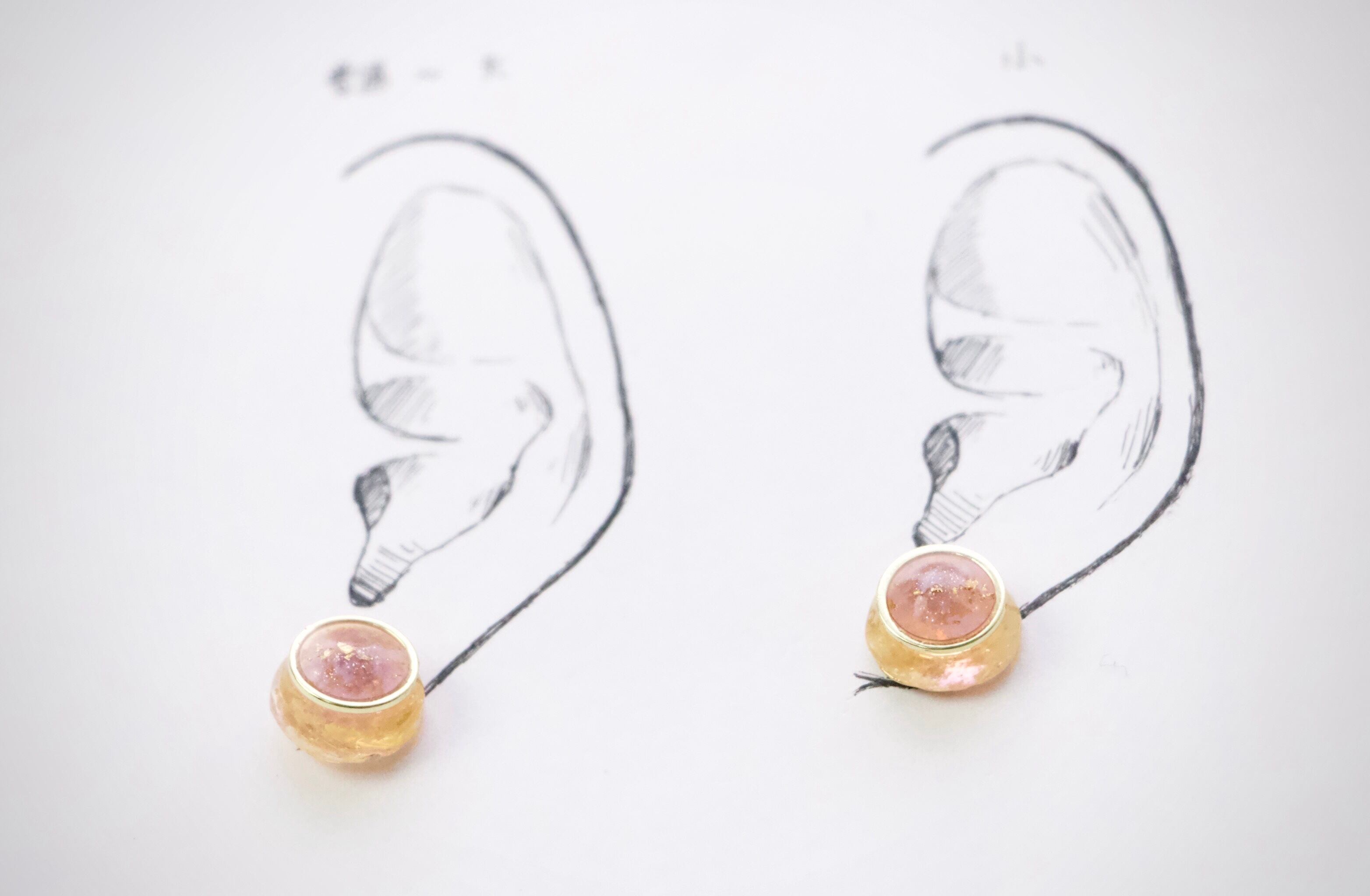 写真は耳につけるパーツをつけていないため、台紙にはマスキングテープで留めている状態です。耳シートではピアスパーツを当てています。左は平均的な女性の普通〜大きめの耳、右は小さめの耳のモデルとなっております。ご参照ください。
