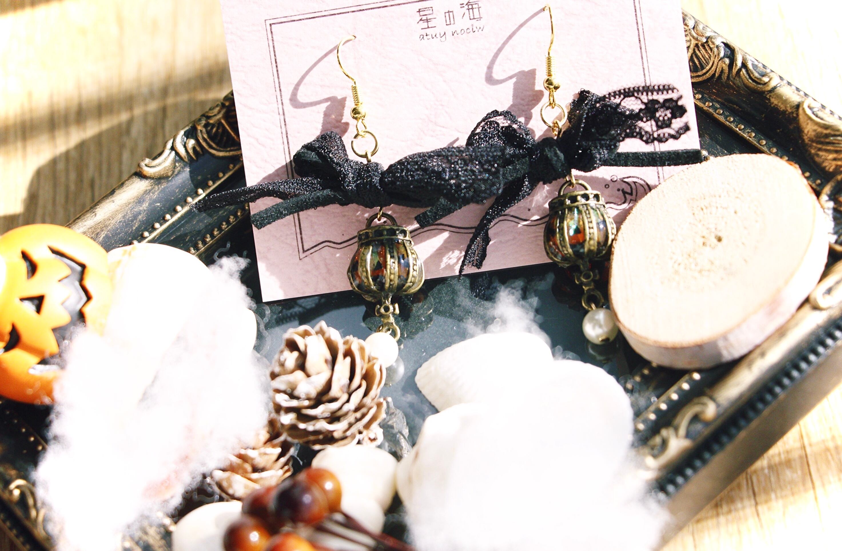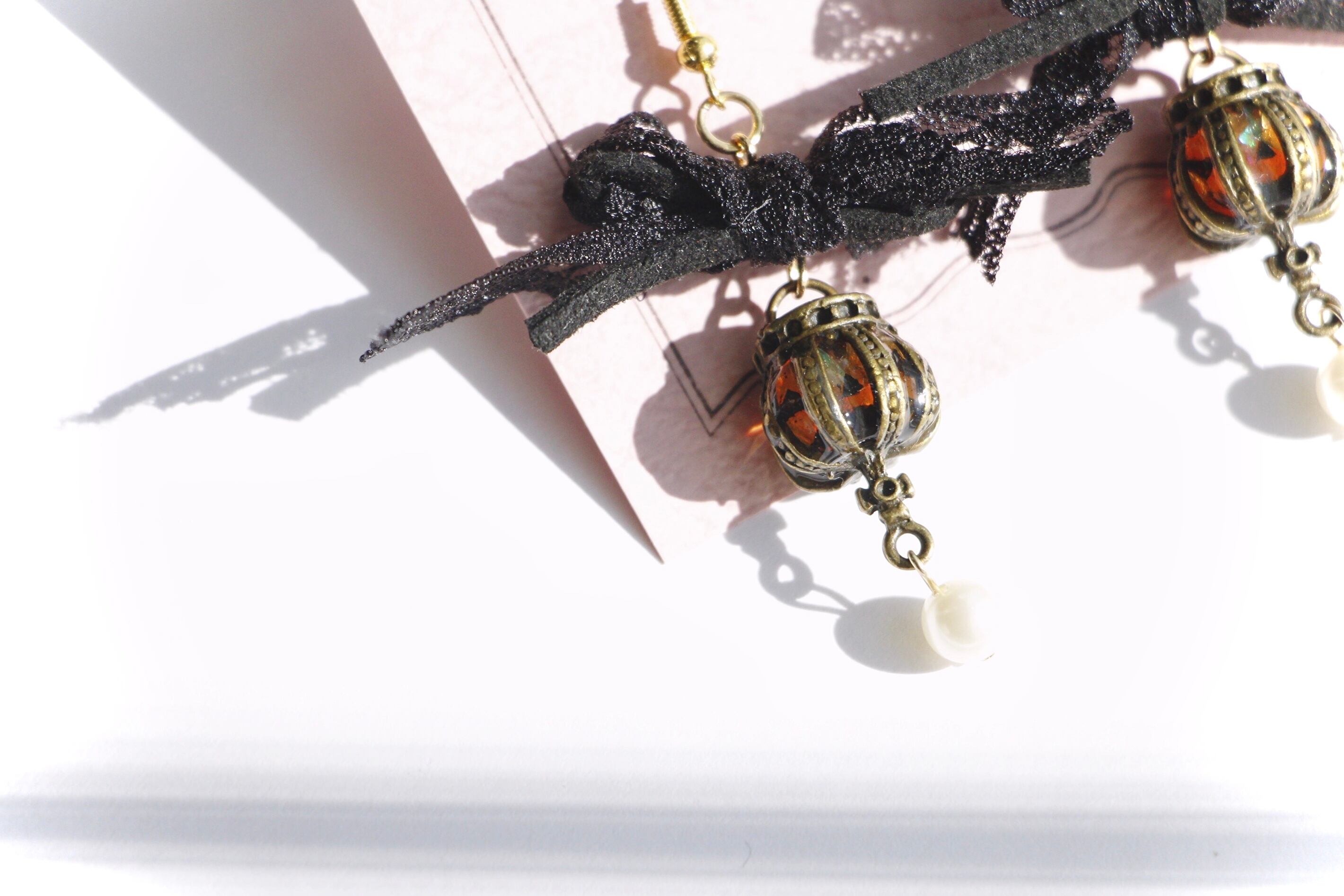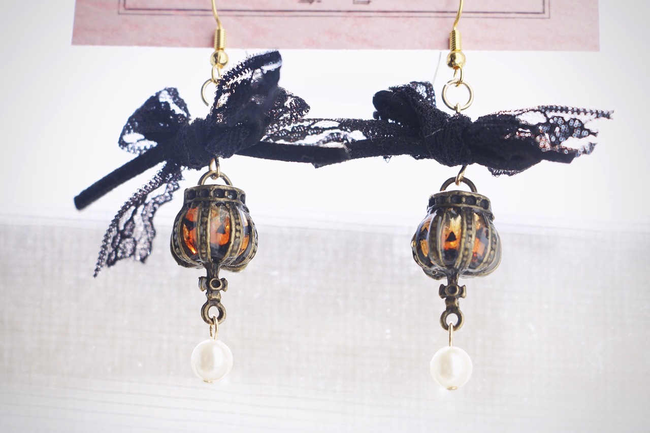 レースとフェイクスウェード紐のリボンから垂れるかぼちゃのランタン。十字架の下にはユラユラとパールが揺れています。