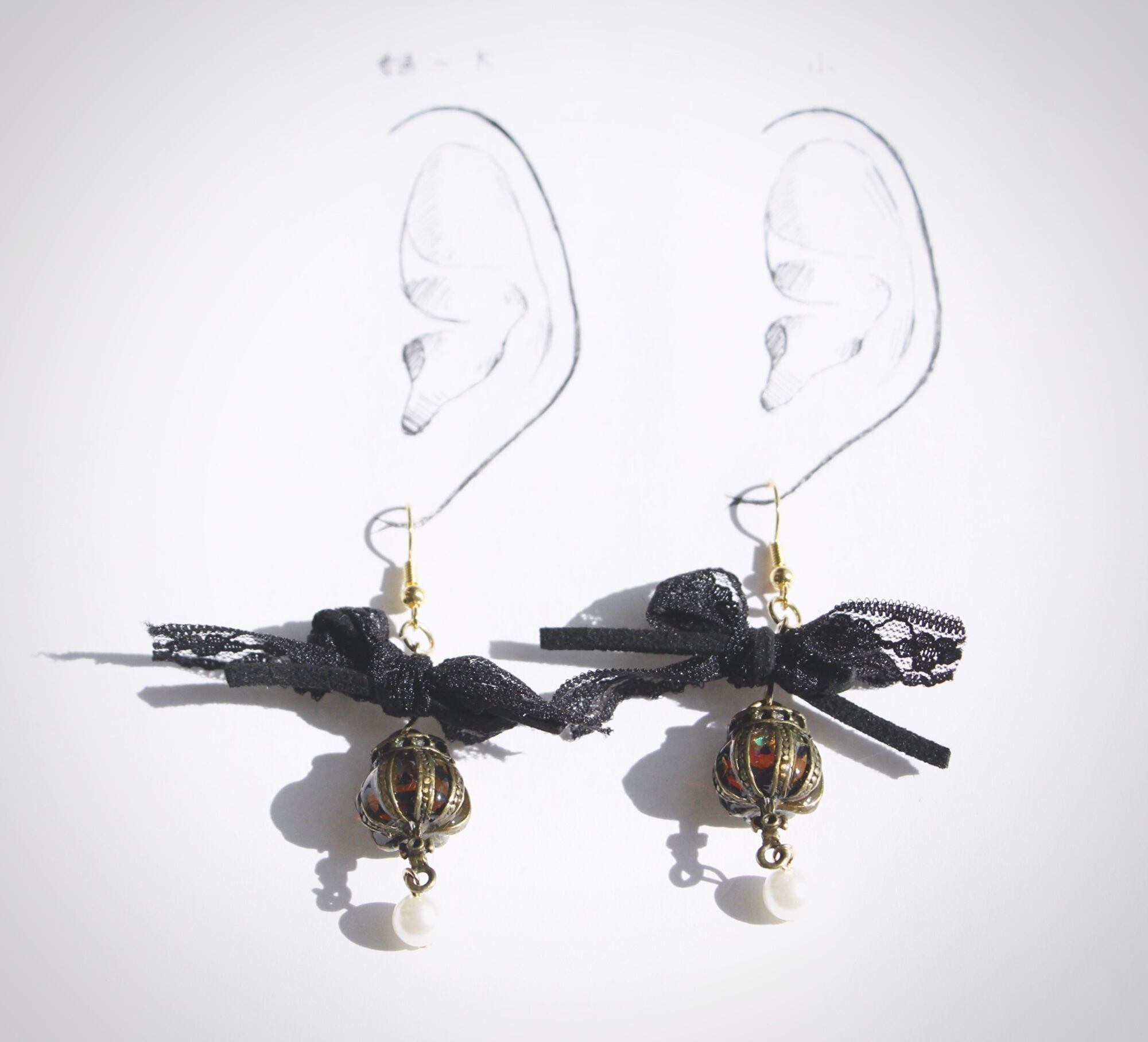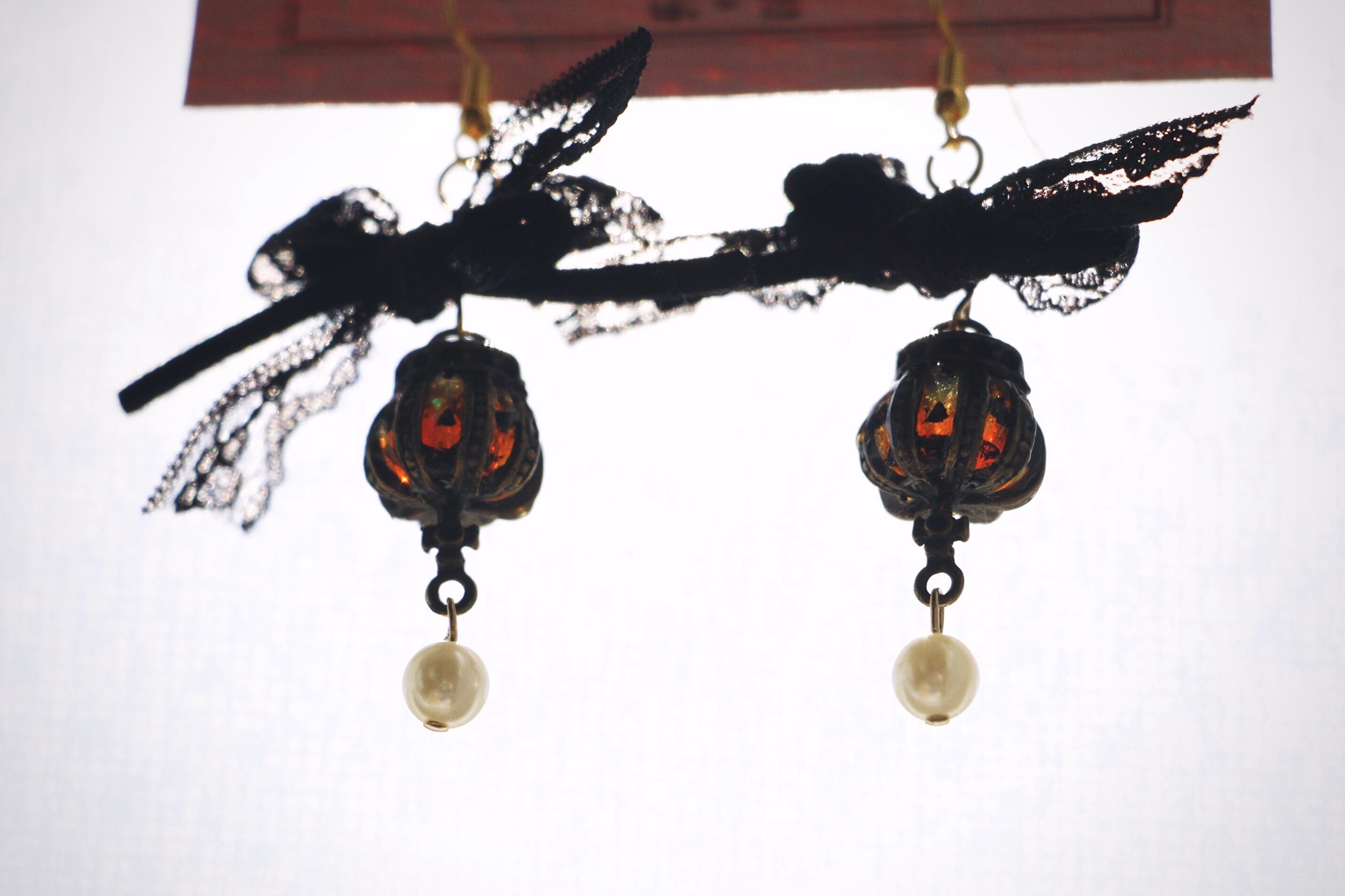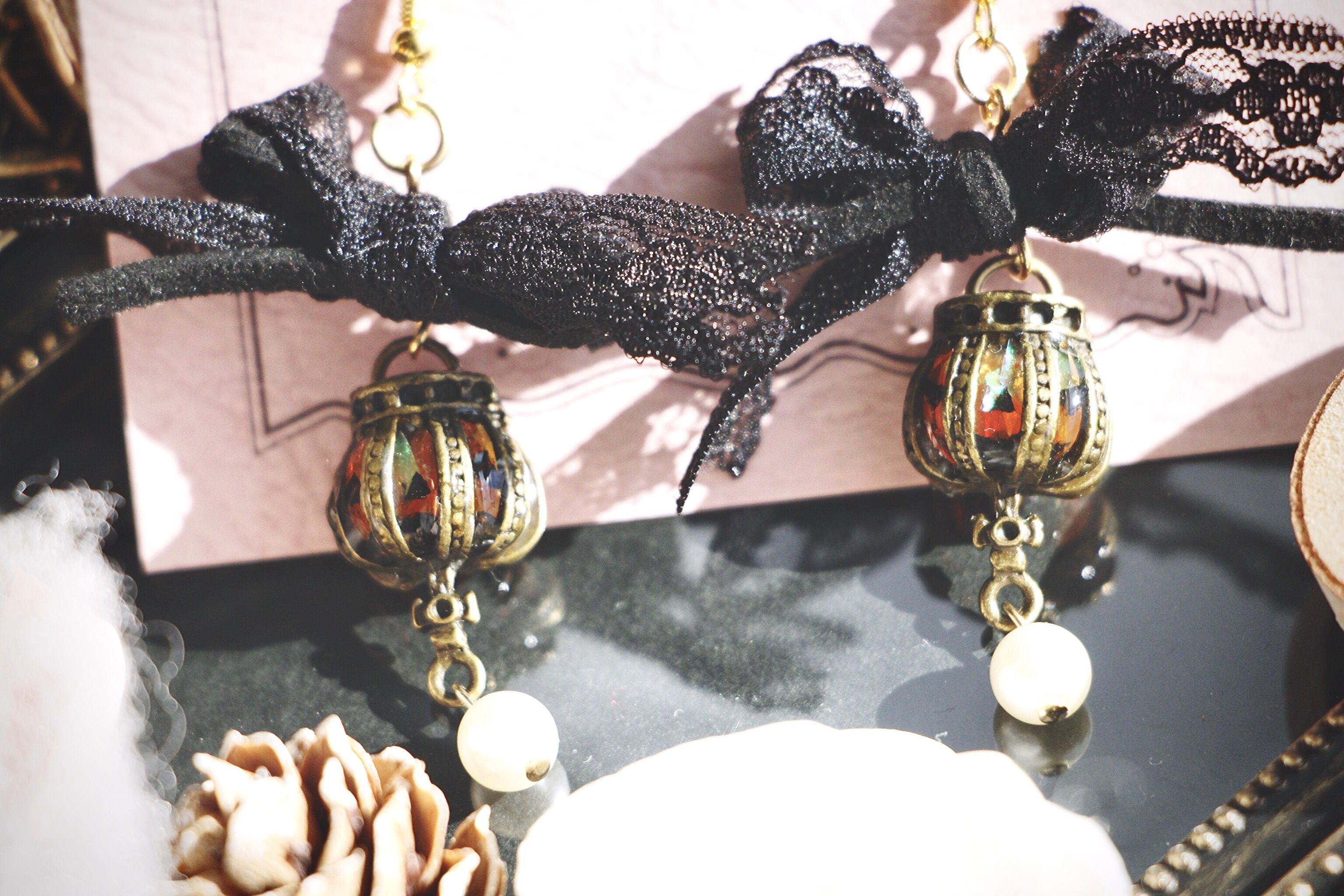 レースとフェイクスウェード紐のリボンから垂れるかぼちゃのランタン。十字架の下にはユラユラとパールが揺れています。