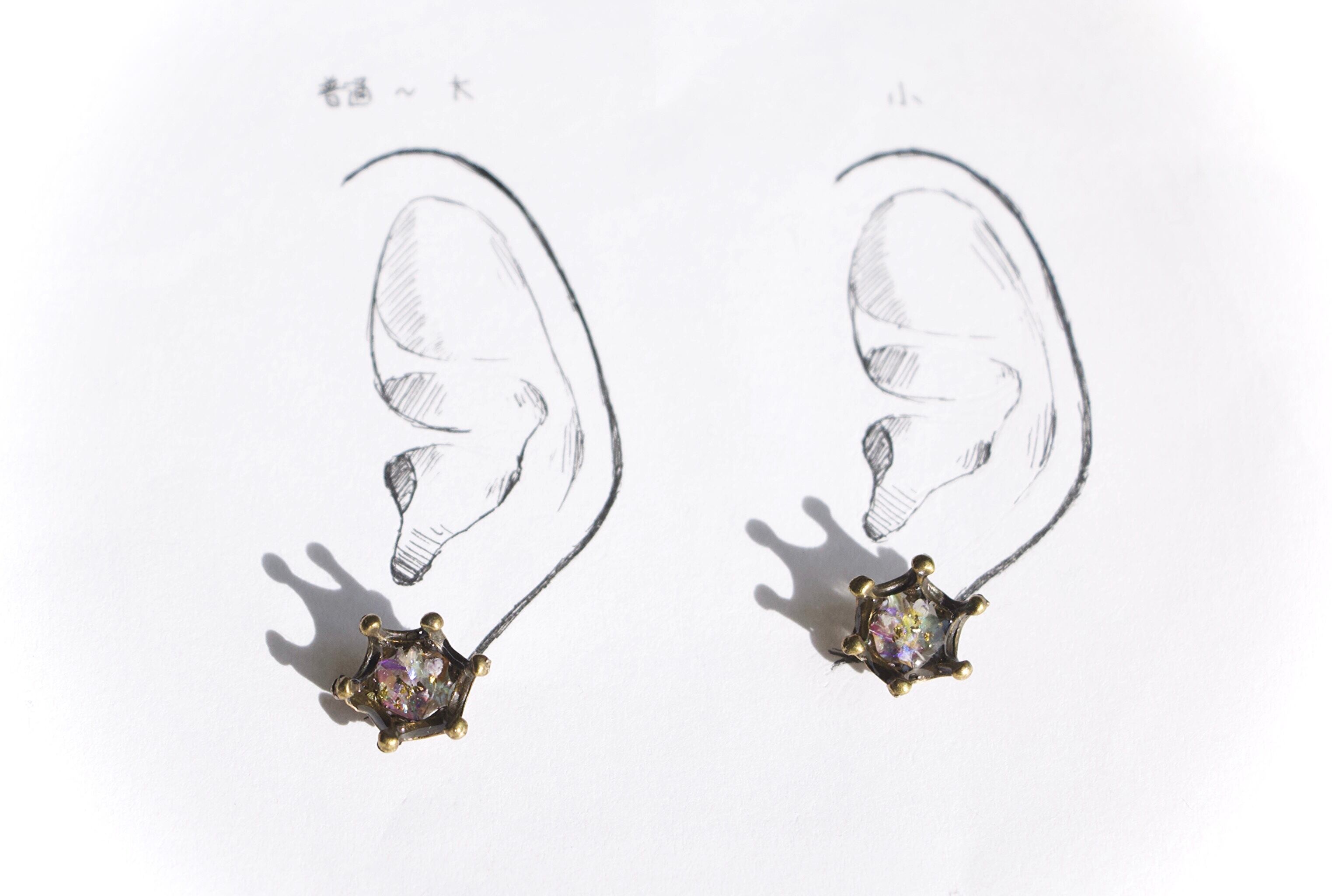 耳につけるパーツをつけていないため、台紙にはマスキングテープで留めている状態です。左は平均的な女性の普通〜大きめの耳、右は小さめの耳のモデルとなっております。ご参照ください。