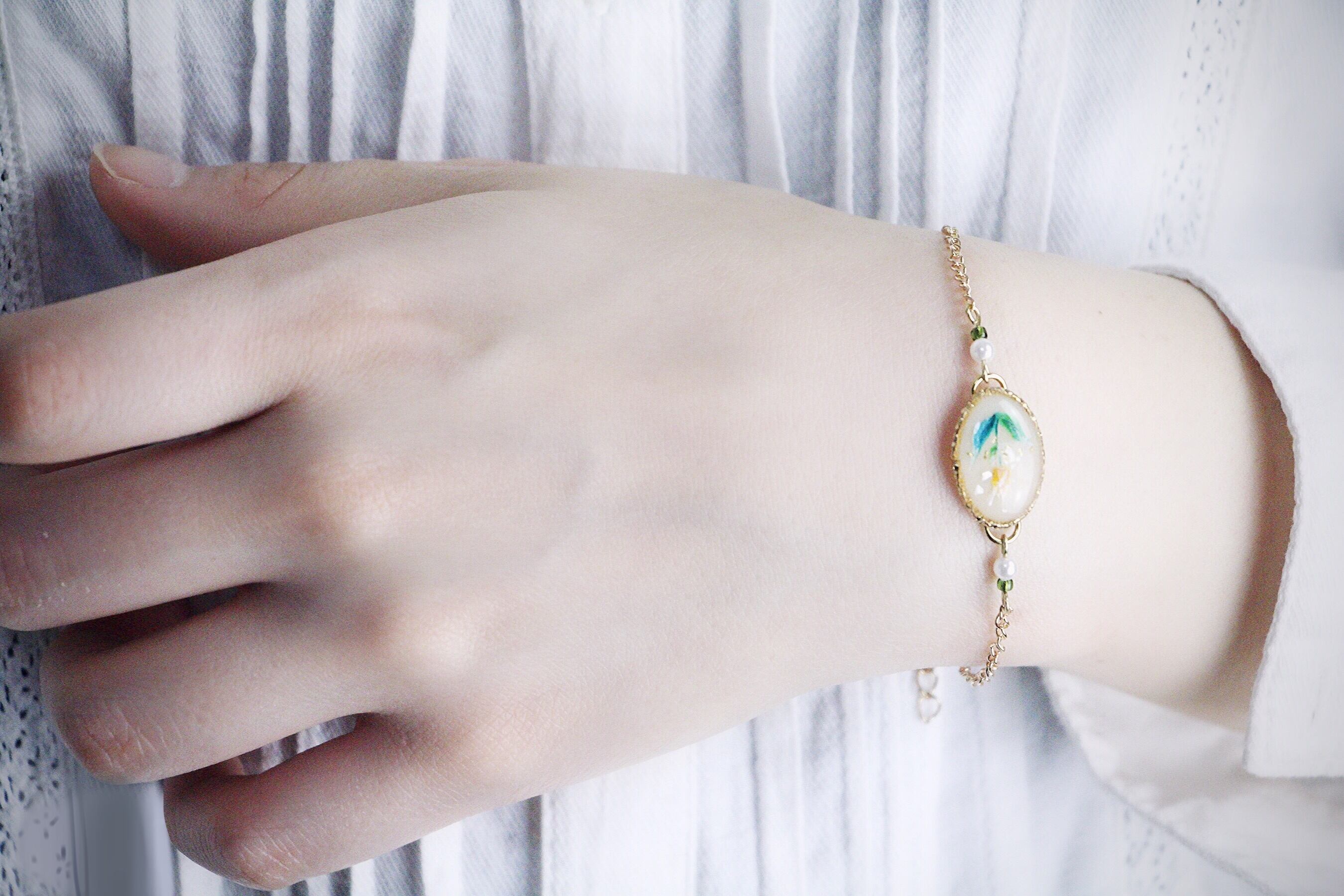 トップ部分には手描きのチューリップと花の周りを散るシェル、薄い金箔のラインを。チェーンには小さなパールとモスグリーンのビーズをあしらっています。