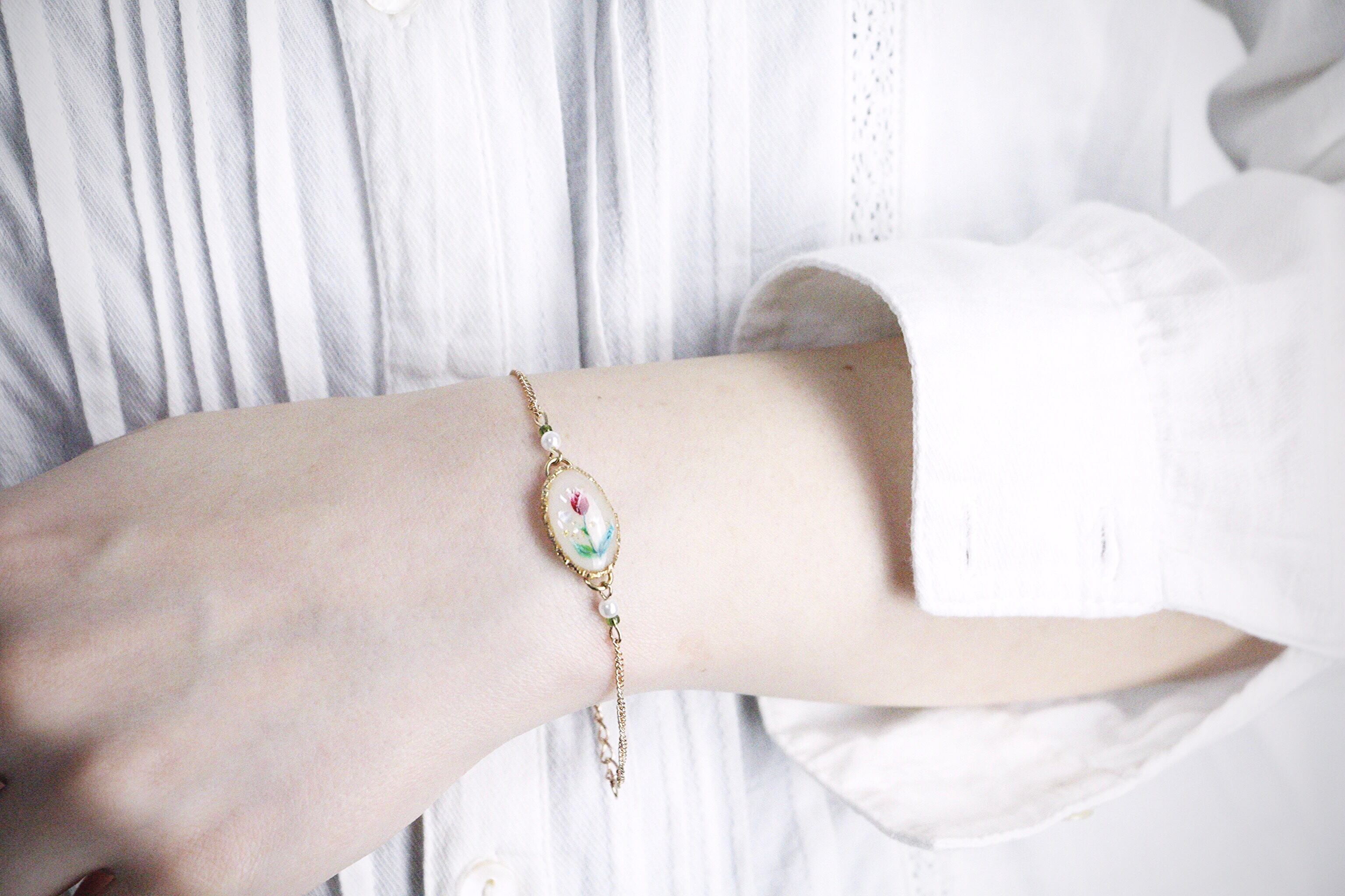 トップ部分には手描きのチューリップと花の周りを散るシェル、薄い金箔のラインを。チェーンには小さなパールとモスグリーンのビーズをあしらっています。