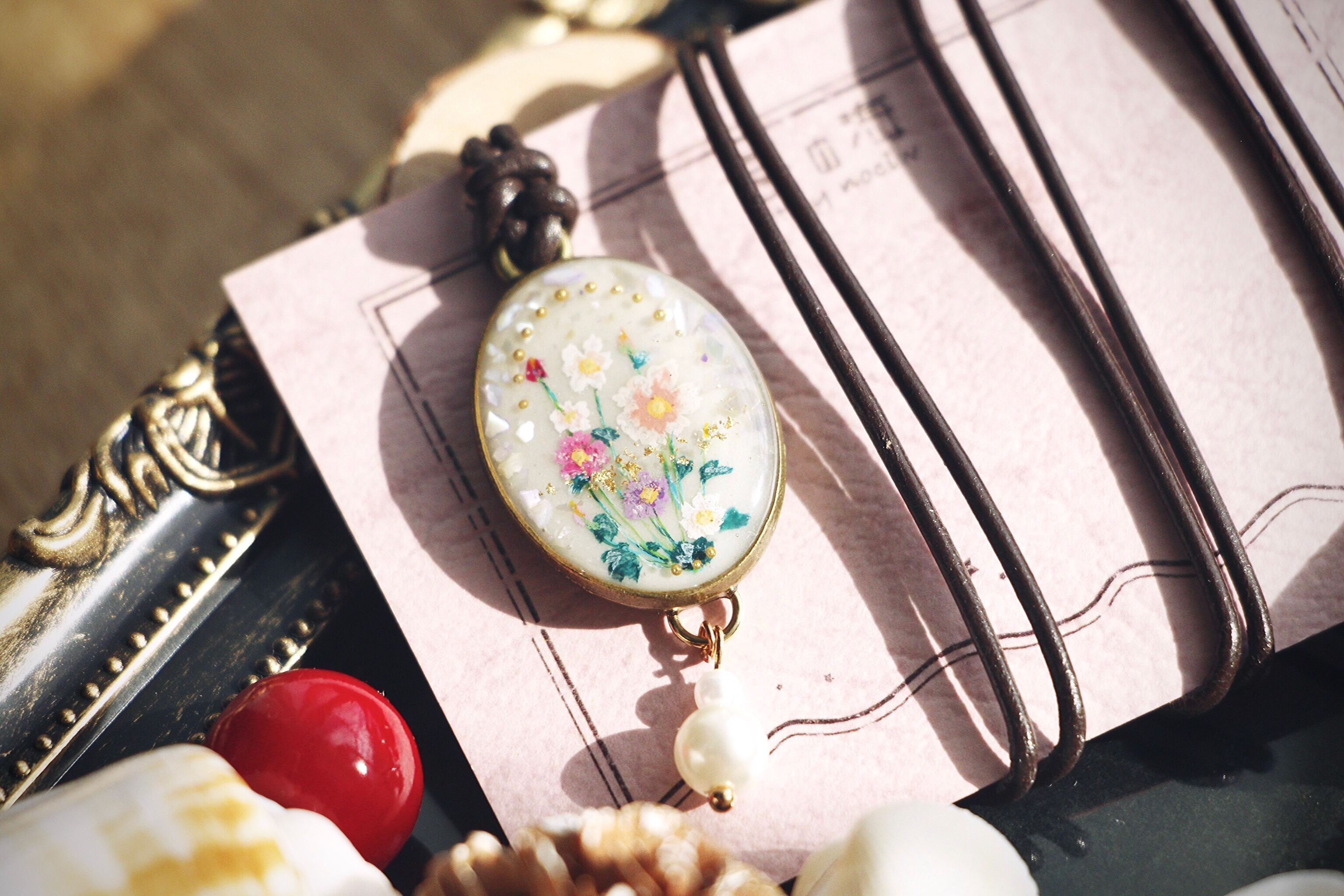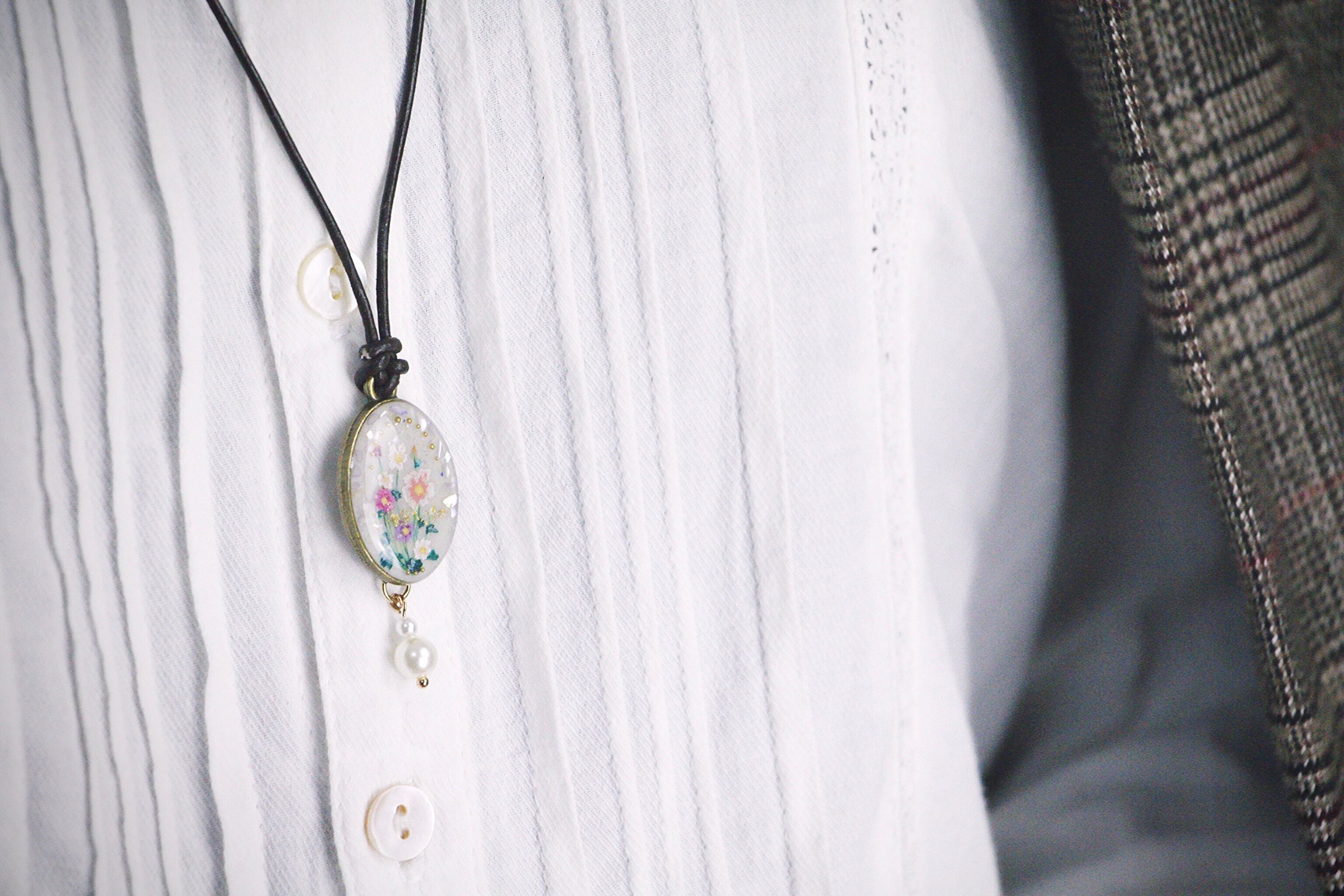 ペンダントトップには淡い白背景に手描きの花を添え、周りをパープルとホワイトのシェルとビリオンで囲い金箔のラインを引きました。