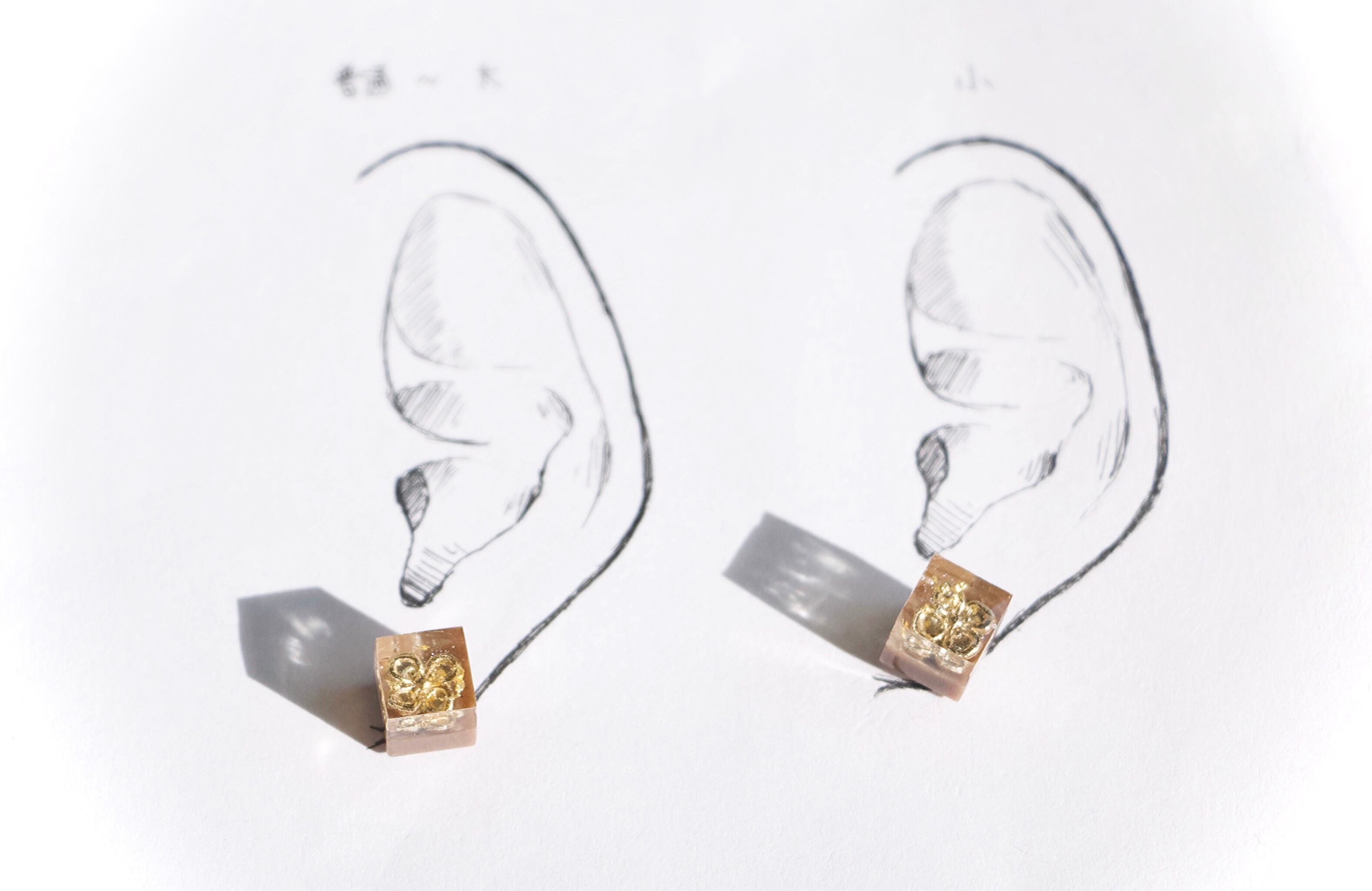 耳につけるパーツをつけていないため、台紙にはマスキングテープで留めている状態です。左は平均的な女性の普通〜大きめの耳、右は小さめの耳のモデルとなっております。ご参照ください。