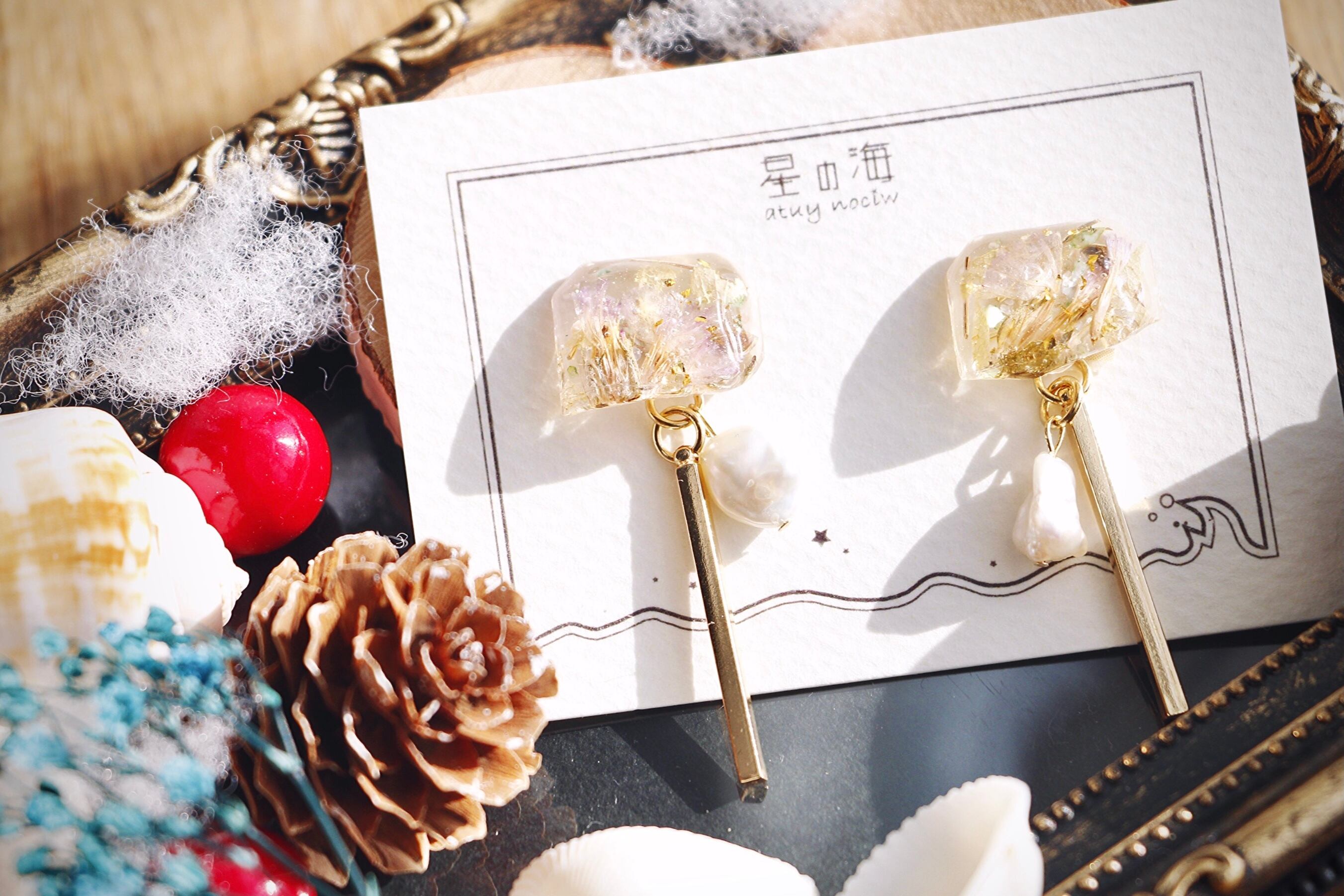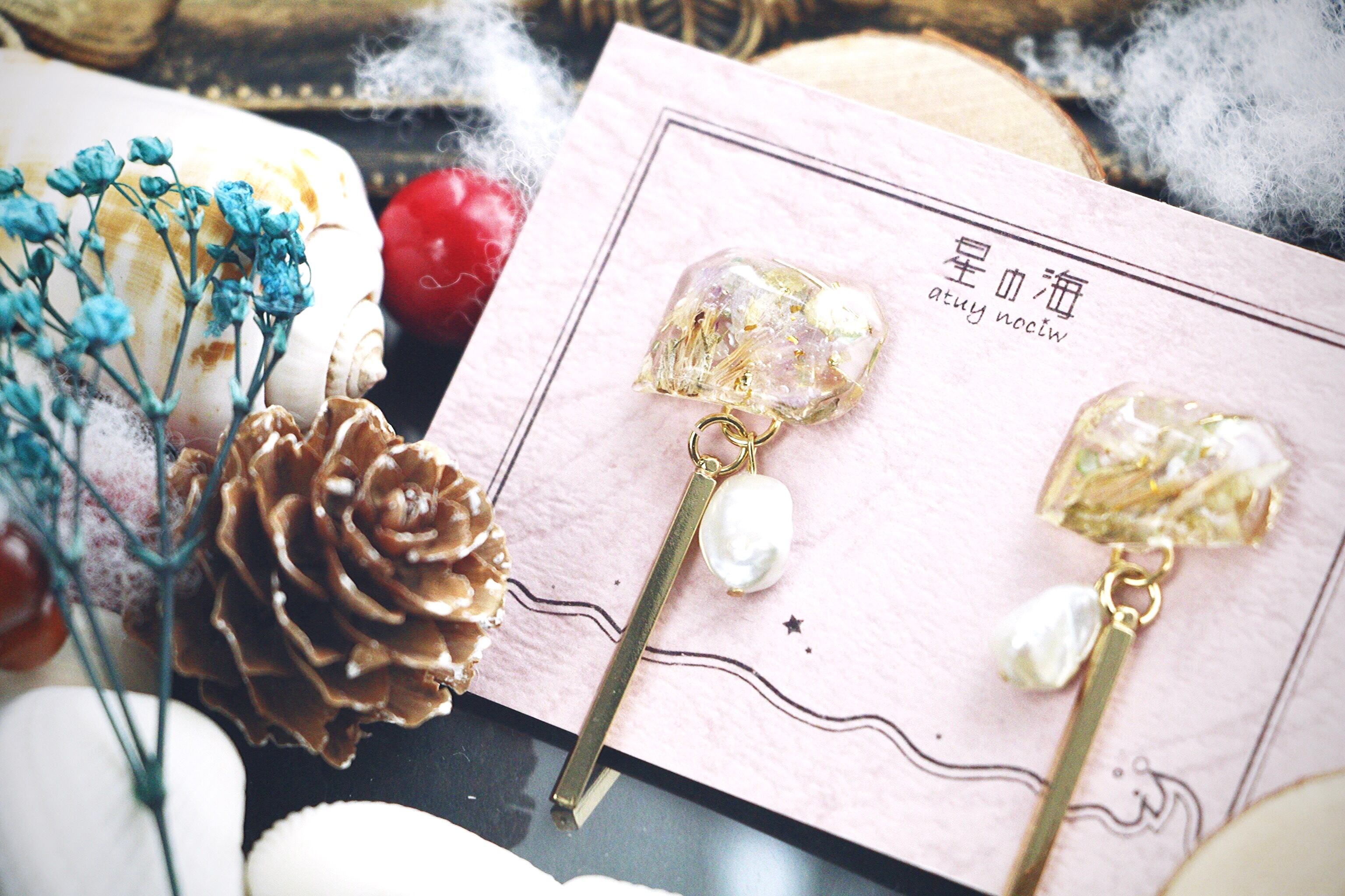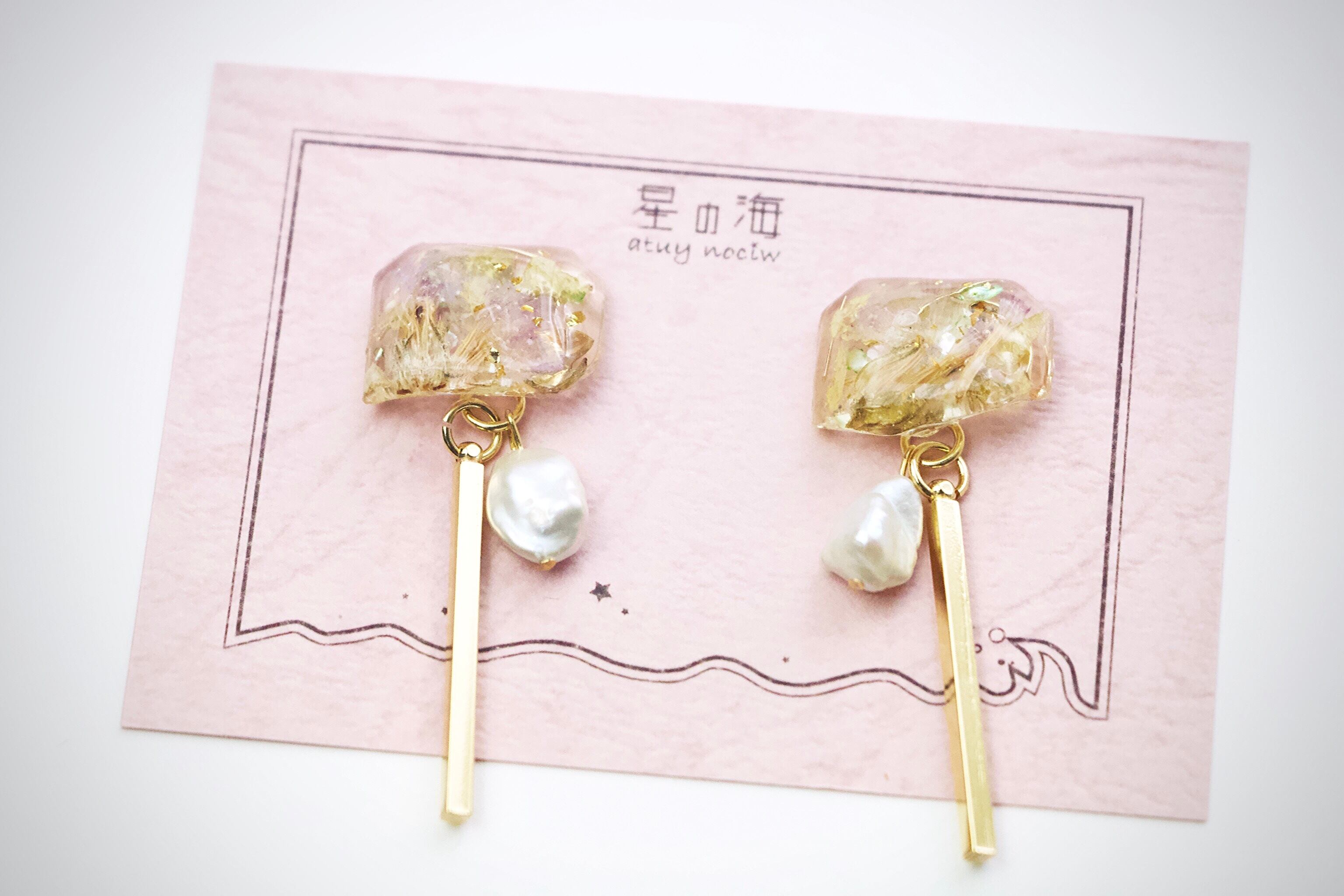 半分に割った宝石型にはスターチスのドライフラワーとグリーン系のクラッシュシェル、金箔、ゴールドパーツを散らしています。