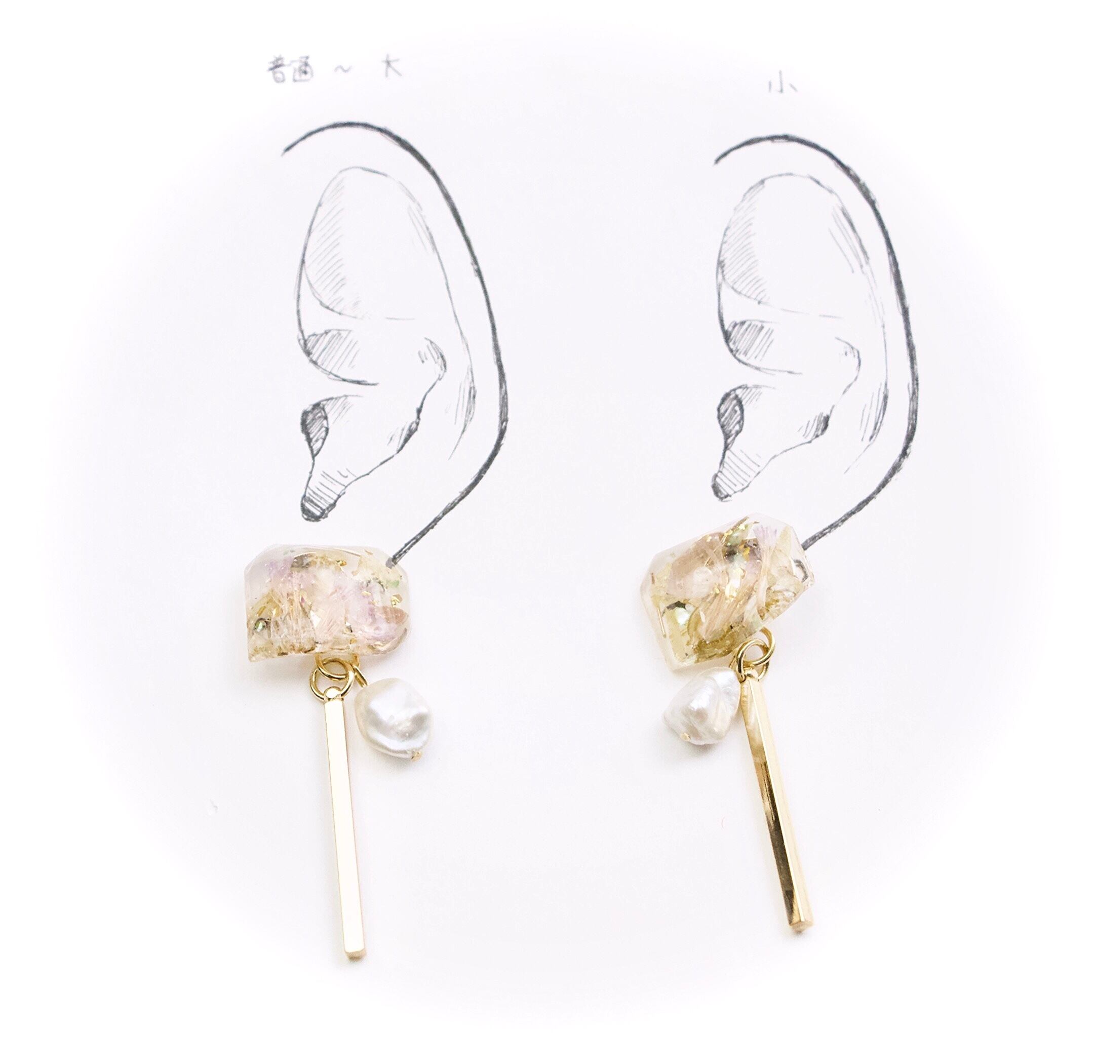 写真は耳につけるパーツをつけていないため、台紙にはマスキングテープで留めている状態です。耳シートではピアスパーツを当てています。左は平均的な女性の普通〜大きめの耳、右は小さめの耳のモデルとなっております。ご参照ください。