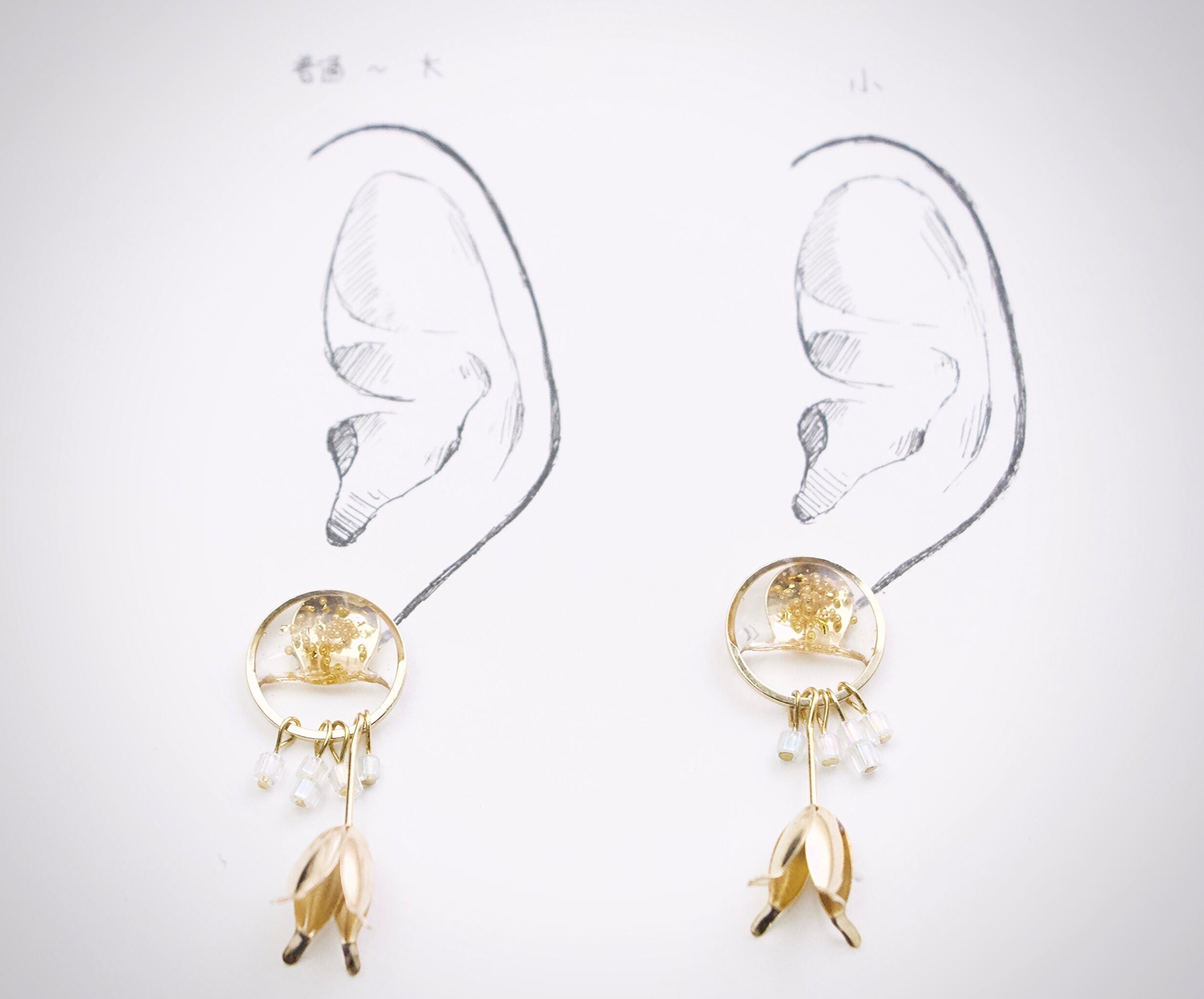耳につけるパーツをつけていないため、台紙にはマスキングテープで留めている状態です。耳シートではピアスパーツを当てています。左は平均的な女性の普通〜大きめの耳、右は小さめの耳のモデルとなっております。ご参照ください。