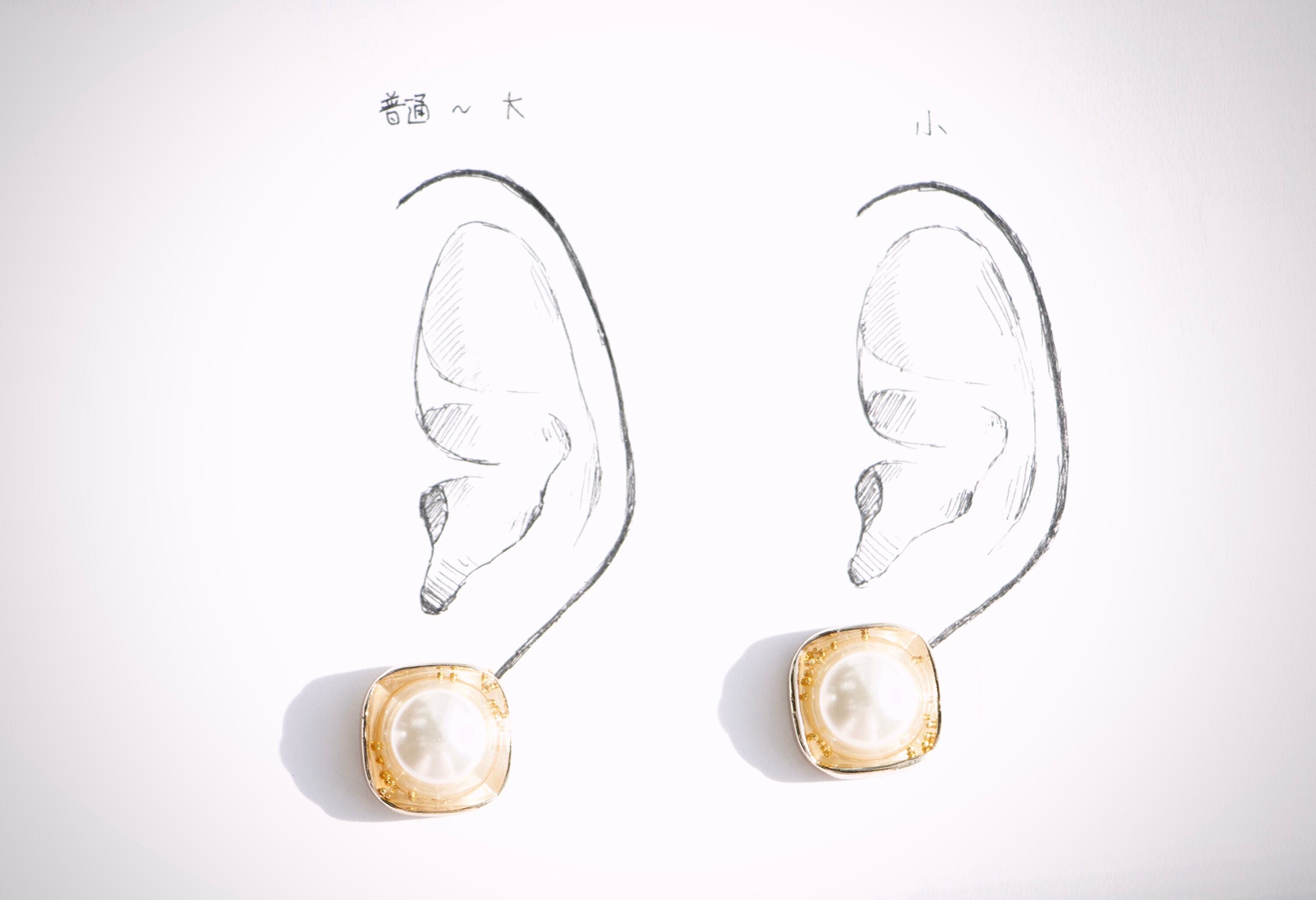 耳につけるパーツをつけていないため、台紙にはマスキングテープで留めている状態です。耳シートの左は平均的な女性の普通〜大きめの耳、右は小さめの耳のモデルとなっております。ご参照ください。