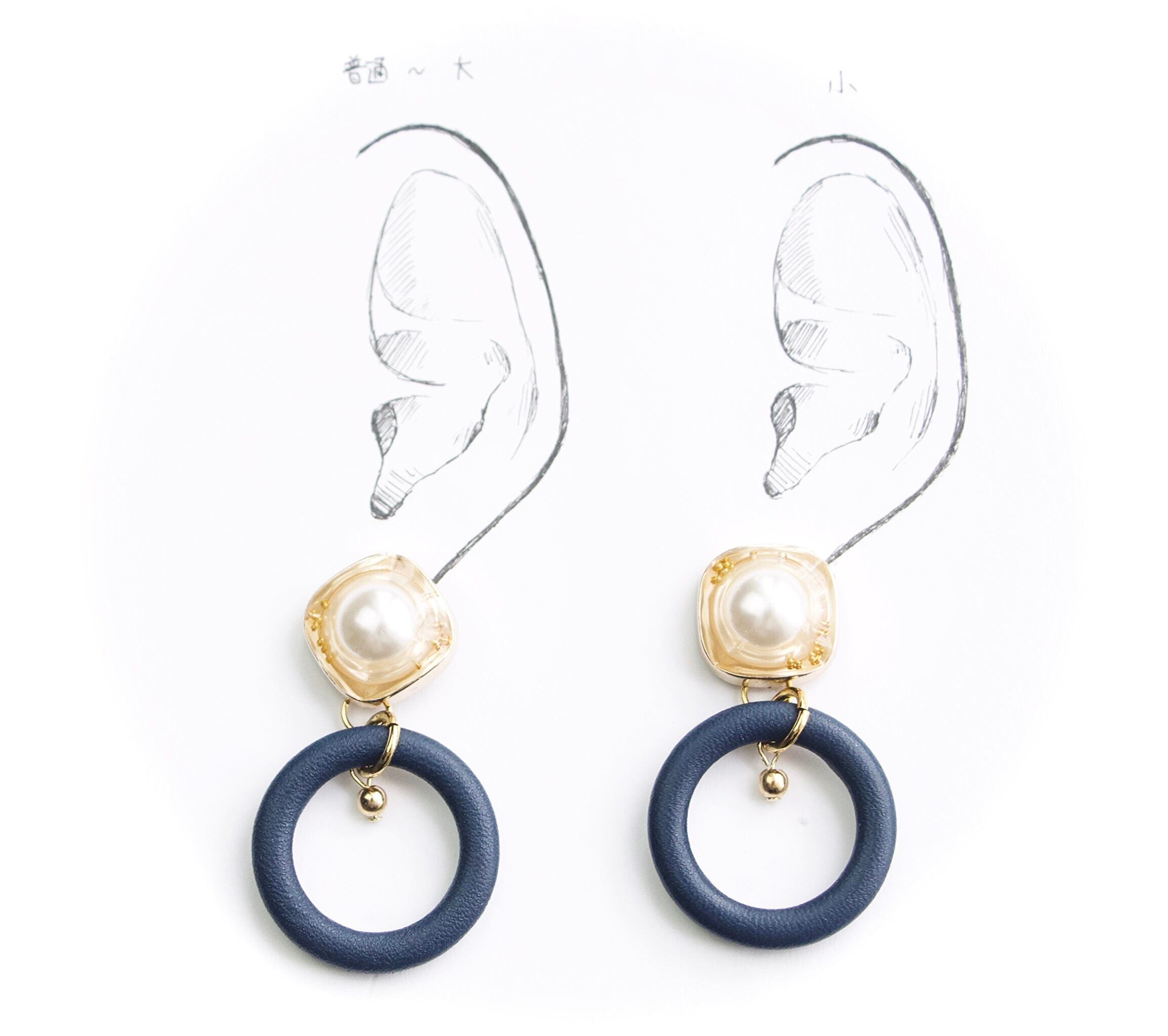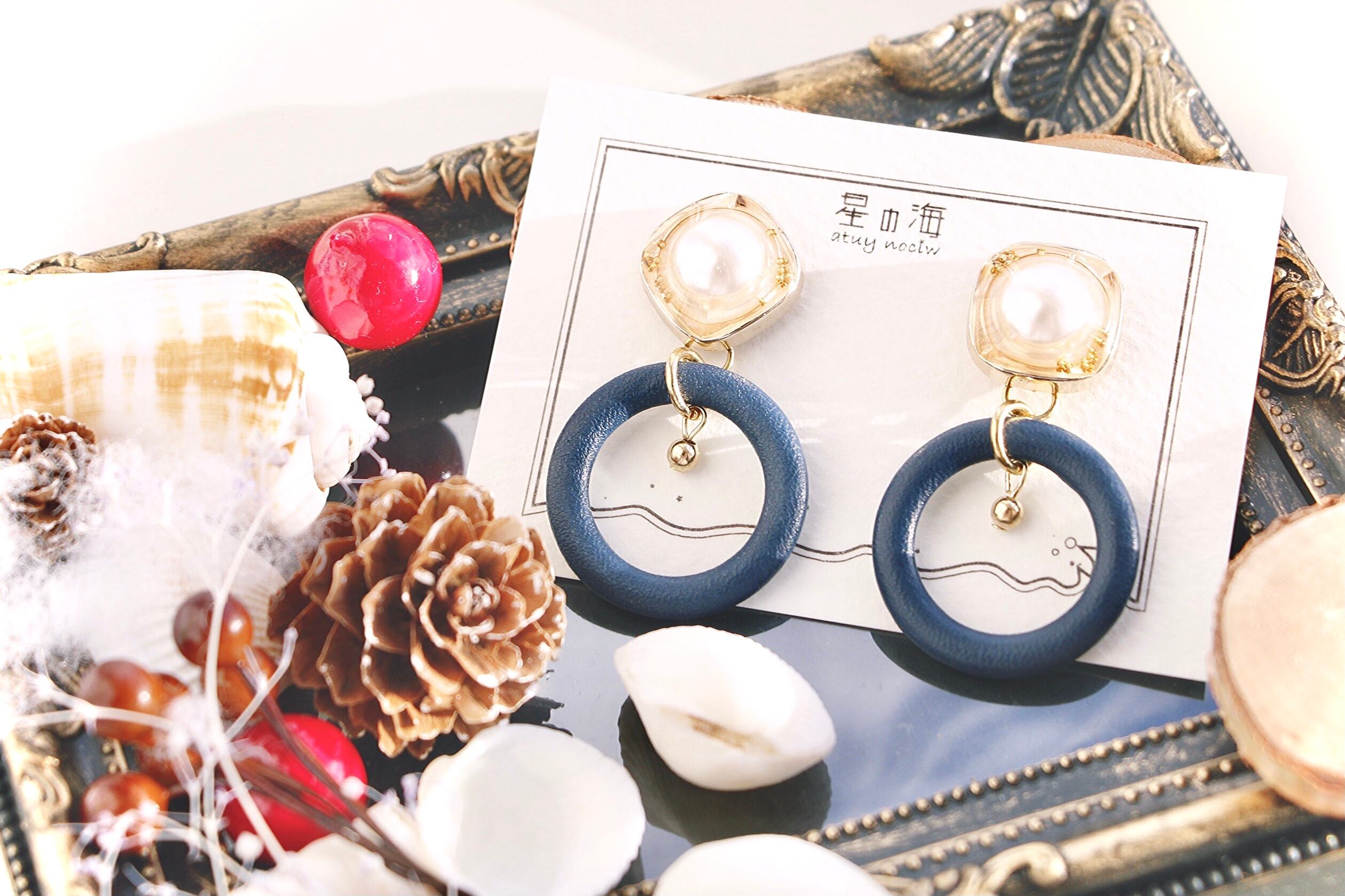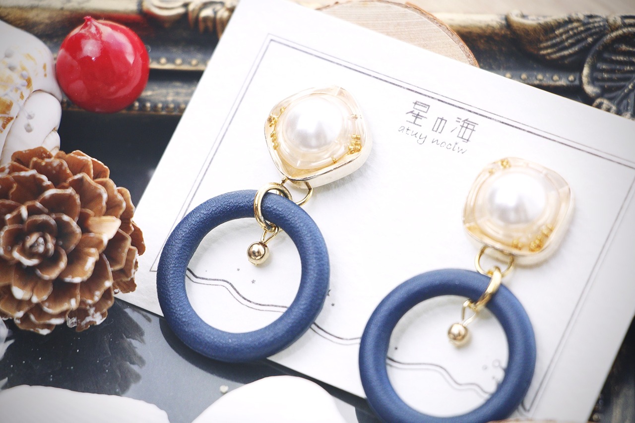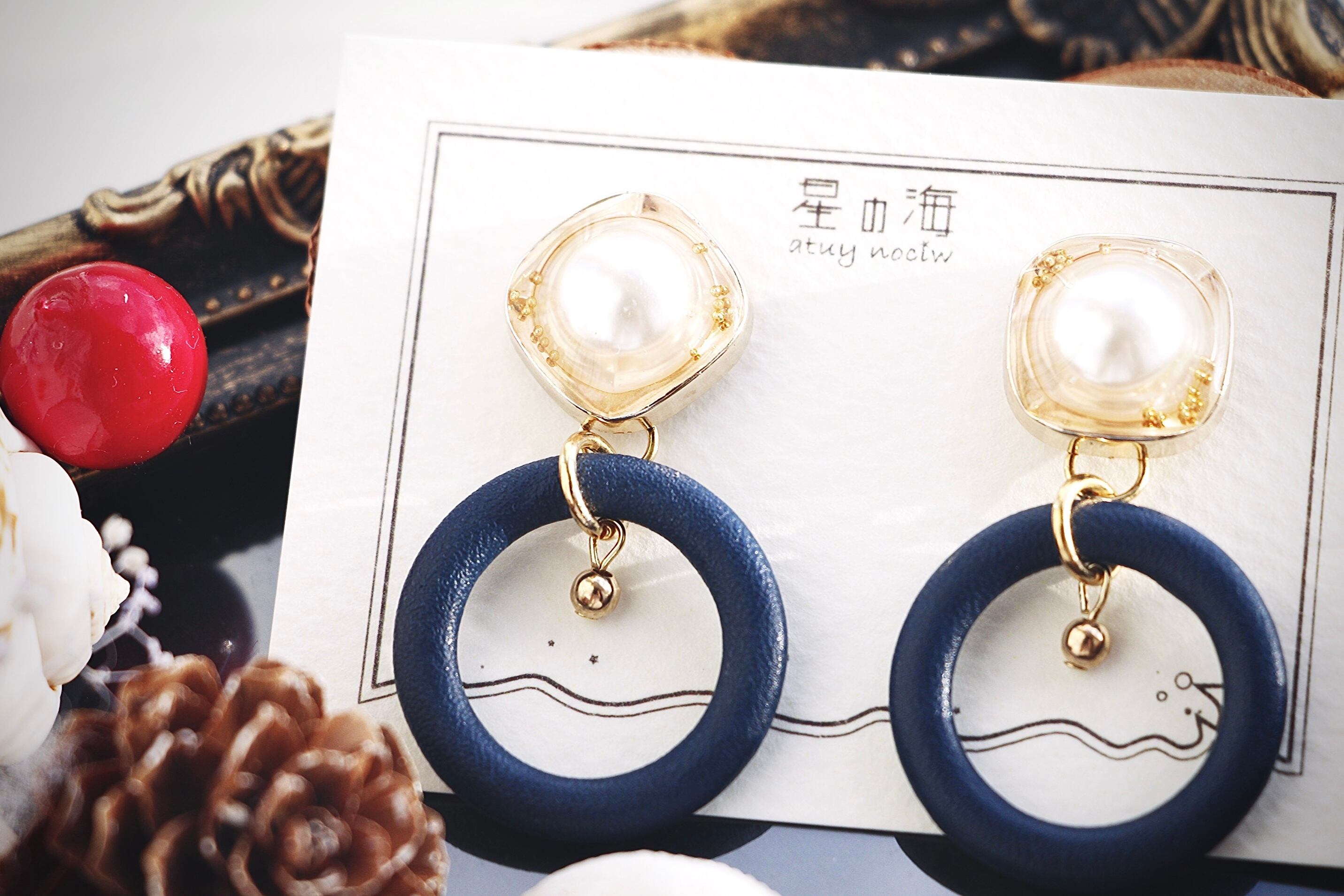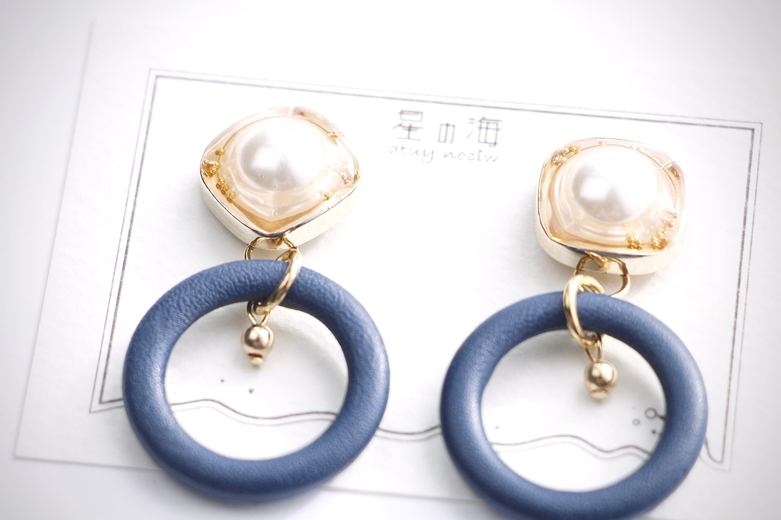 大ぶりパールはホワイトゴールドで囲い、ブリオンを散らしてうるうるに。垂れるパーツには深めの紺色レザーリングとツリーの飾りのようなゴールドビーズがあしらわれています。