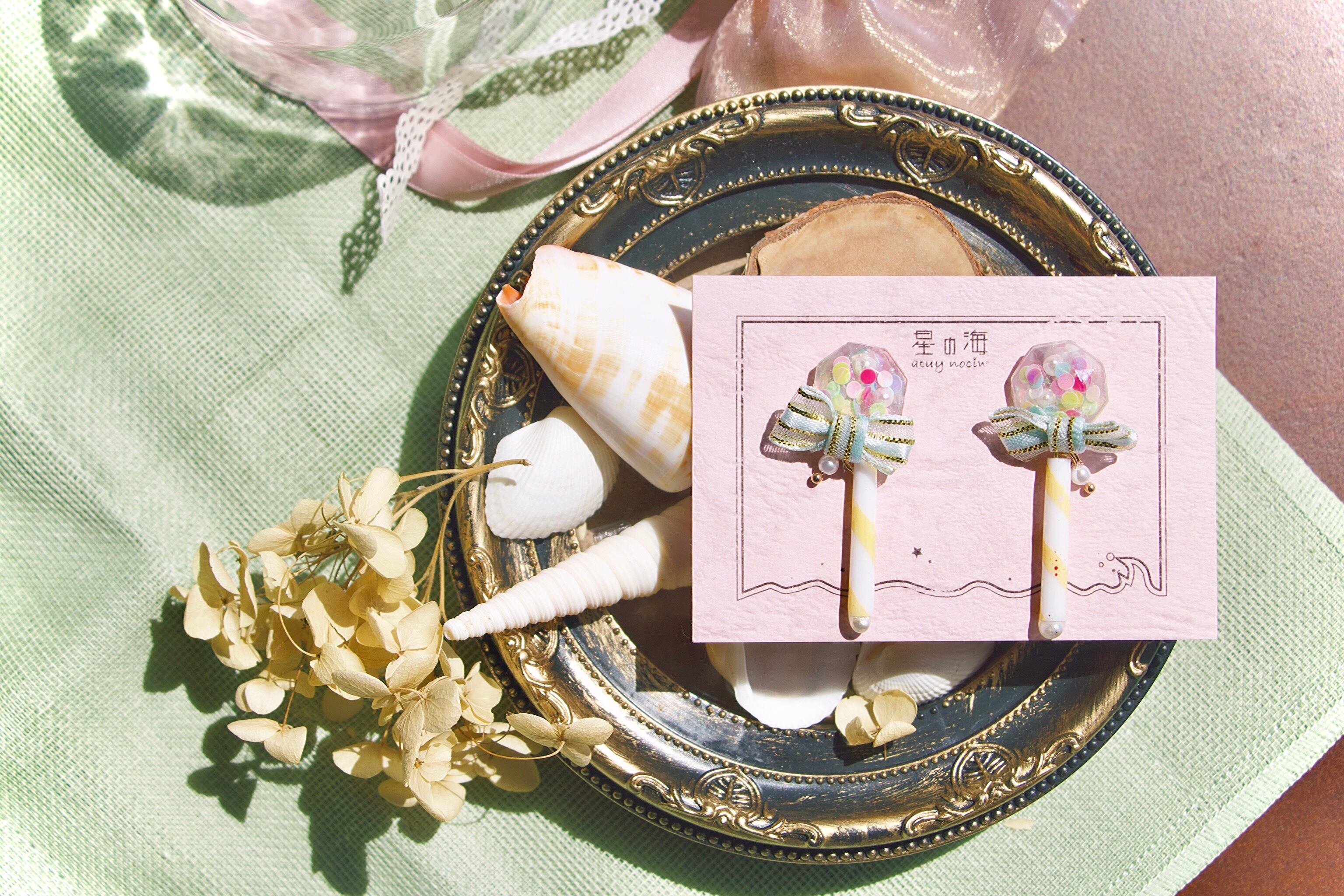 ハンドメイド ピアス イヤリング ノンホールピアス lollipop キャンディー kawaii カラフル パステルカラー リボン ロリィタ 量産型 ファッション コーデ パール