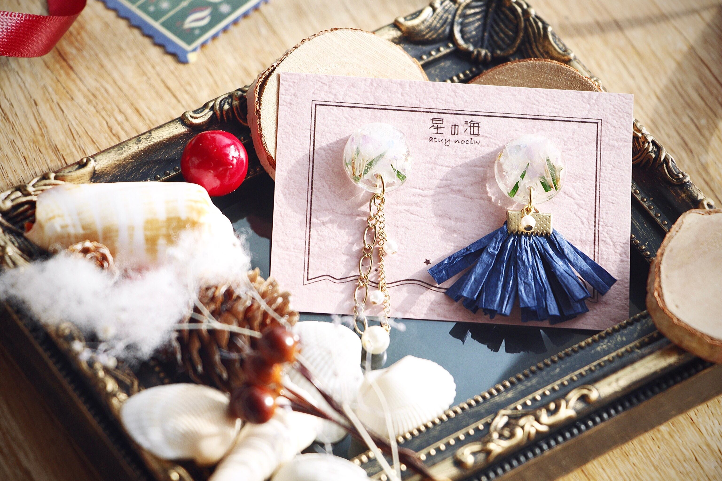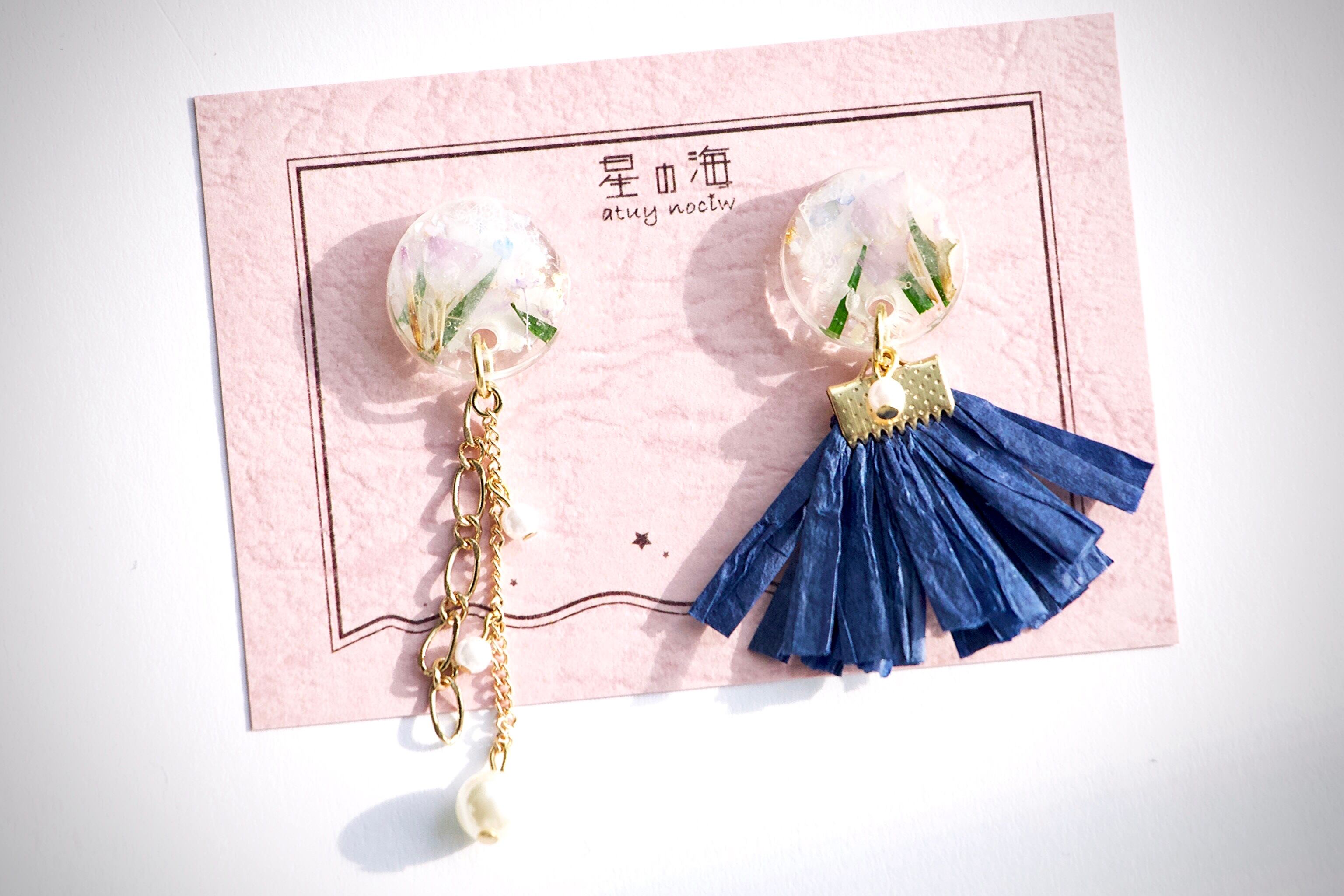 フィガロチェーンと華奢なチェーンを組み合わせ、大小のパールを垂らした大人っぽい左側、少し和風素材の藍色タッセルにちょっぴり主張するパールが可愛らしい右側。