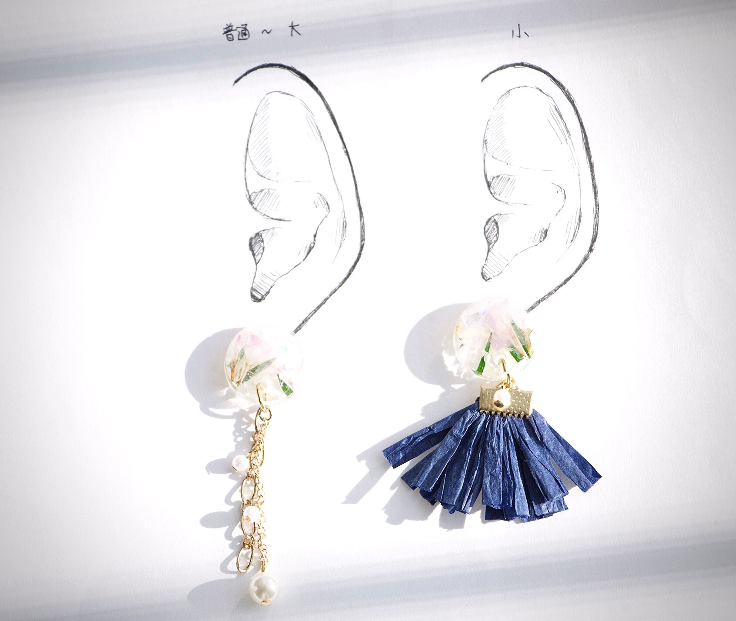 耳につけるパーツをつけていないため、台紙にはマスキングテープで留めている状態です。耳シートではピアスパーツを当てています。左は平均的な女性の普通〜大きめの耳、右は小さめの耳のモデルとなっております。ご参照ください。