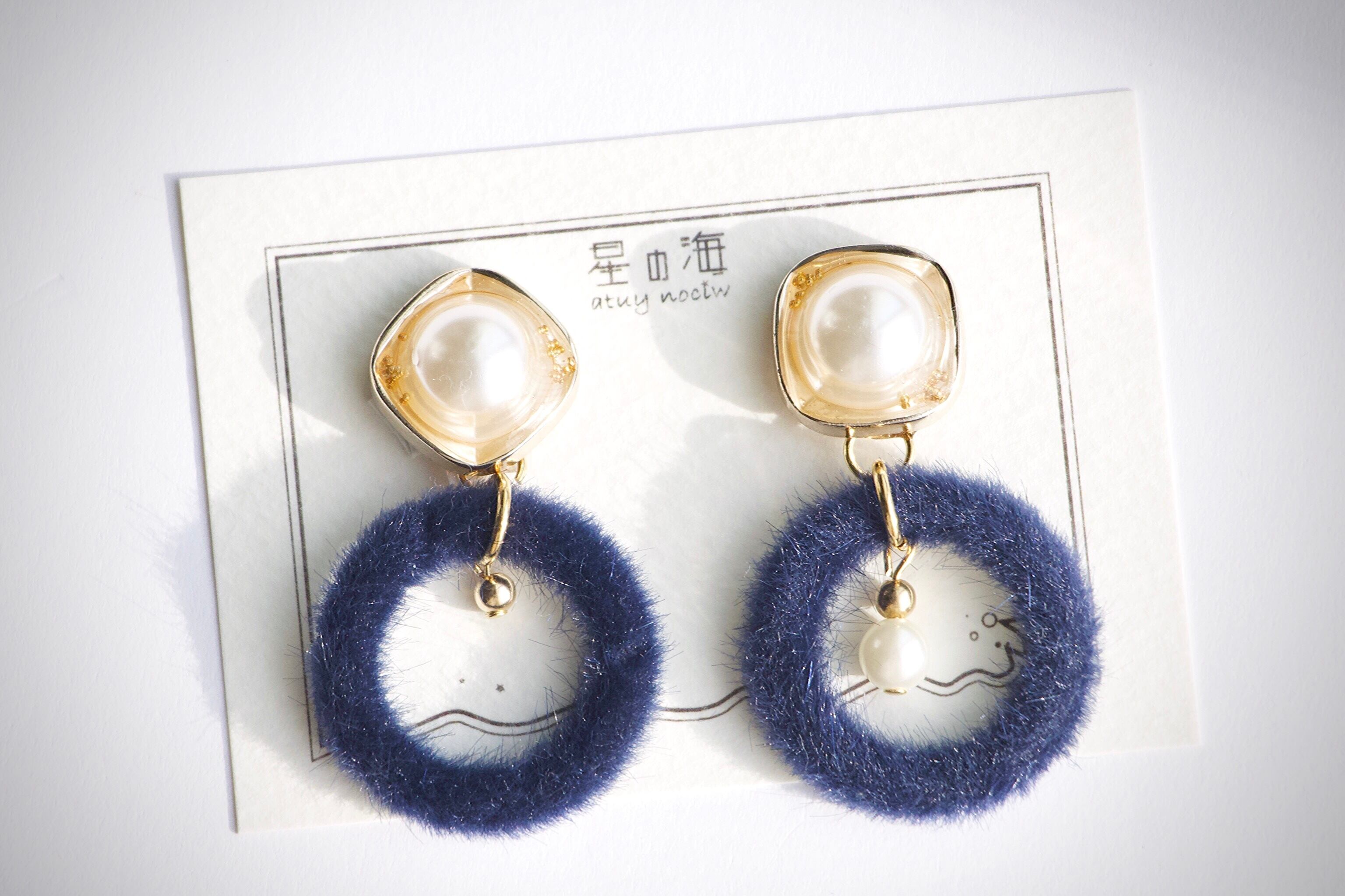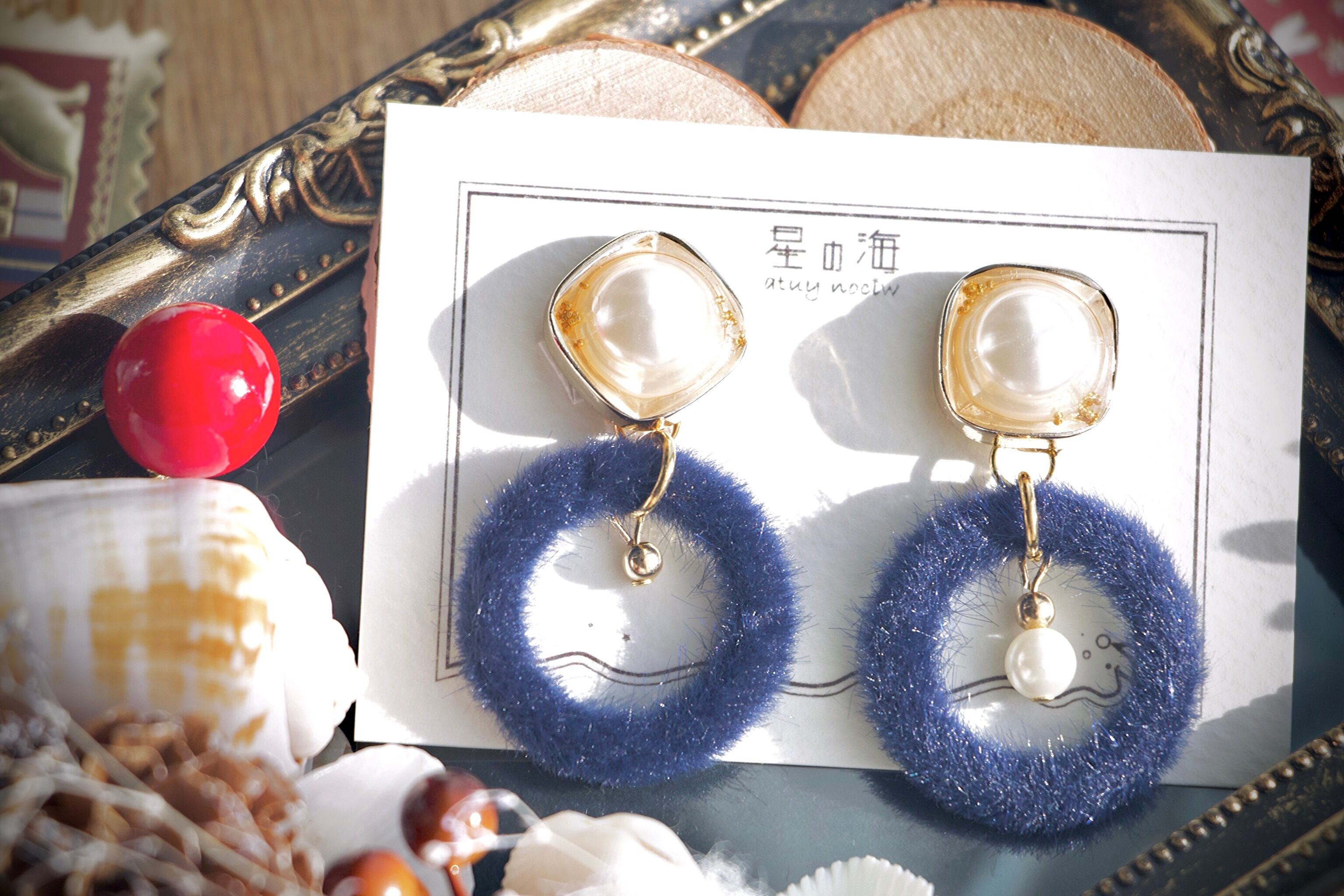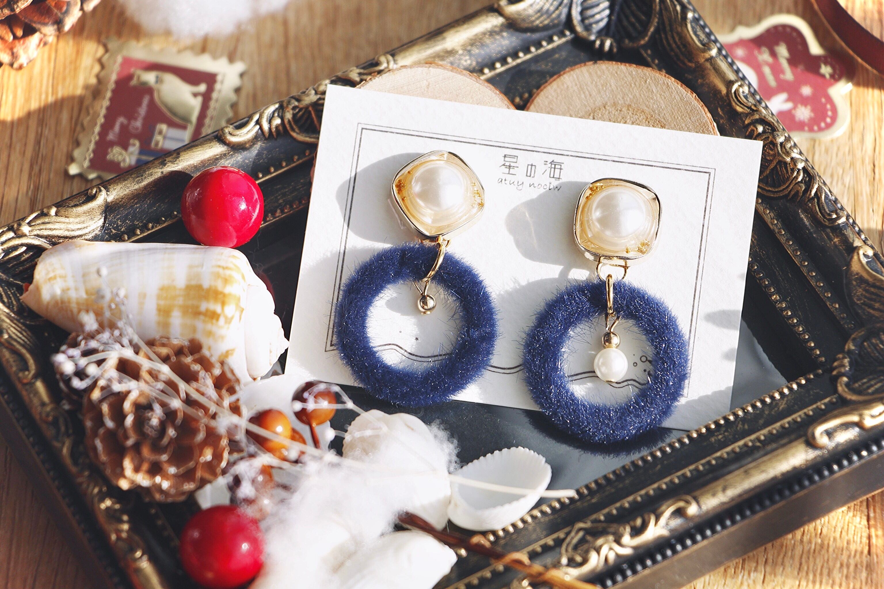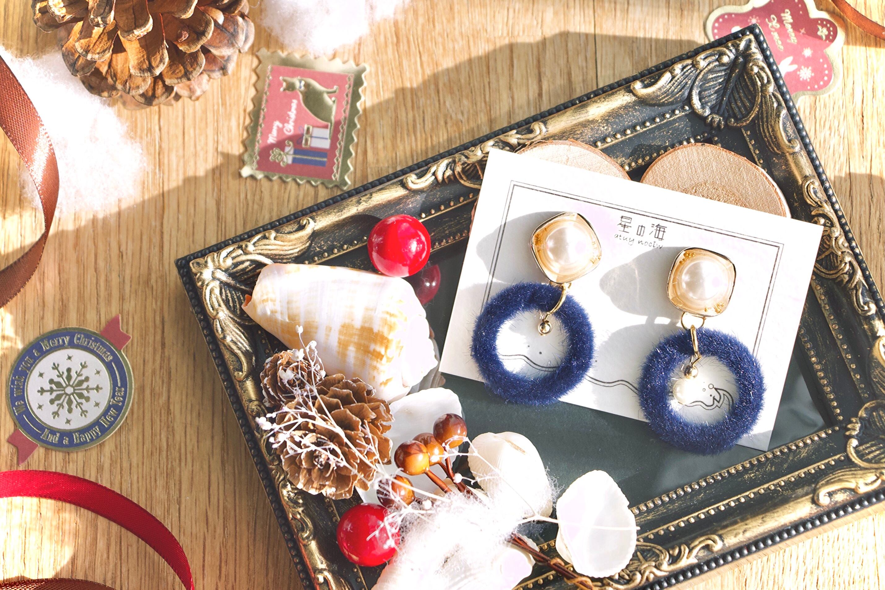 大ぶりパールはホワイトゴールドで囲い、ブリオンを散らしてうるうるに。垂れるパーツには深めの紺色レザーリングとツリーの飾りのようなゴールドビーズがあしらわれています。