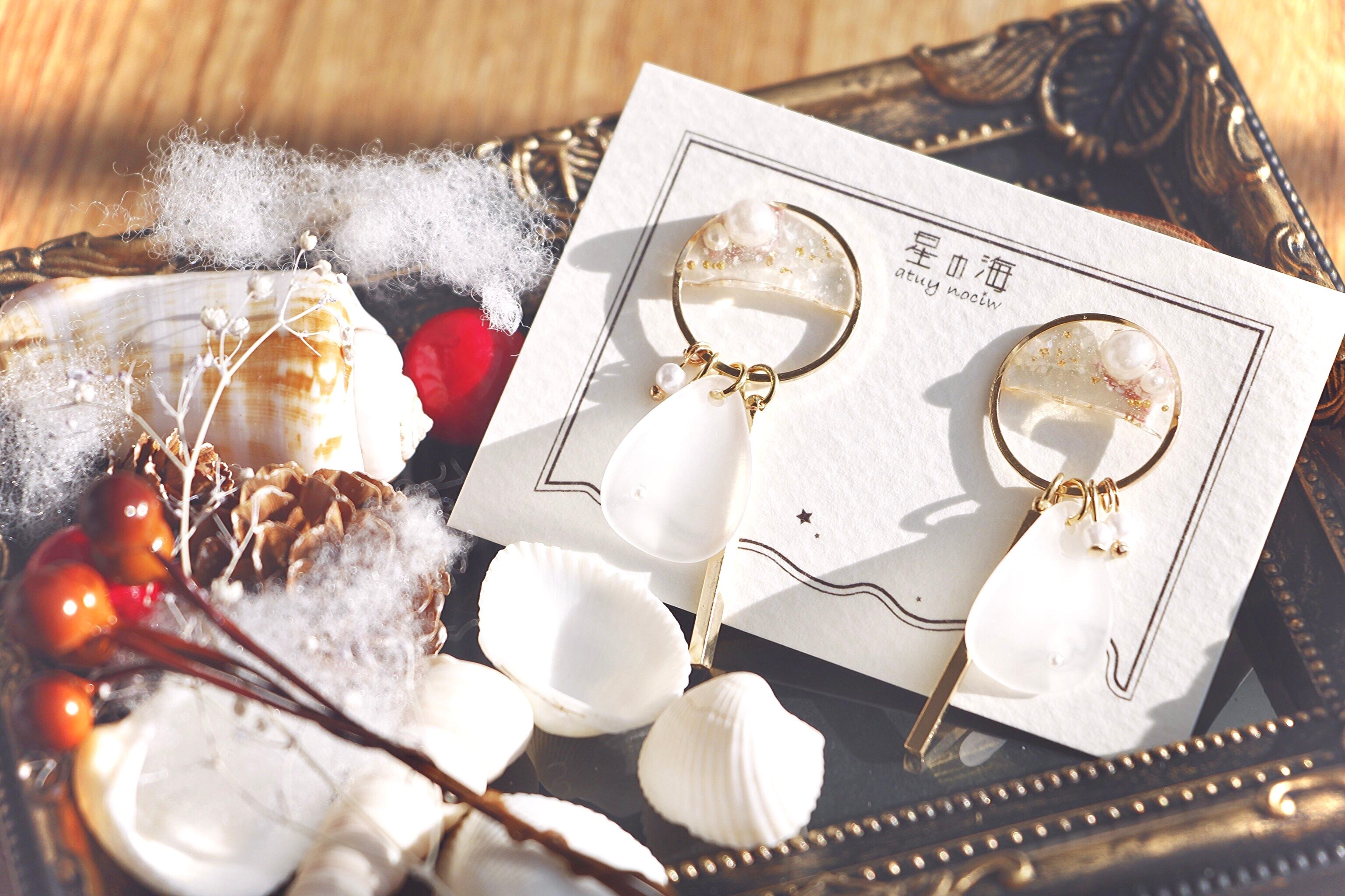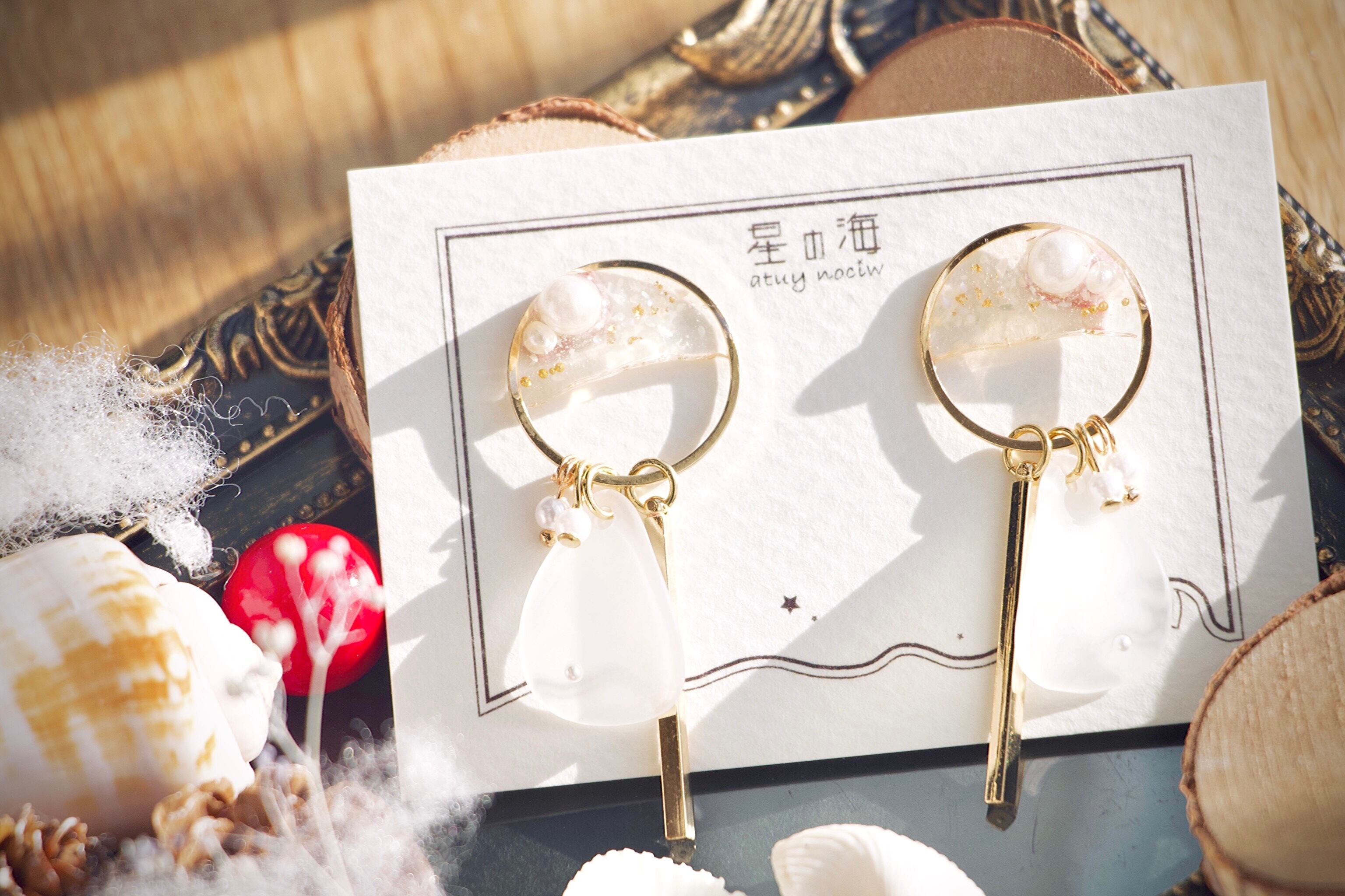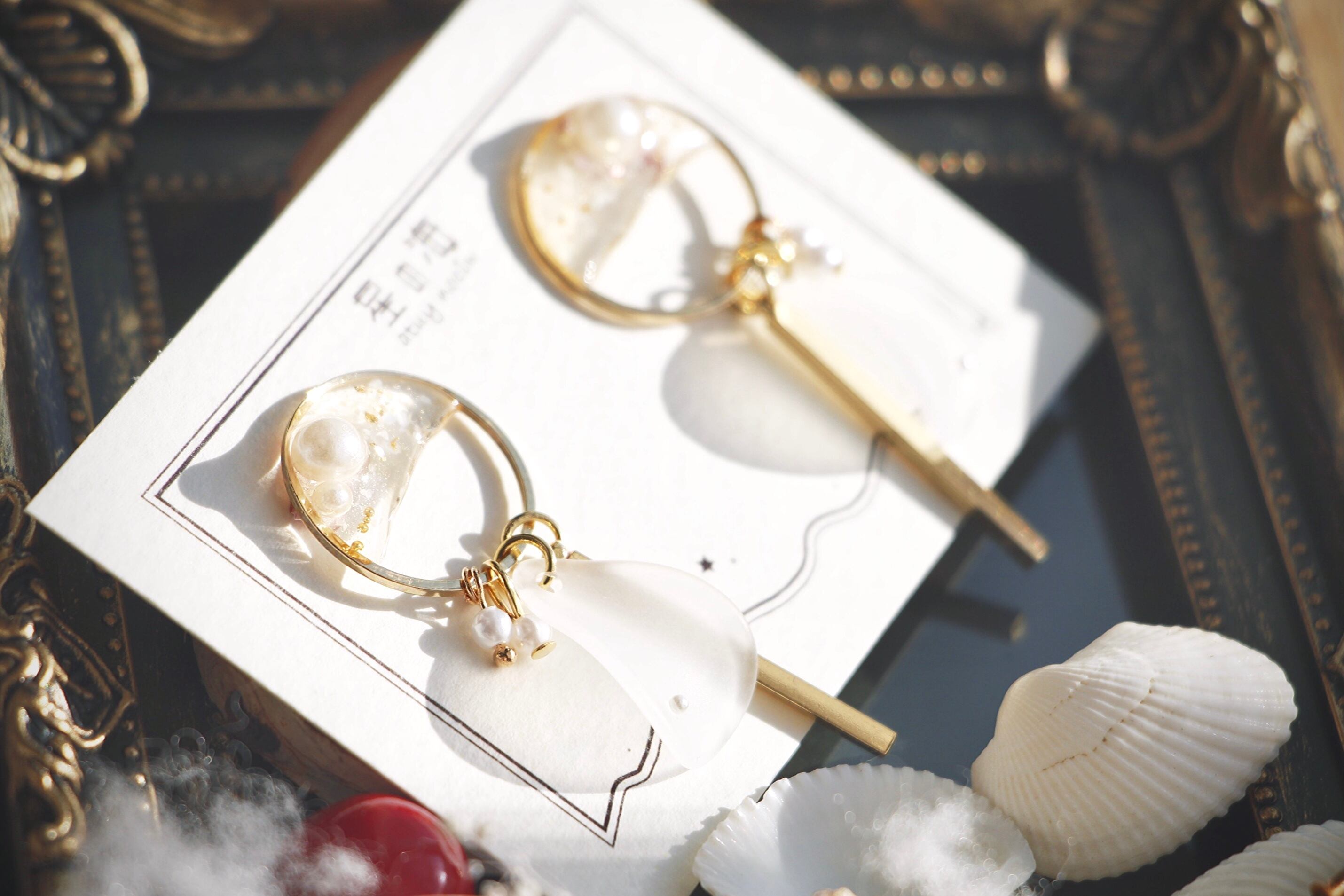 トップは大きめのゴールド空枠、その半分にはクリアで包まれた大ぶりパールにぎっしりのシェルと金箔!まとまりを良くするためブリオンも並べています。