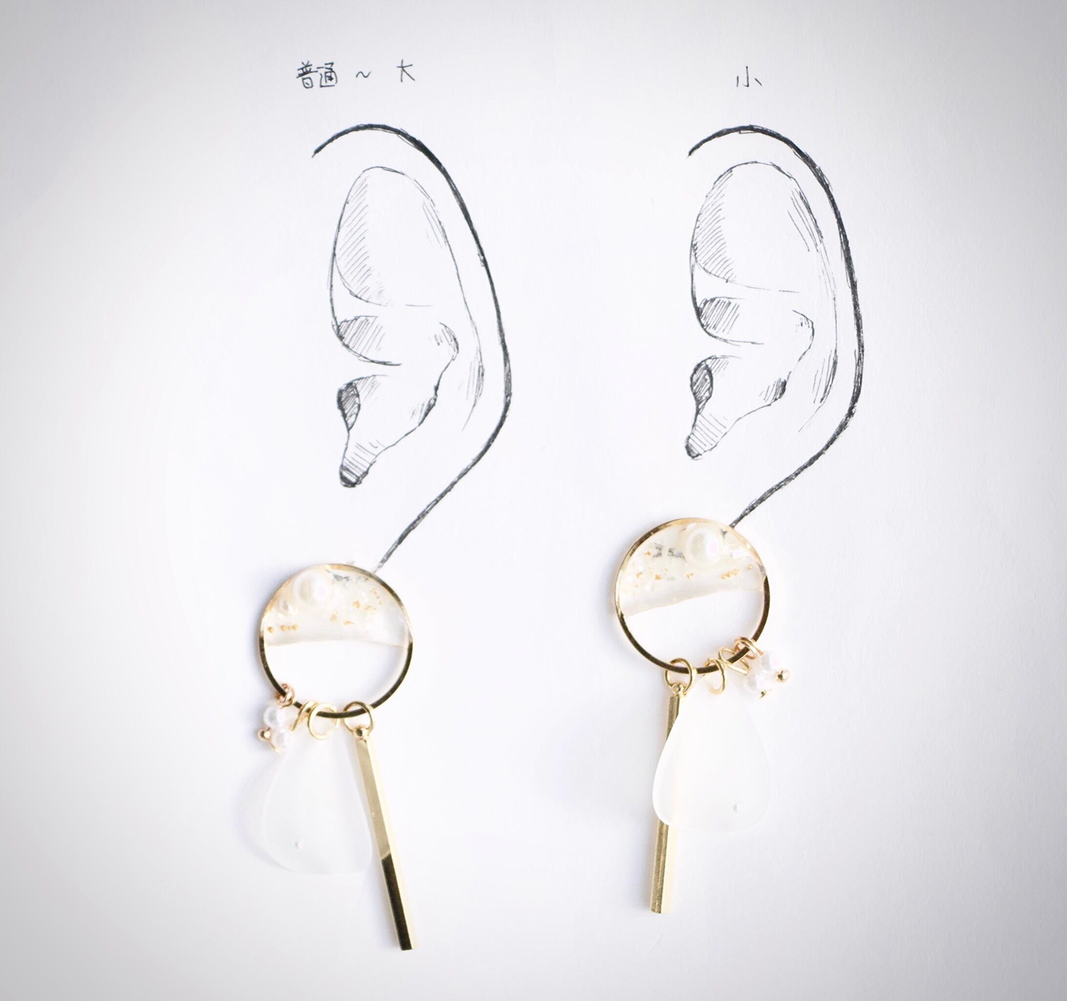 耳につけるパーツをつけていないため、台紙にはマスキングテープで留めている状態です。耳シートの左は平均的な女性の普通〜大きめの耳、右は小さめの耳のモデルとなっております。ご参照ください。