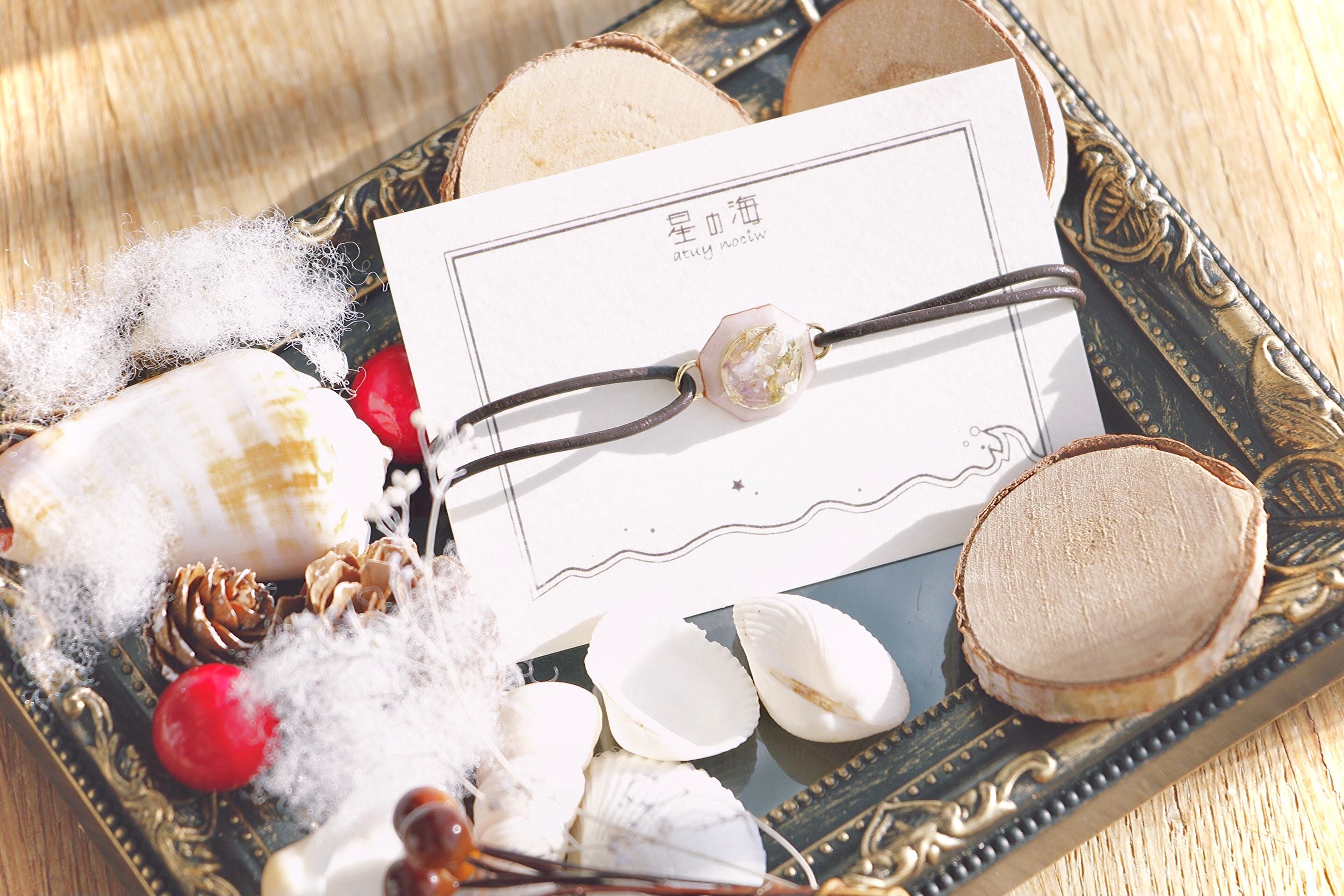 トップは薄紫をバックにし、金の空枠を埋め込みました。その上にはぎっしりとお花とシェル、紫陽花の欠片を詰め込み、金箔を所々に散らしています。ワンポイントでミニパールを最後にあしらい、周りをブランドカラーで囲いまとまりを良く。