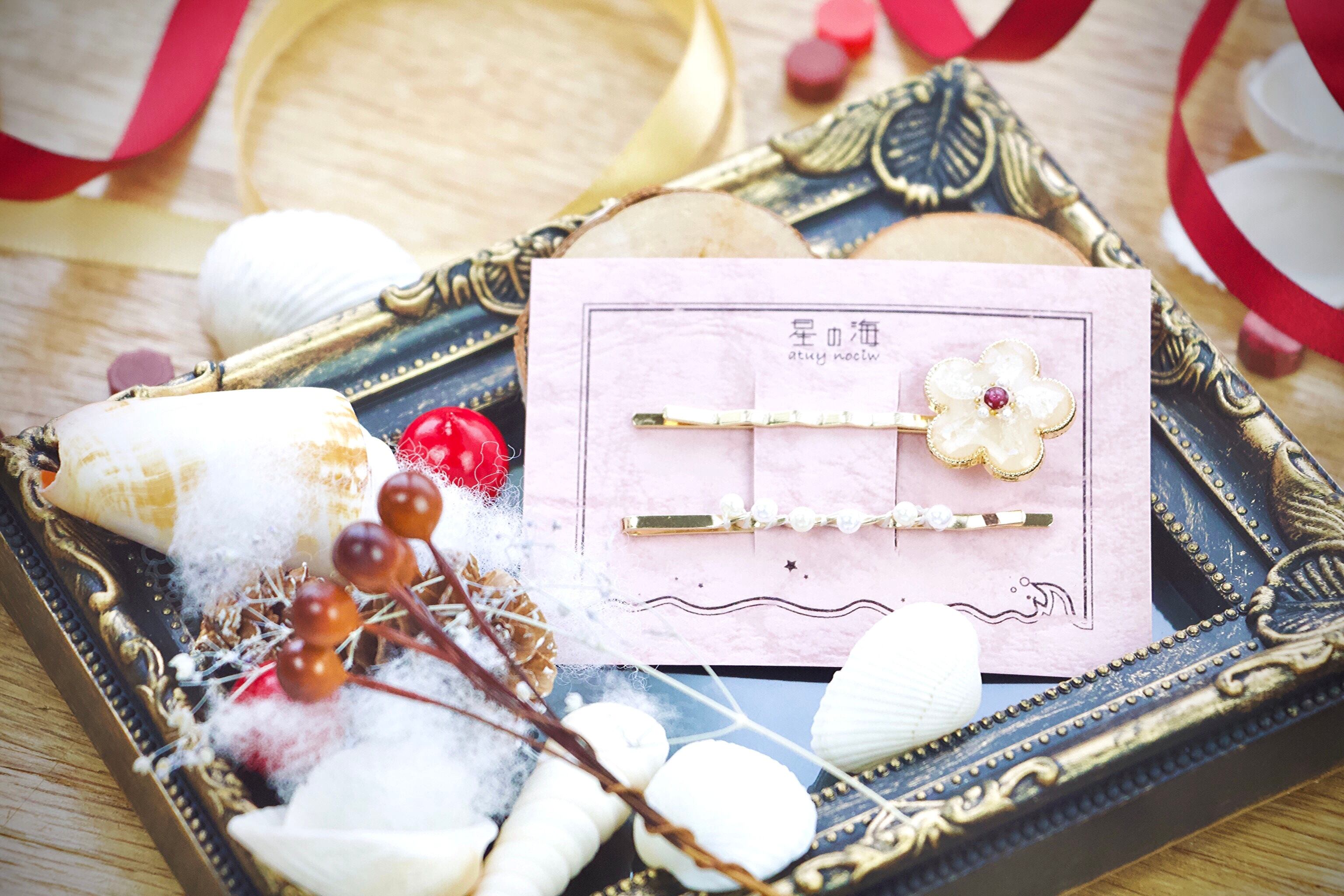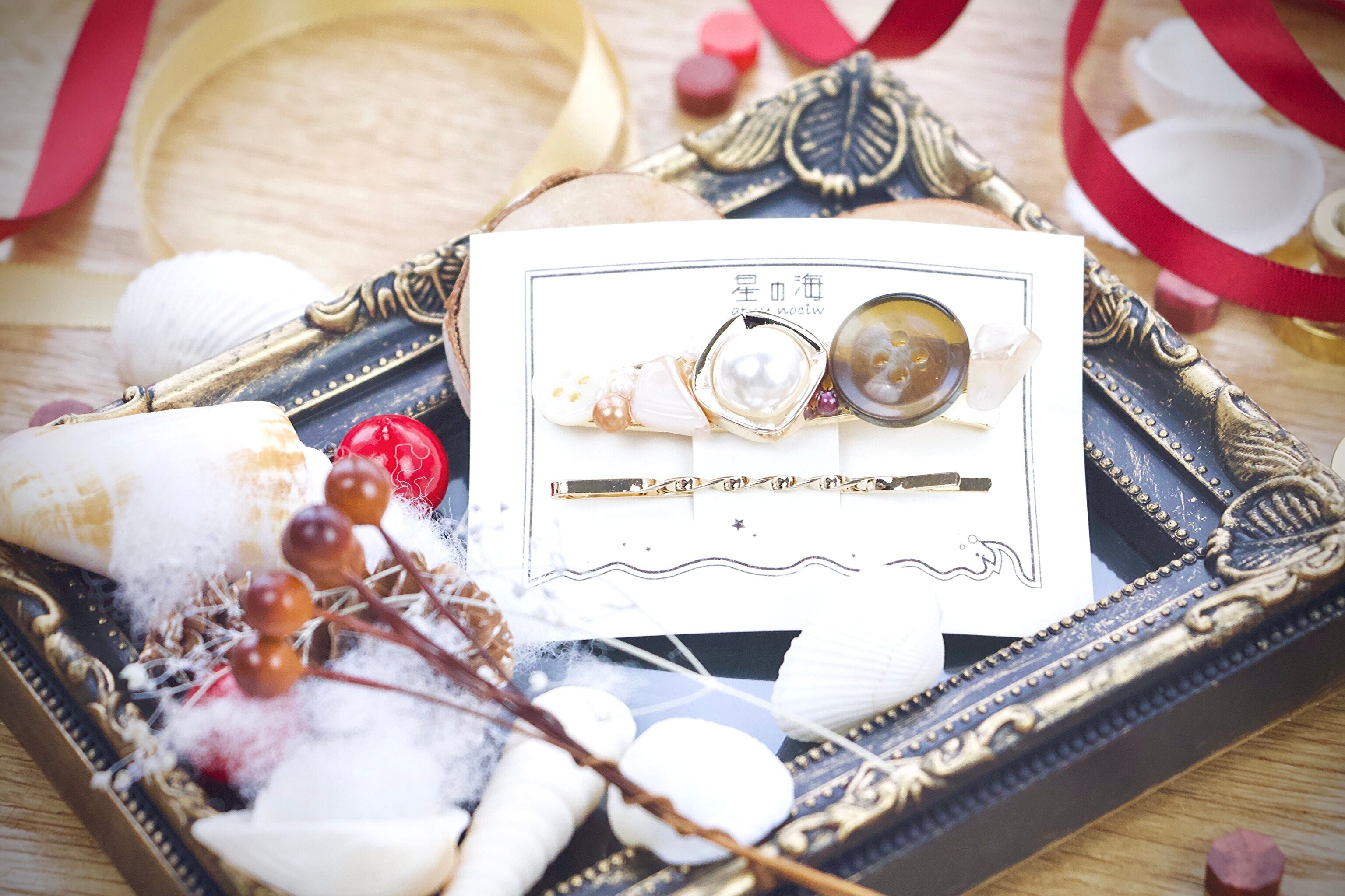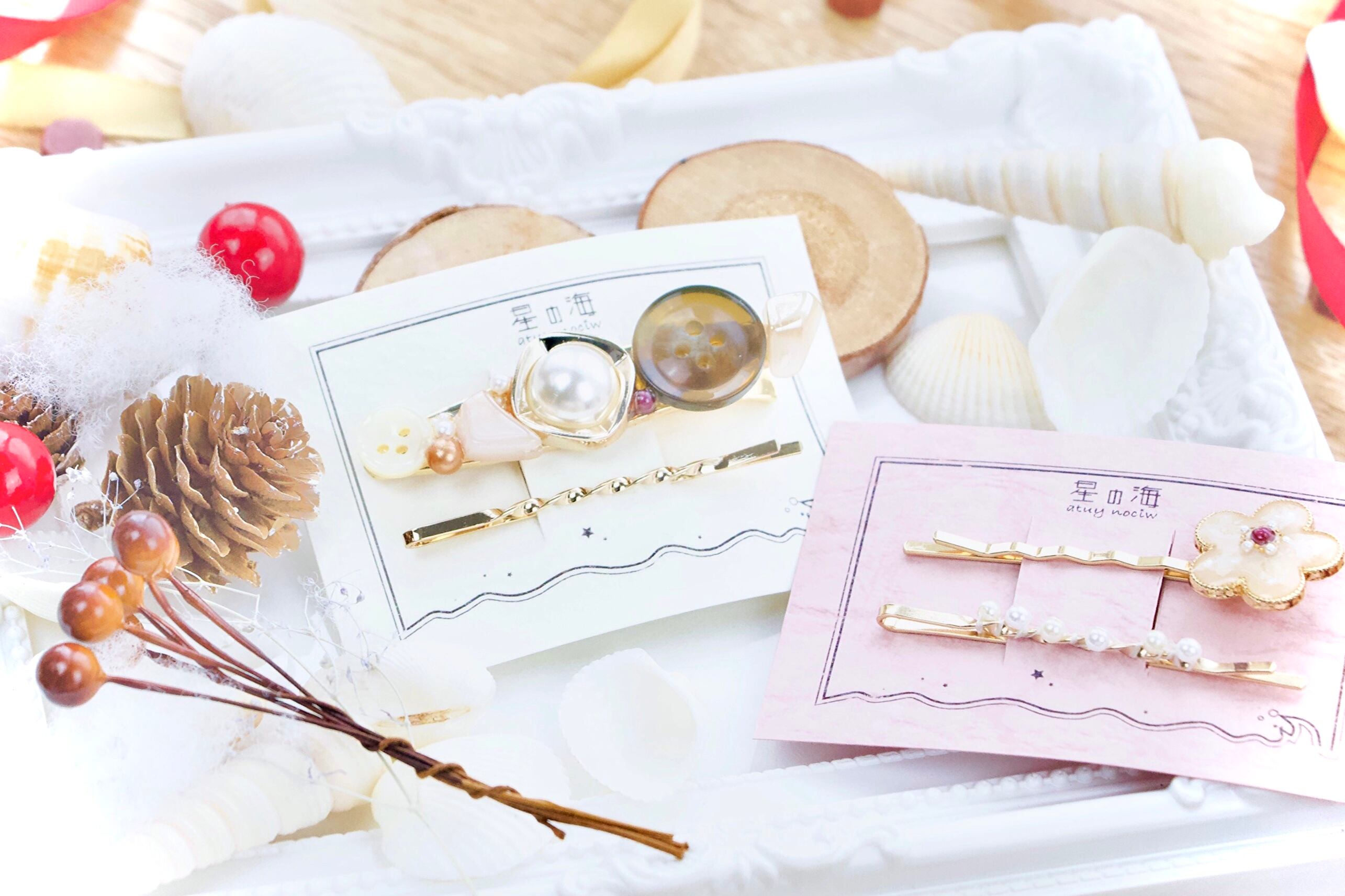星の海では珍しいヘアピン作品やボタン系を詰め込み、オマケにパールピンを付けました!