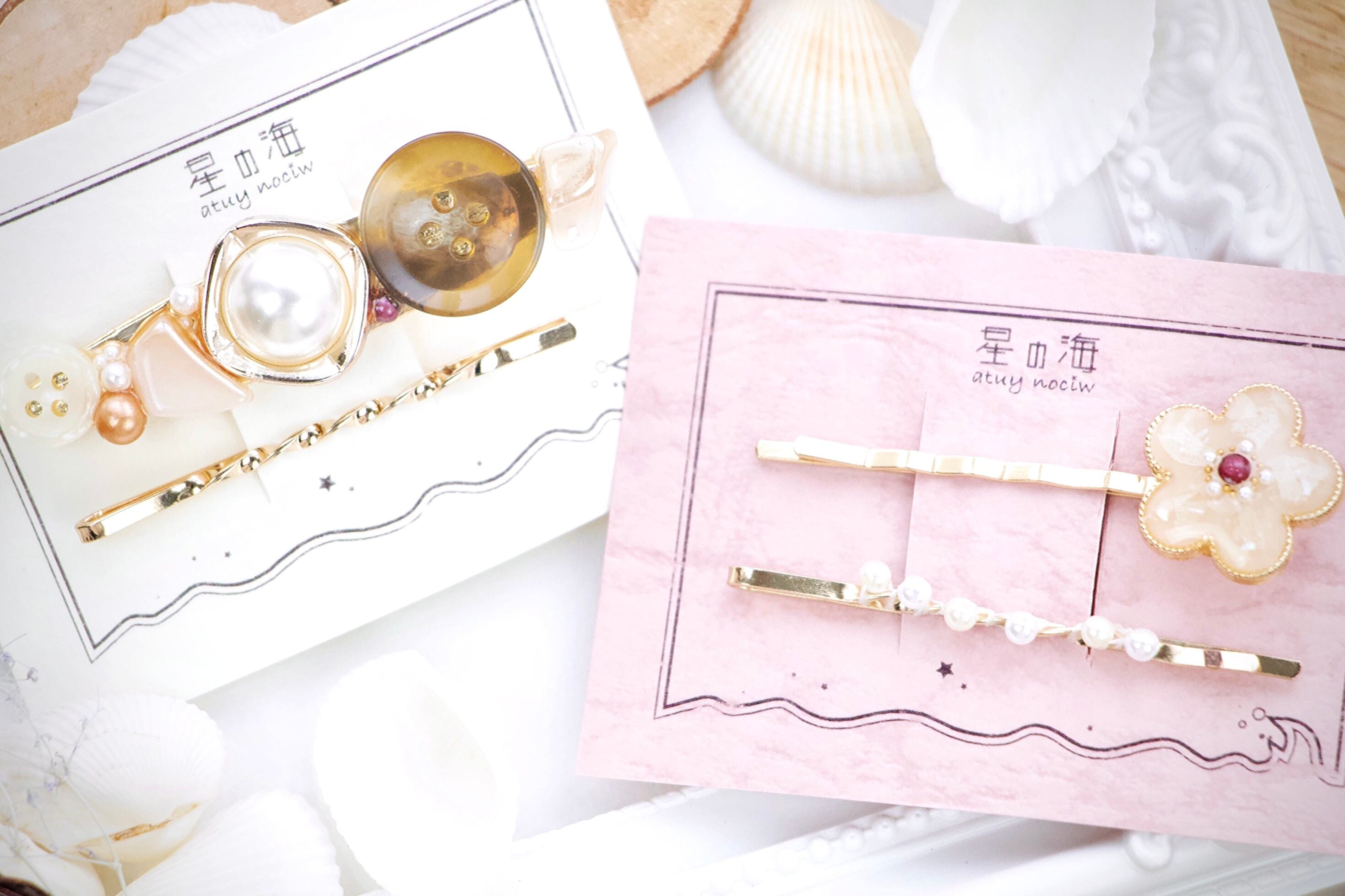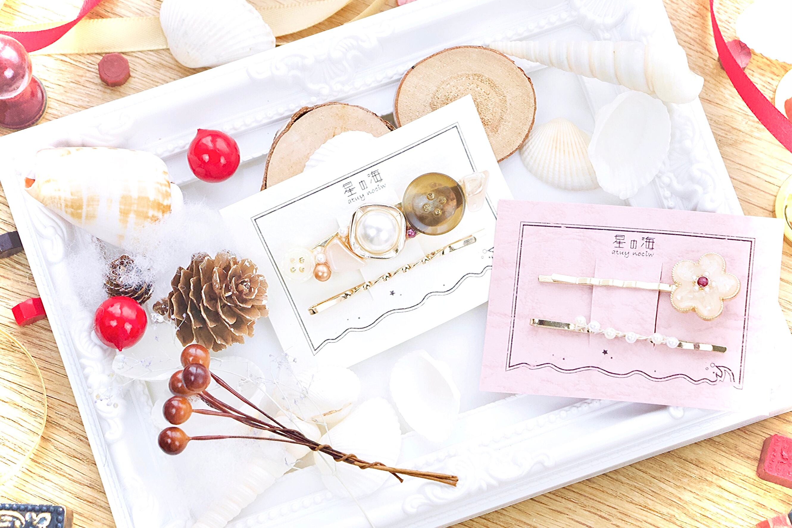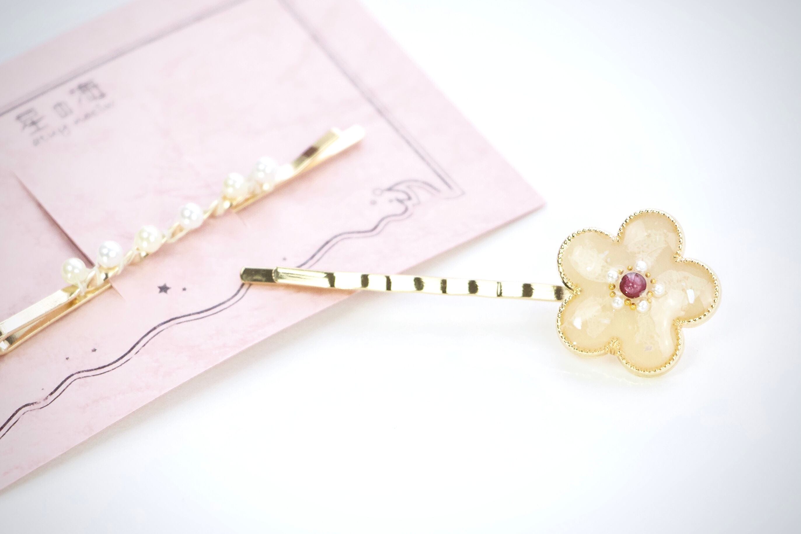 星の海では珍しいヘアピン作品やボタン系を詰め込み、オマケにパールピンを付けました!