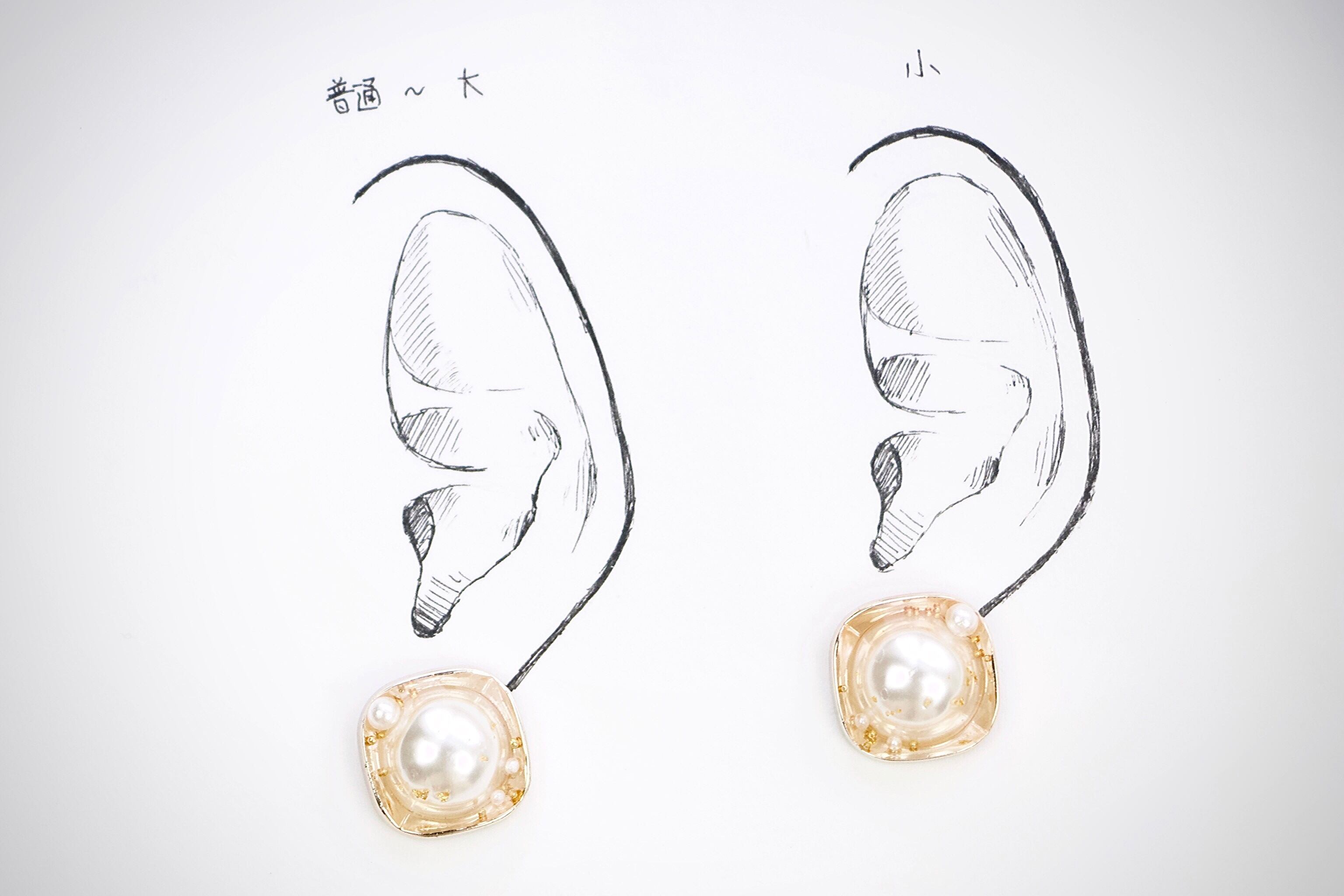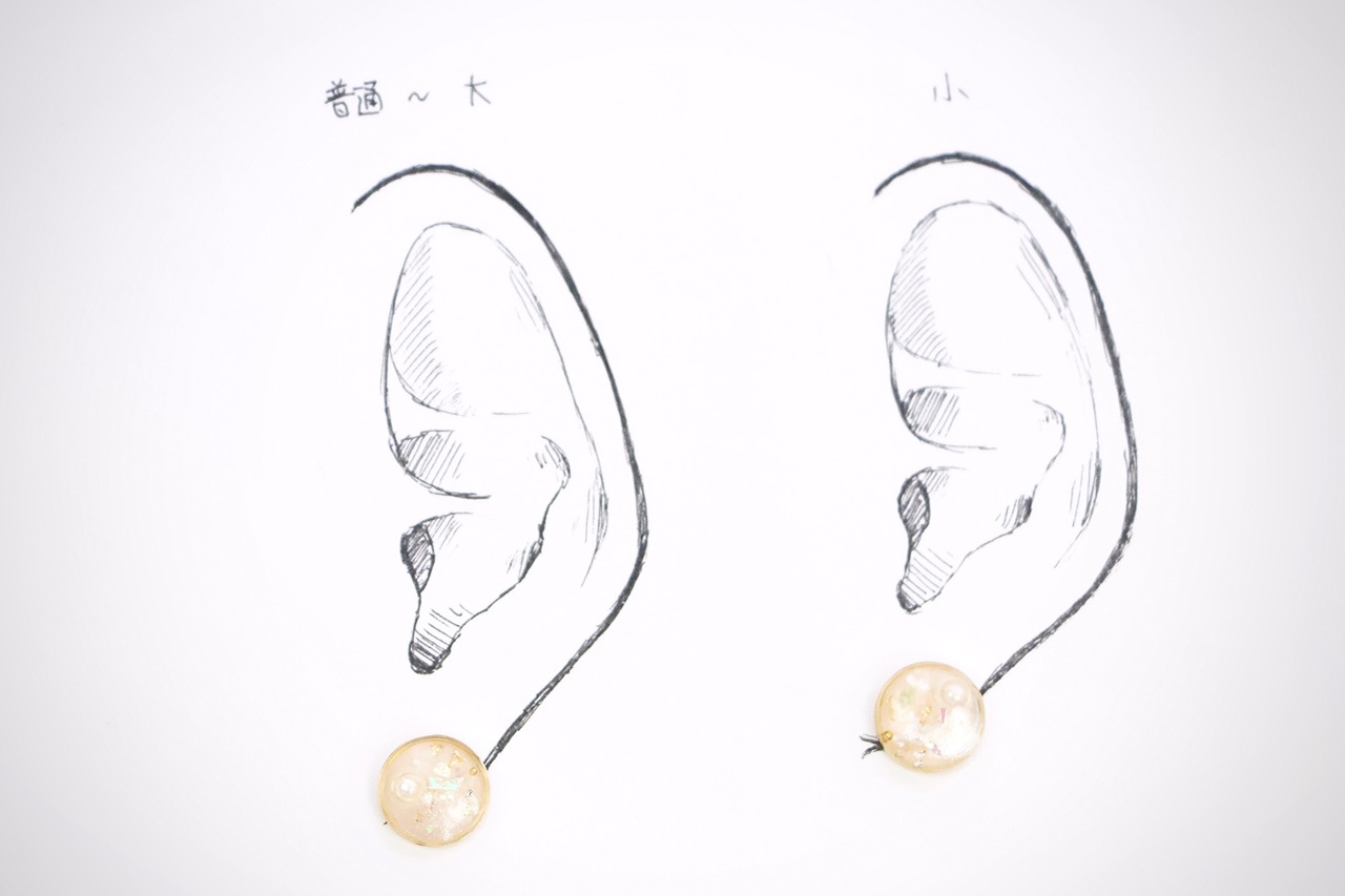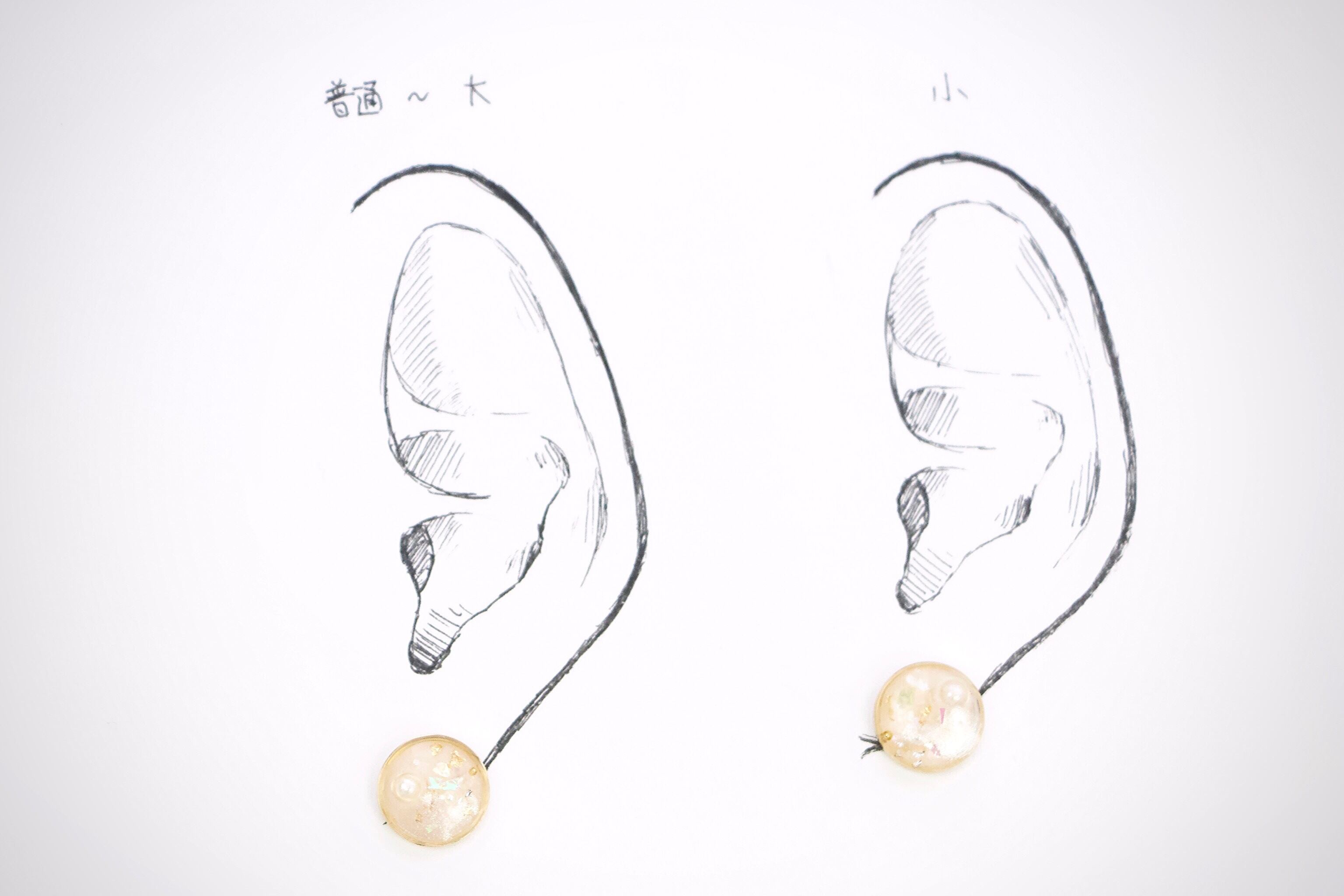 耳につけるパーツをつけていないため、台紙にはマスキングテープで留めている状態です。耳シートではピアスパーツを当てています。左は平均的な女性の普通〜大きめの耳、右は小さめの耳のモデルとなっております。ご参照ください。