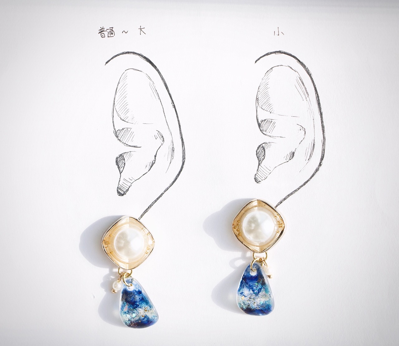 耳につけるパーツをつけていないため、台紙にはマスキングテープで留めている状態です。耳シートではピアスパーツを当てています。左は平均的な女性の普通〜大きめの耳、右は小さめの耳のモデルとなっております。ご参照ください。