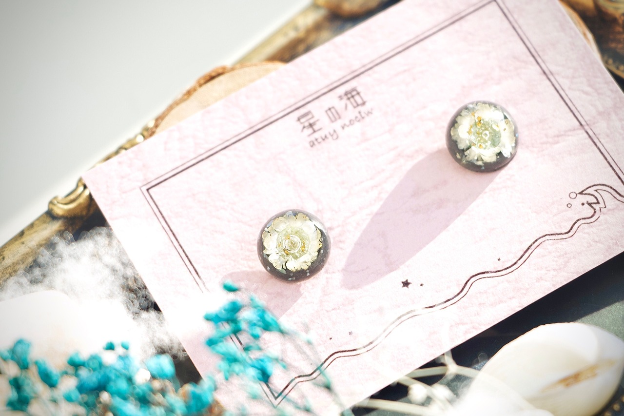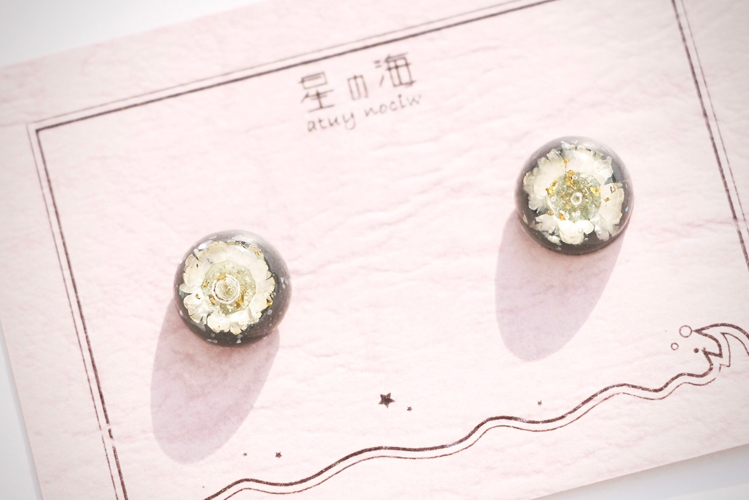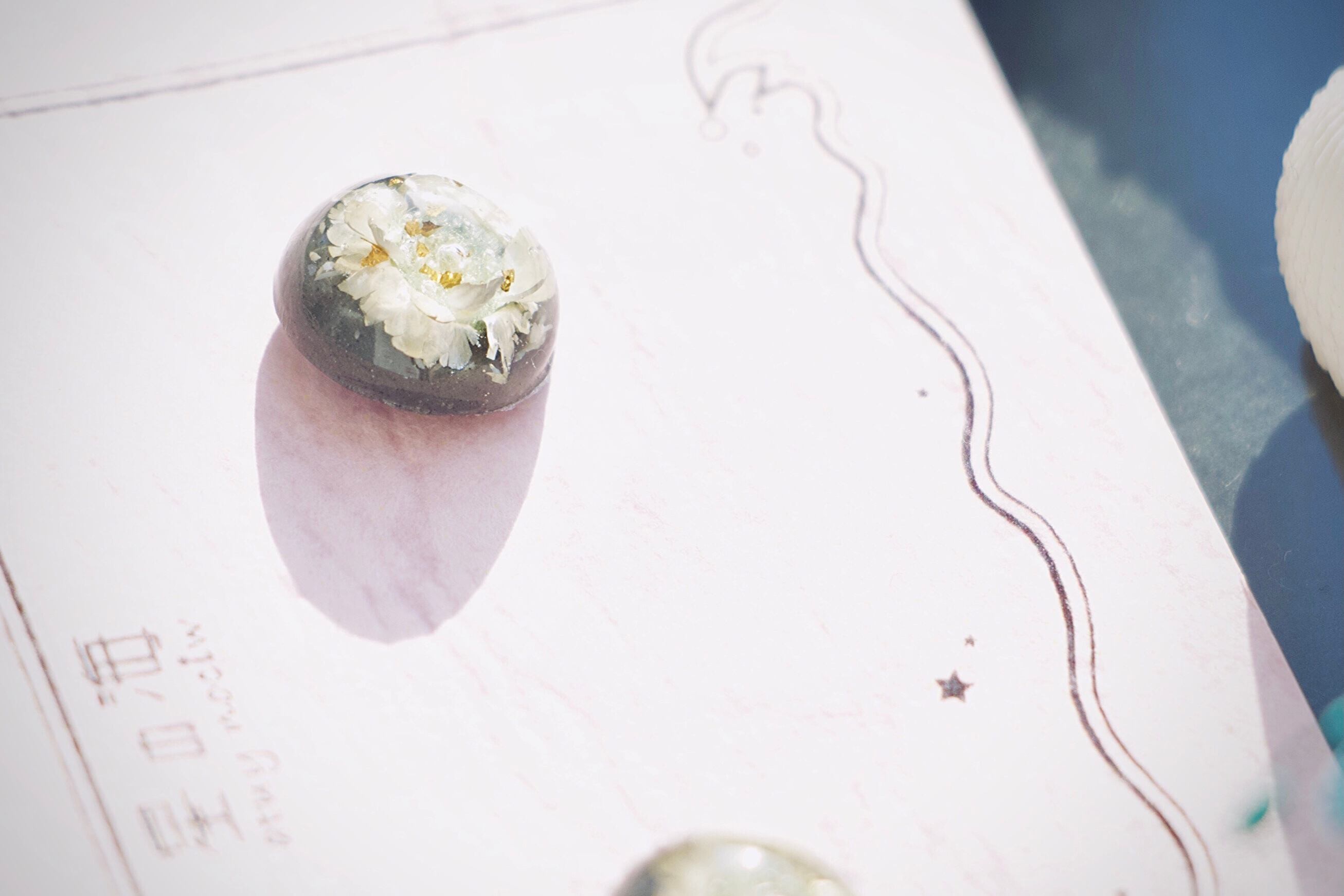 まん丸レジンの中にドライフラワーを一個丸々閉じ込め、ネイビーで蓋をしました。横から見るとお花が地面から生えているようです。