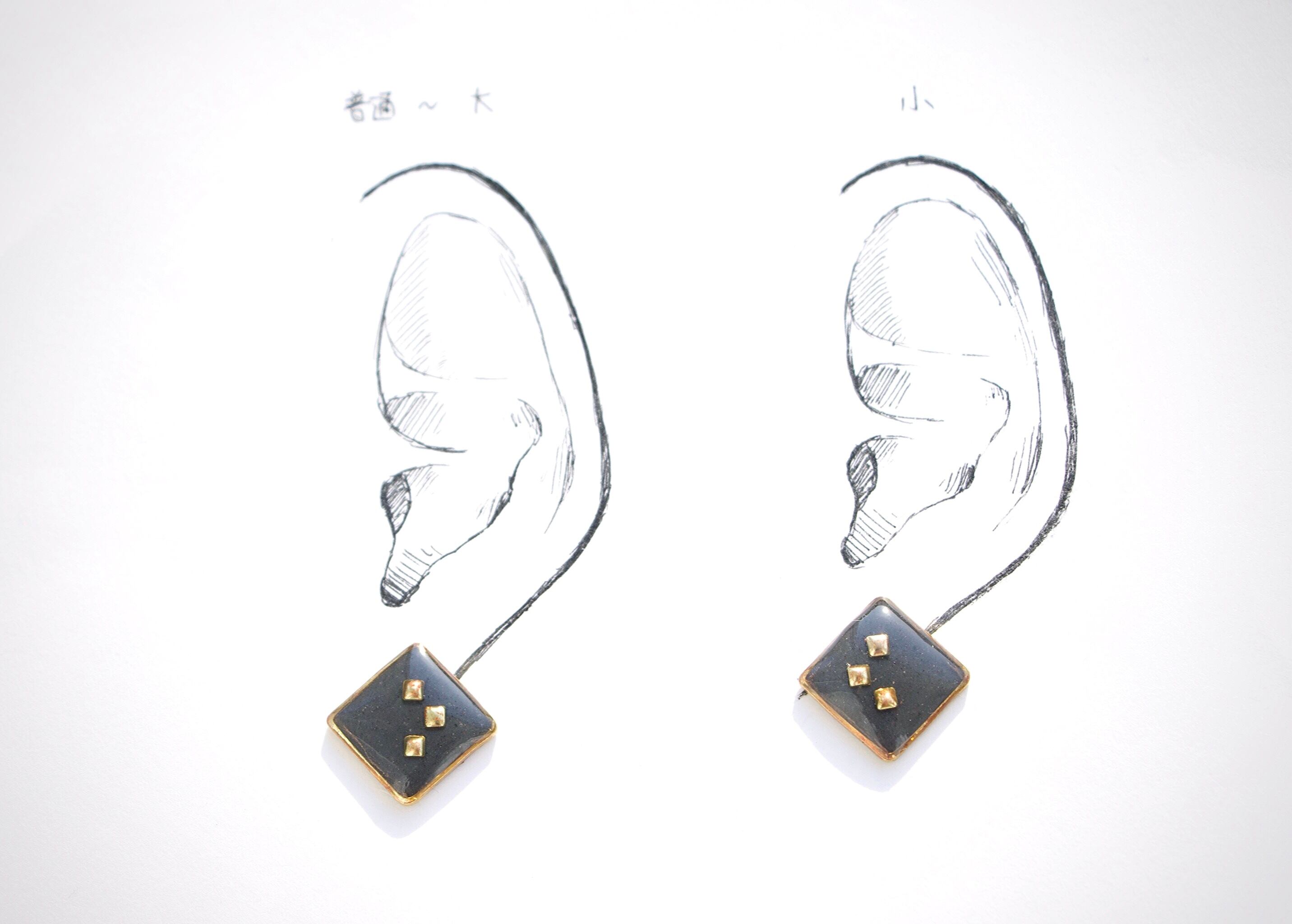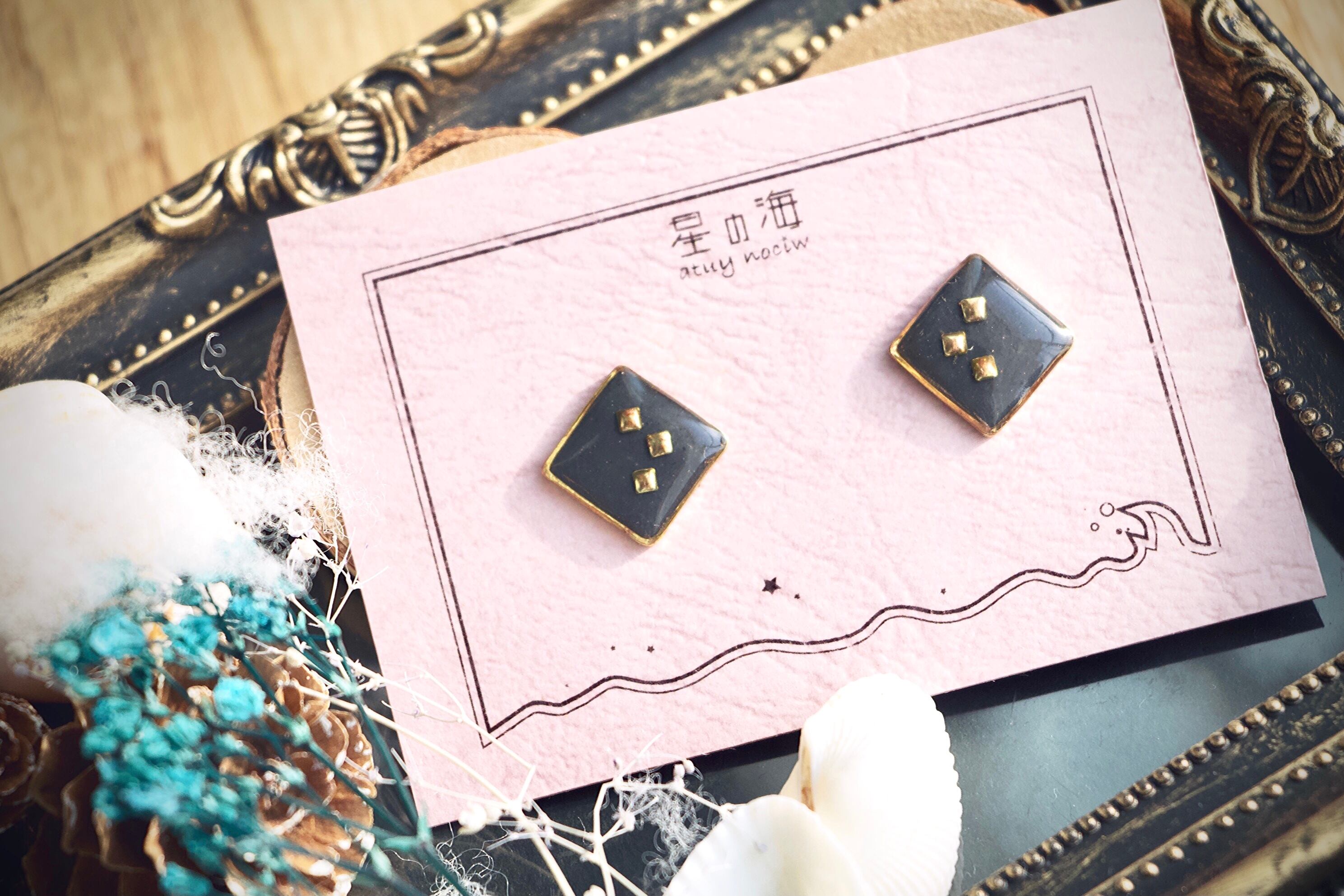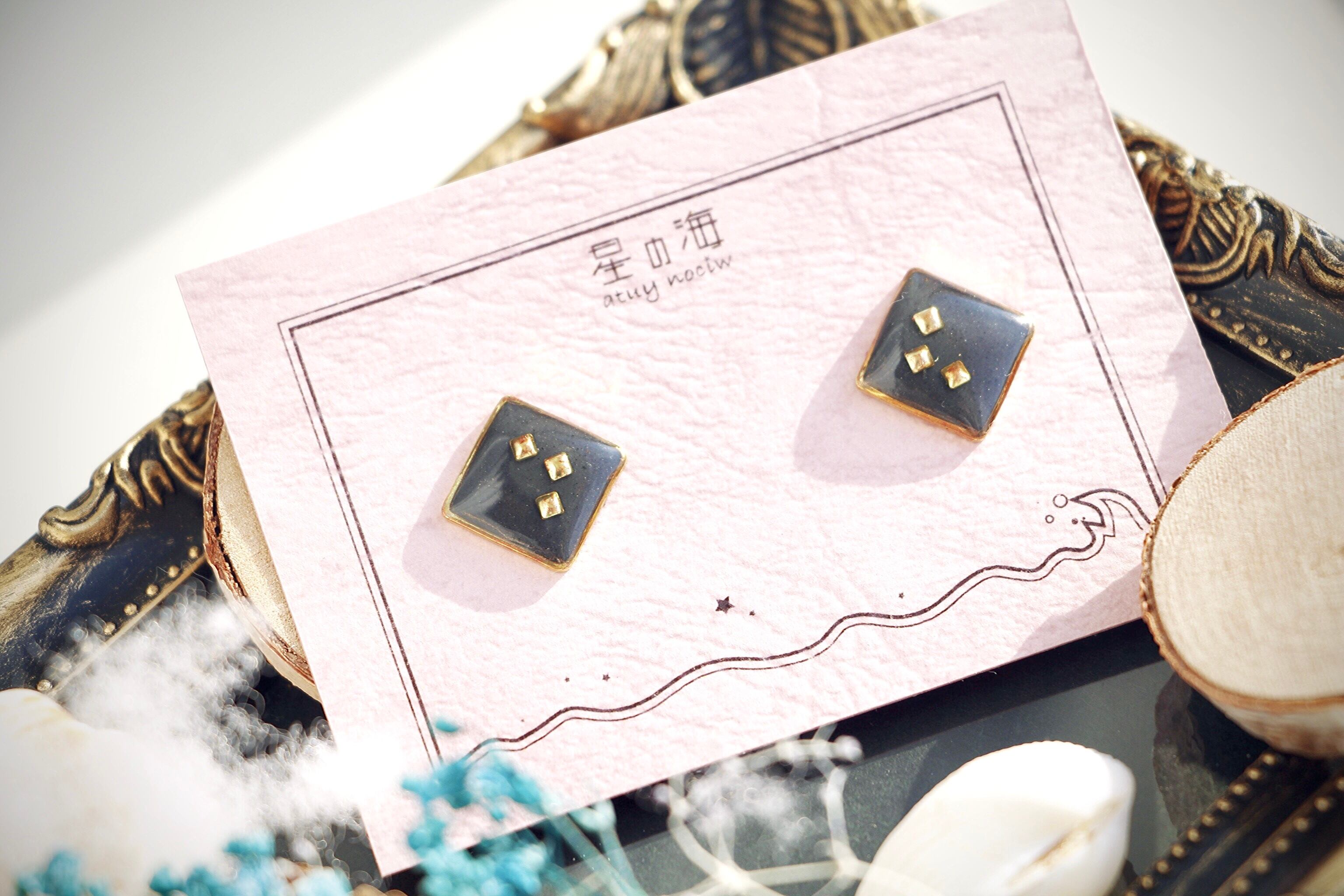 イエローゴールドの四角い枠にはブラウン寄りの薄いブラックを敷き、またまた四角いスタッズを3つ配置しています。