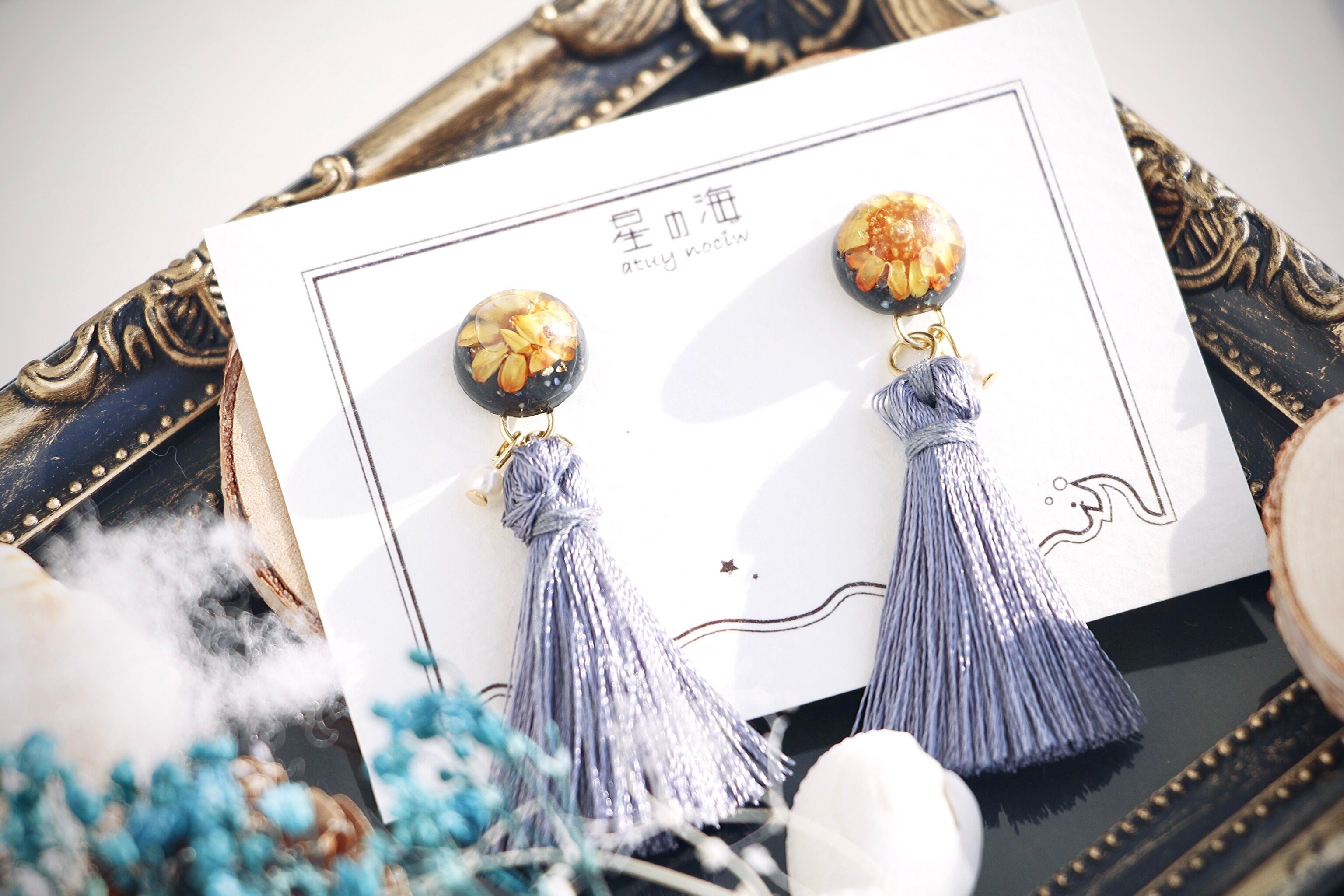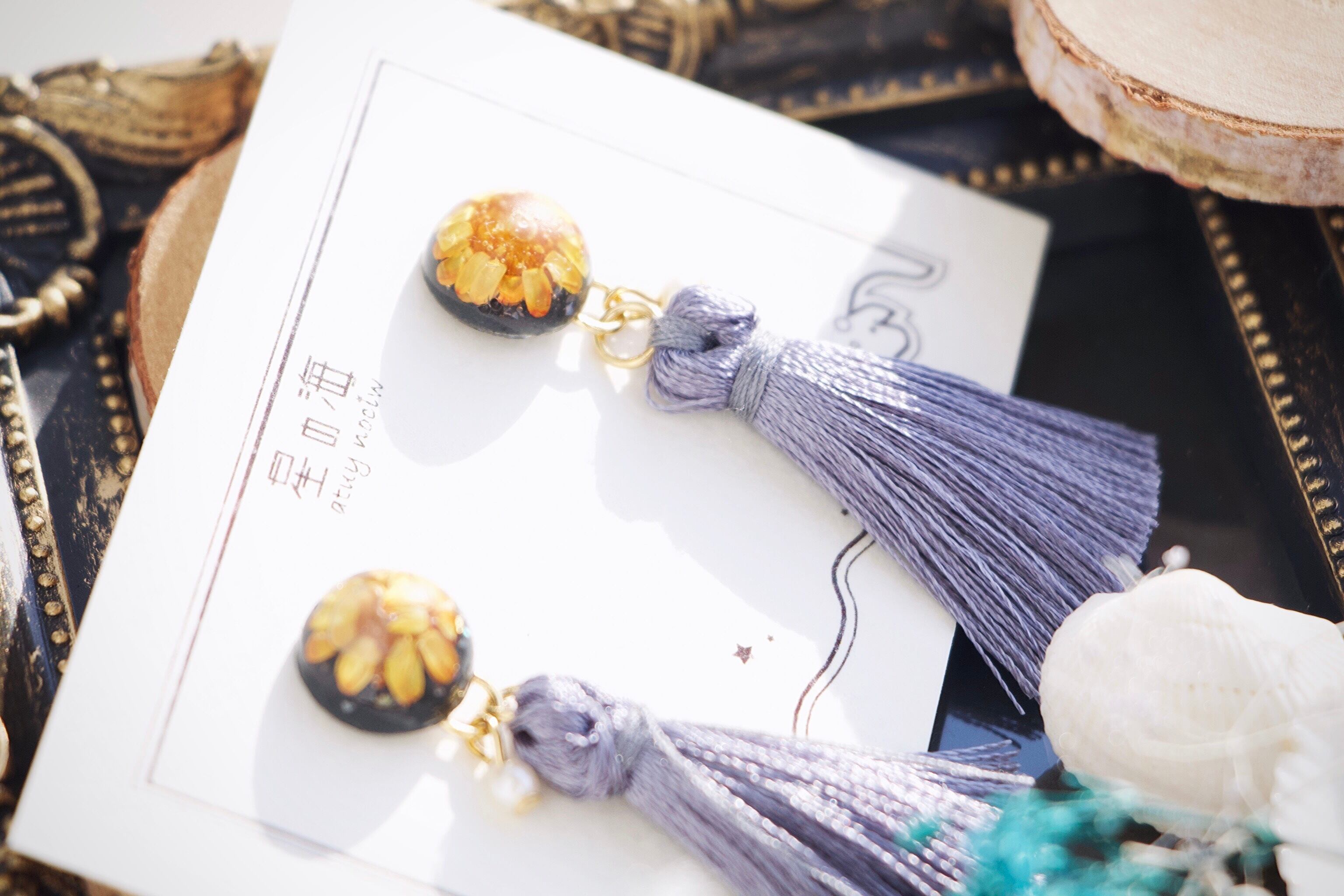 トップにはオレンジと黄色のドライフラワーが満開に咲き、金箔とシェルがほんの少し散らされています。後ろはネイビーで塞ぎ、横から見るとまるでお花が浮いているかのようです。