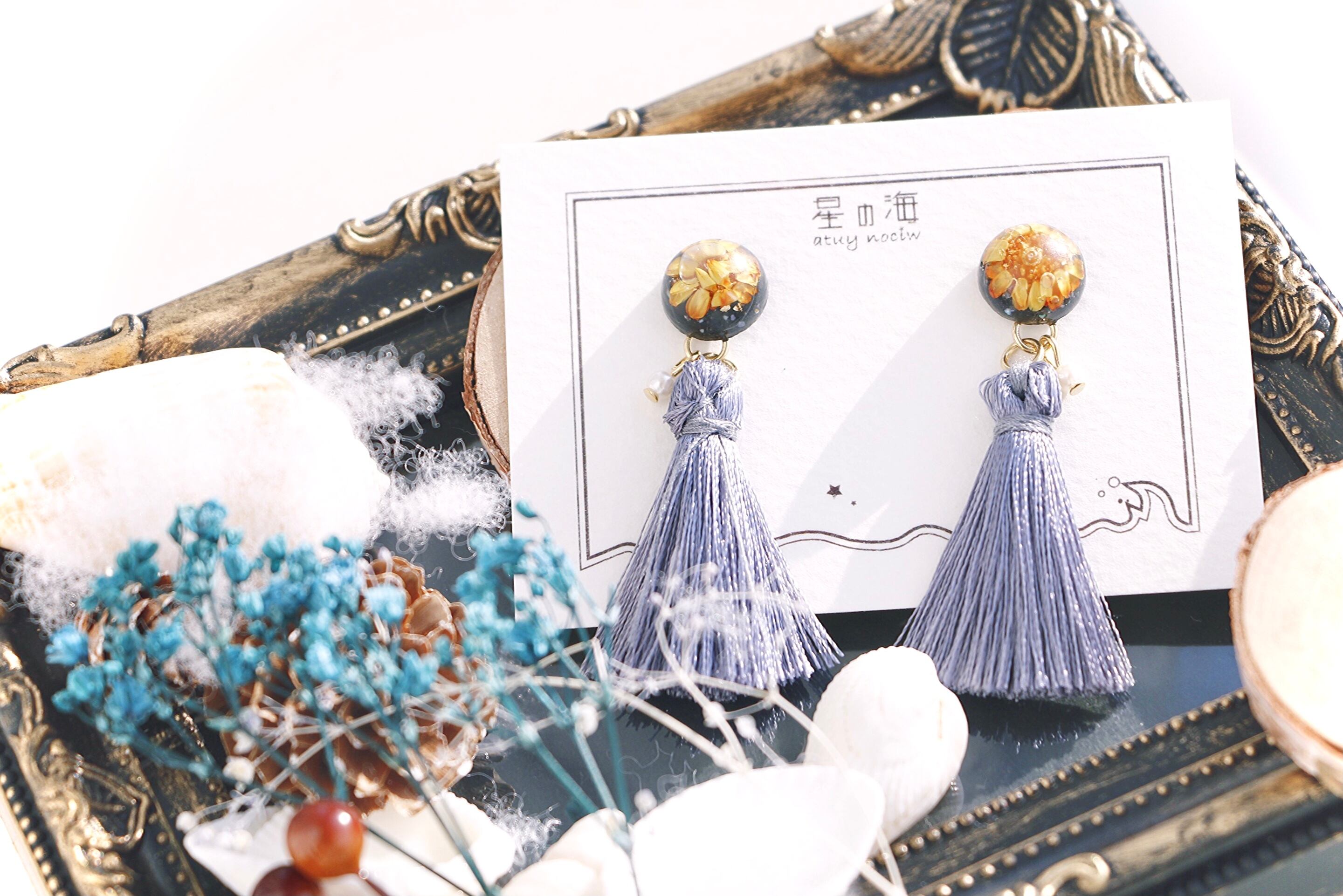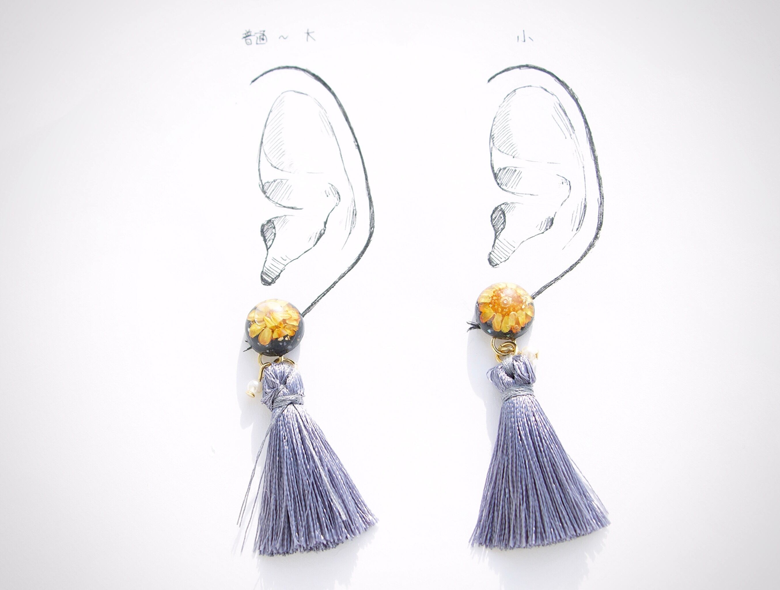 その下からミニパールとブルーグレーのタッセルを垂らすことで動きを出し、トップとの差を出しています!