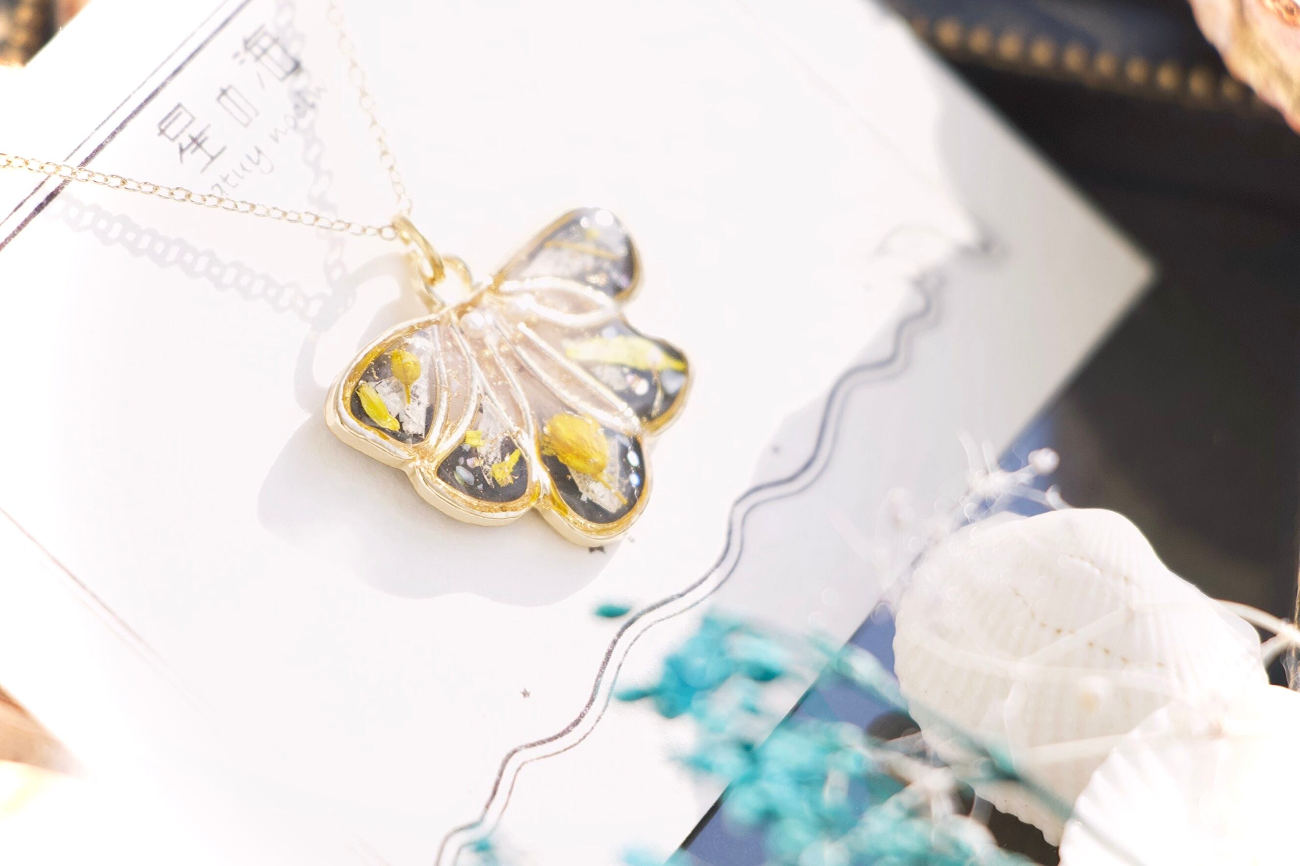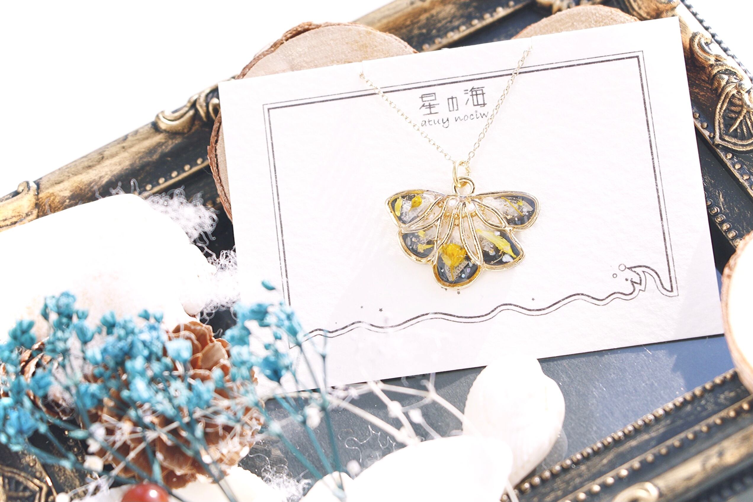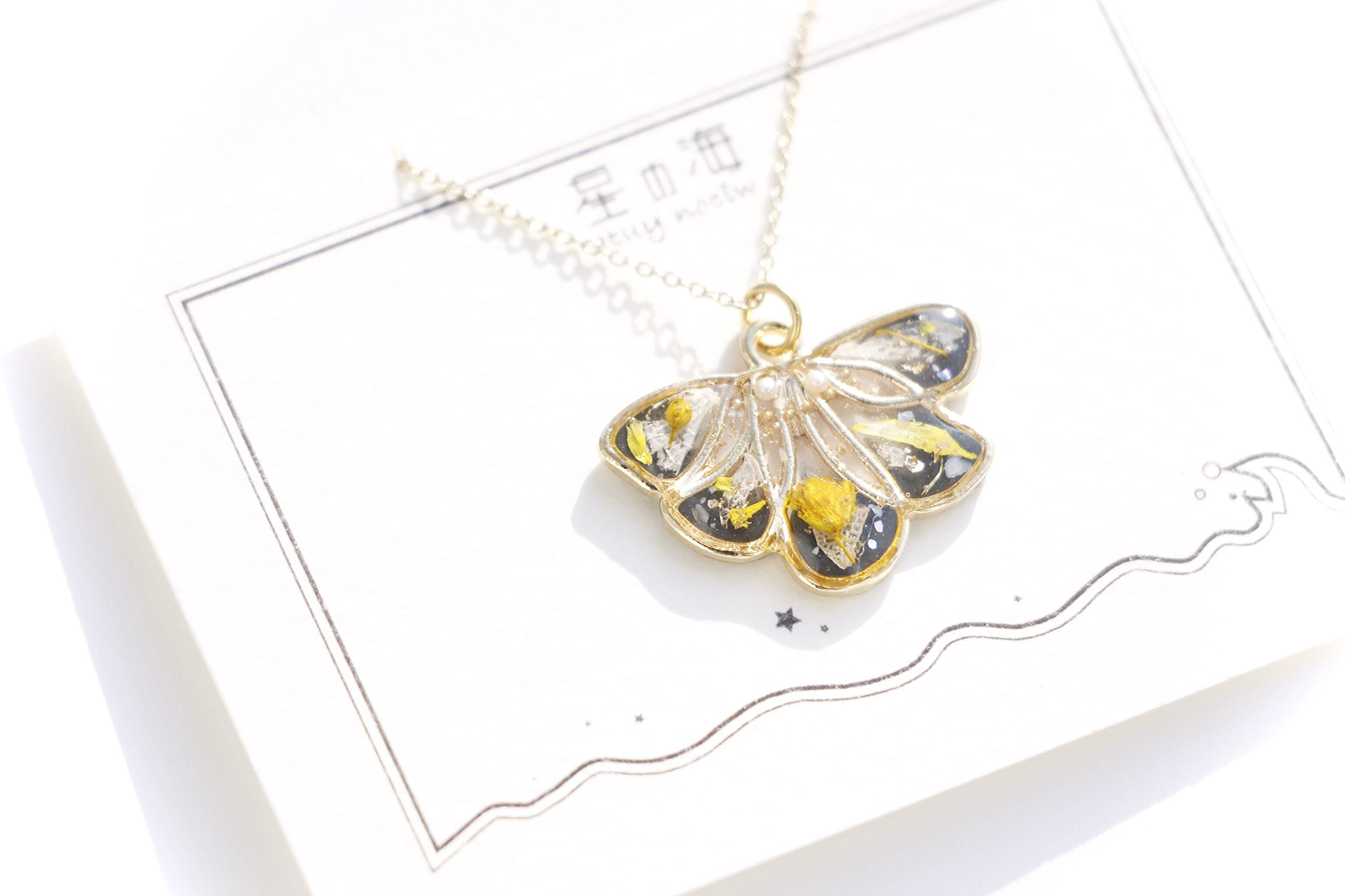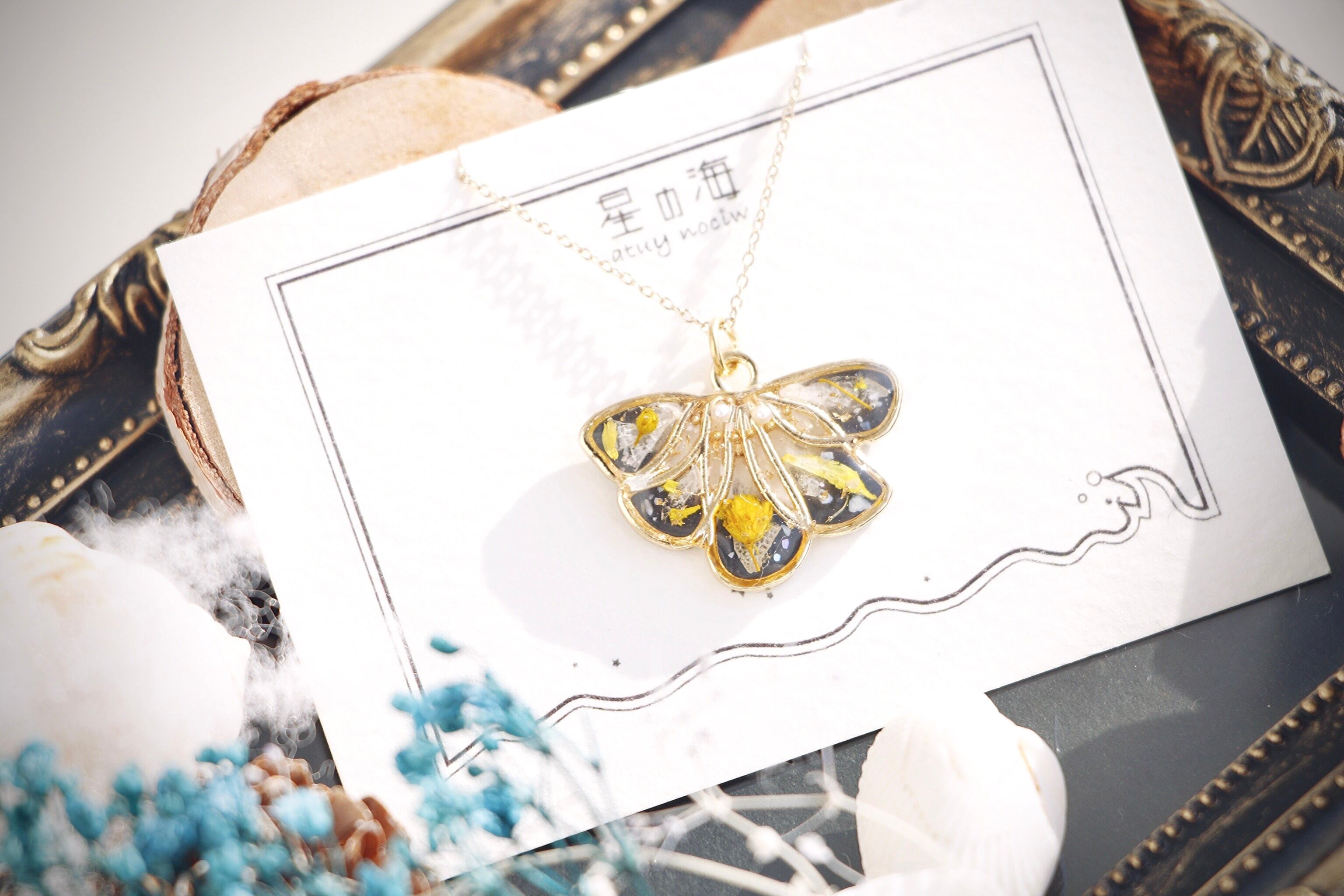 ゴールドの花びらの間にはネイビーとクリアをグラデーションにして埋め、白い紫陽花の欠片を乗せています。その上から黄色の花びらや蕾を散らし、鮮やかに!
