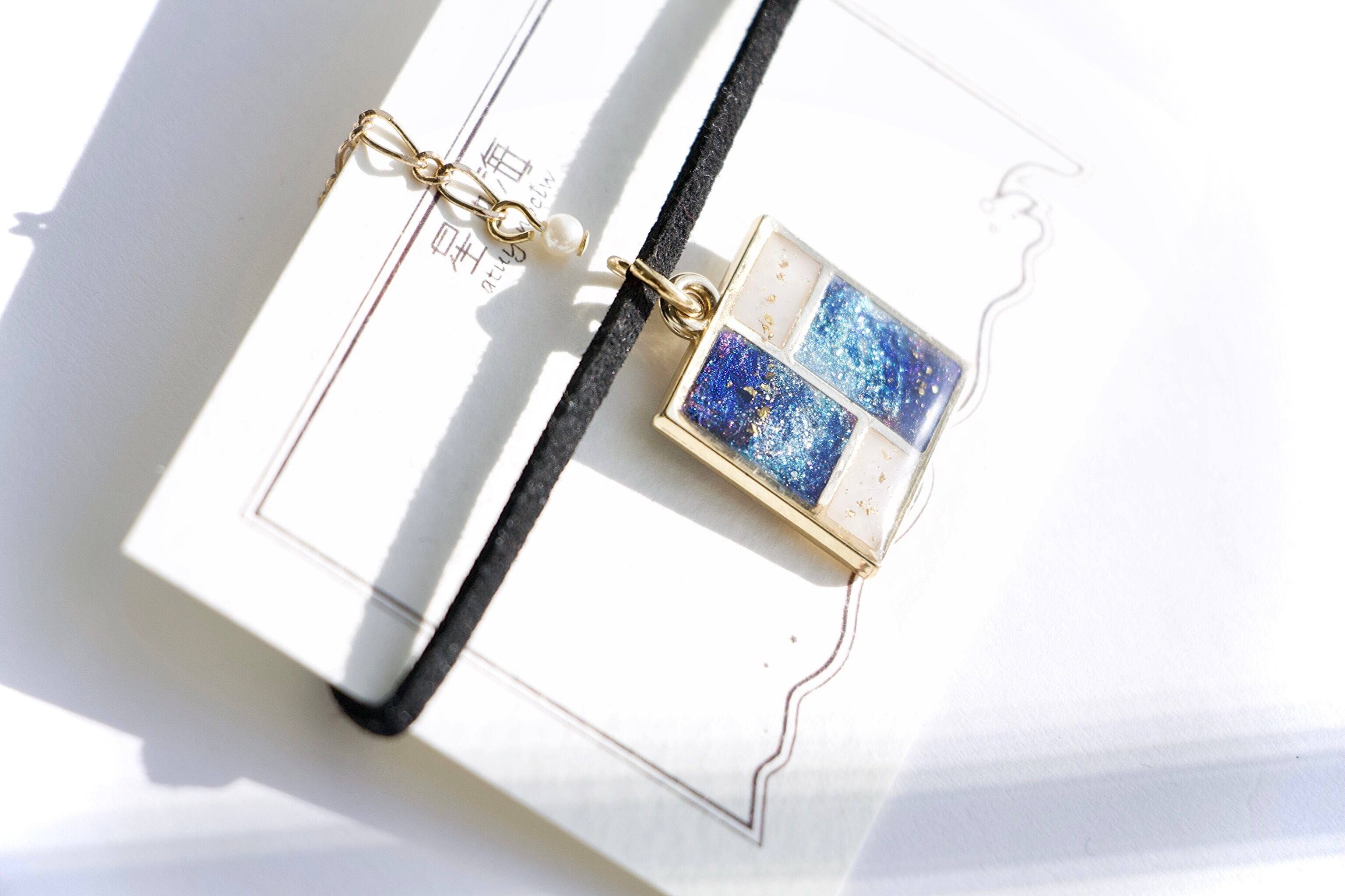 トップはチョコレートのような、格子の窓のような形をしたゴールド空枠。その中に白いレジンを敷き詰め、窓の外の景色のように宇宙柄を施しています。上から金箔の星をひと匙ふりかけ、キリッとしたアクセントに。
