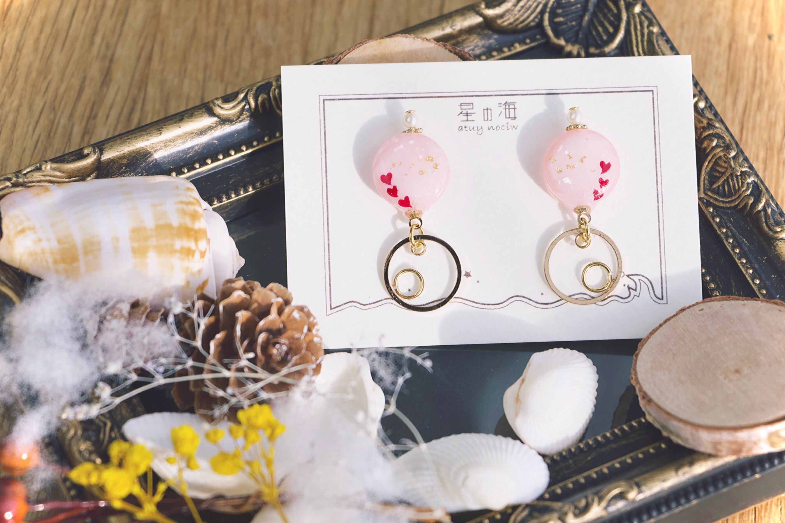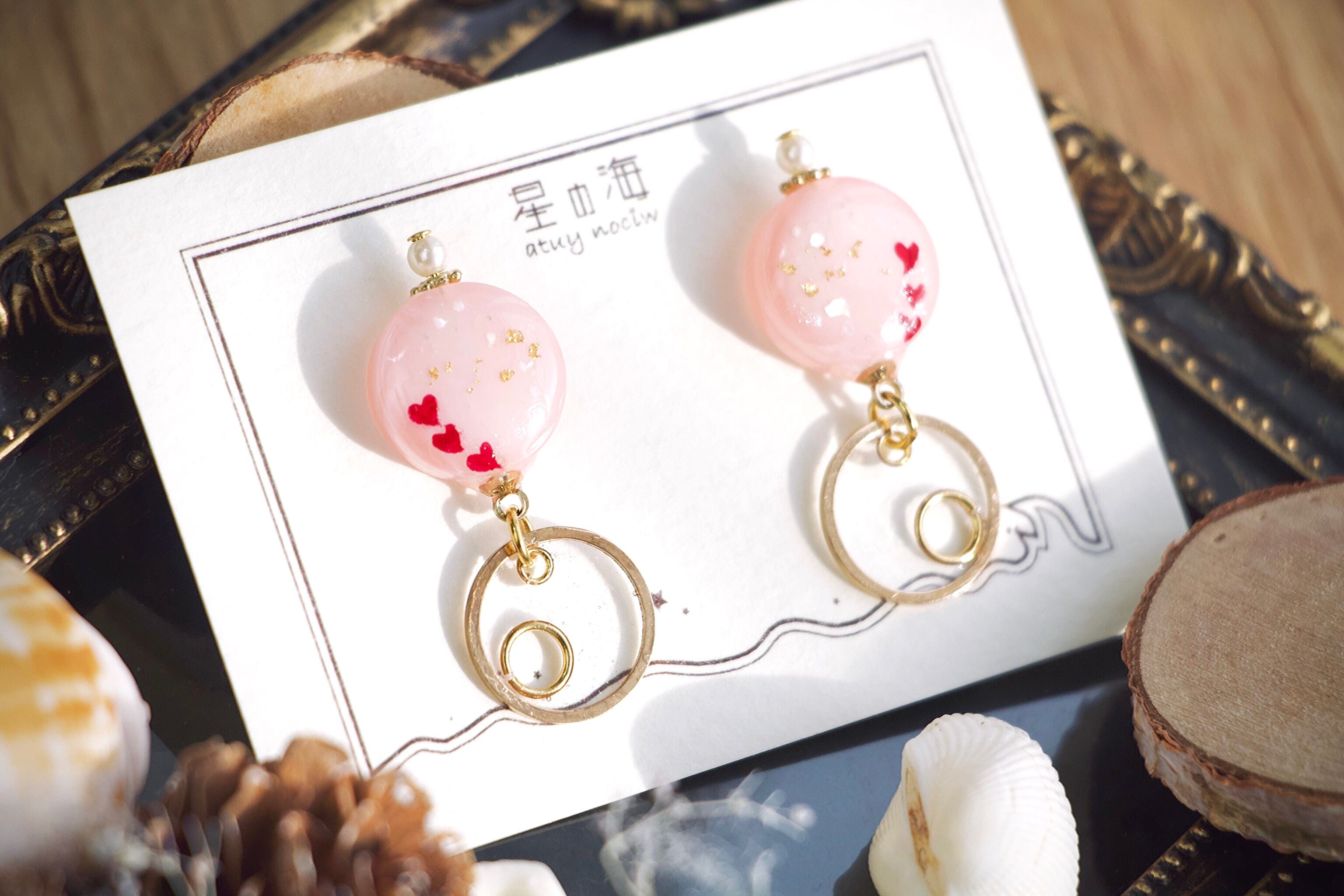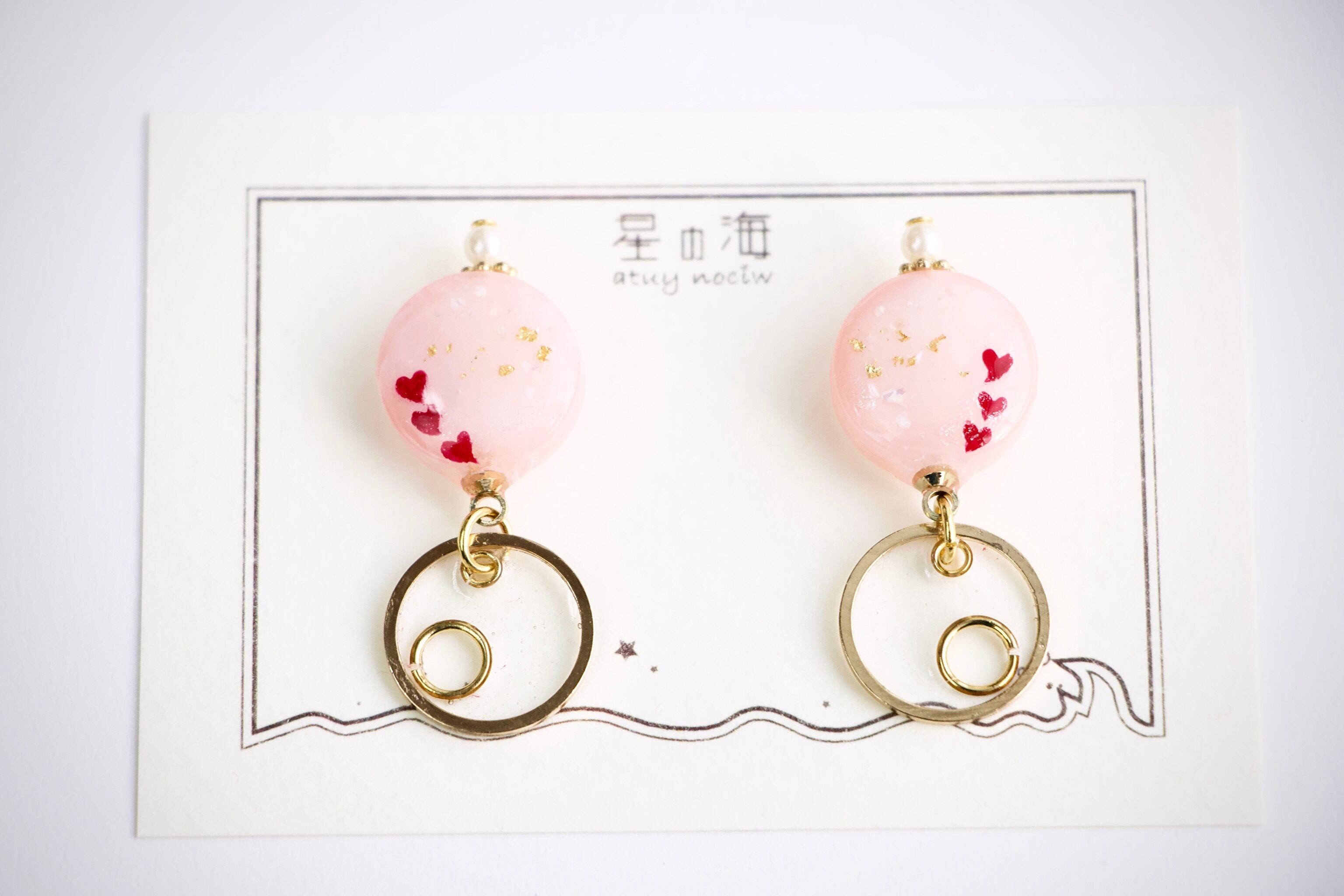 トップは飴玉のような淡いピンク色と白のマーブルビーズにワインレッドのハートを描き、白いレジンで甘さを控えつつ金箔とシェルを散らしてみました。無造作に舞うラメがまるでパシャパシャと揺れる香水のよう。