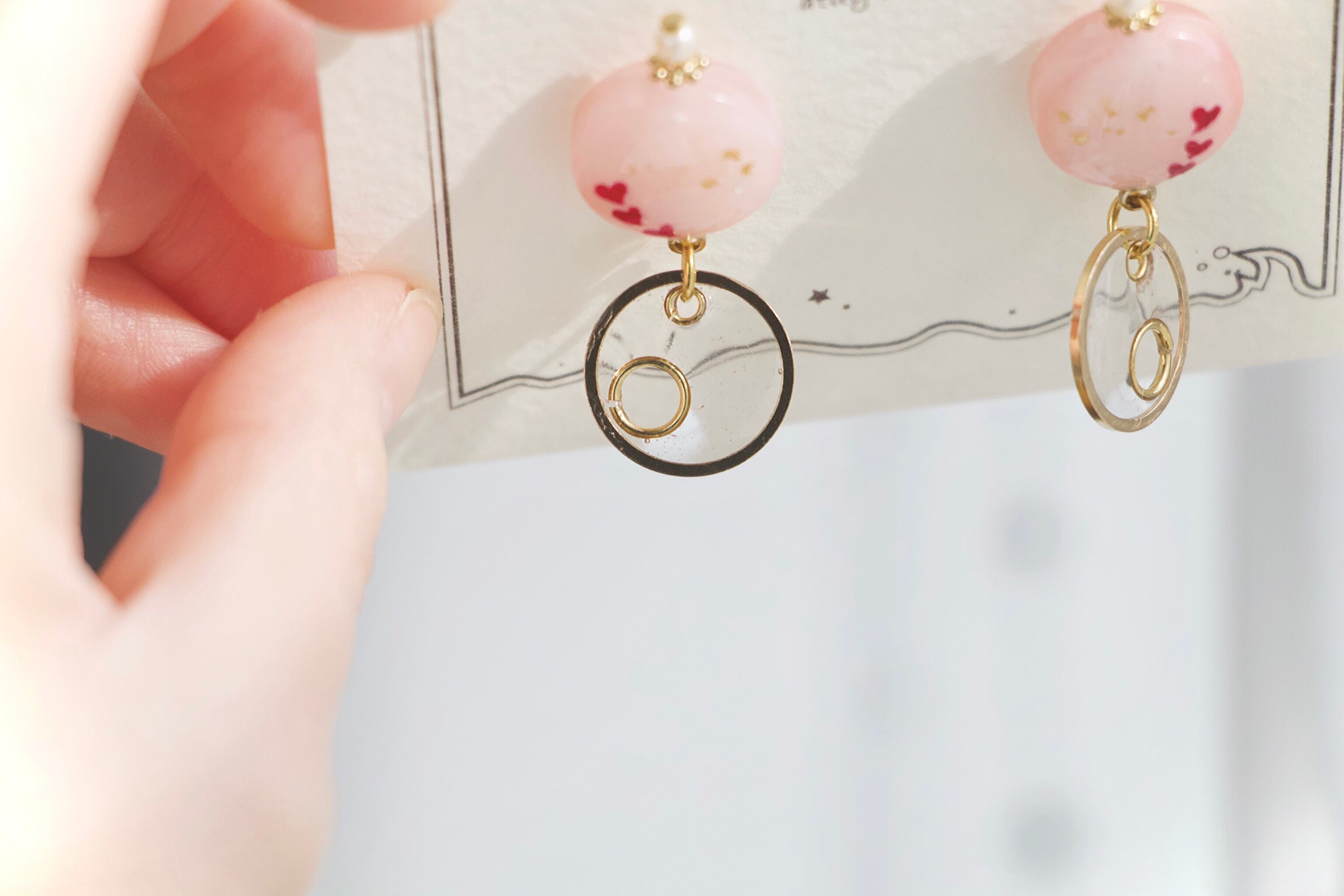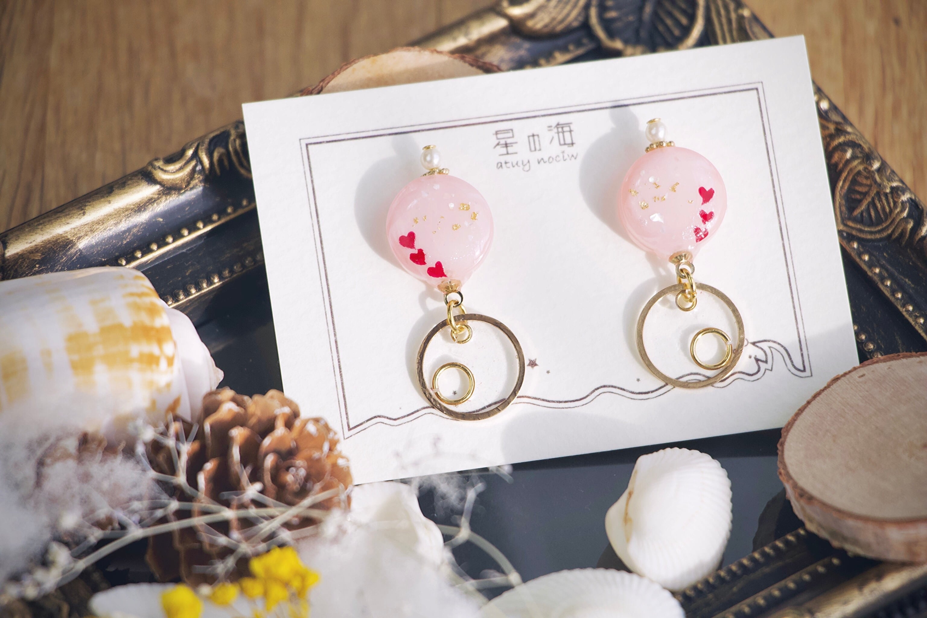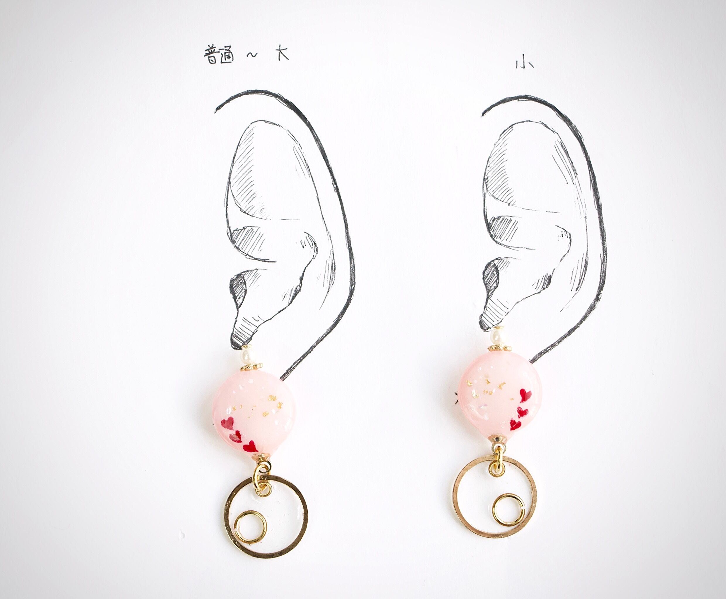 トップは飴玉のような淡いピンク色と白のマーブルビーズにワインレッドのハートを描き、白いレジンで甘さを控えつつ金箔とシェルを散らしてみました。無造作に舞うラメがまるでパシャパシャと揺れる香水のよう。