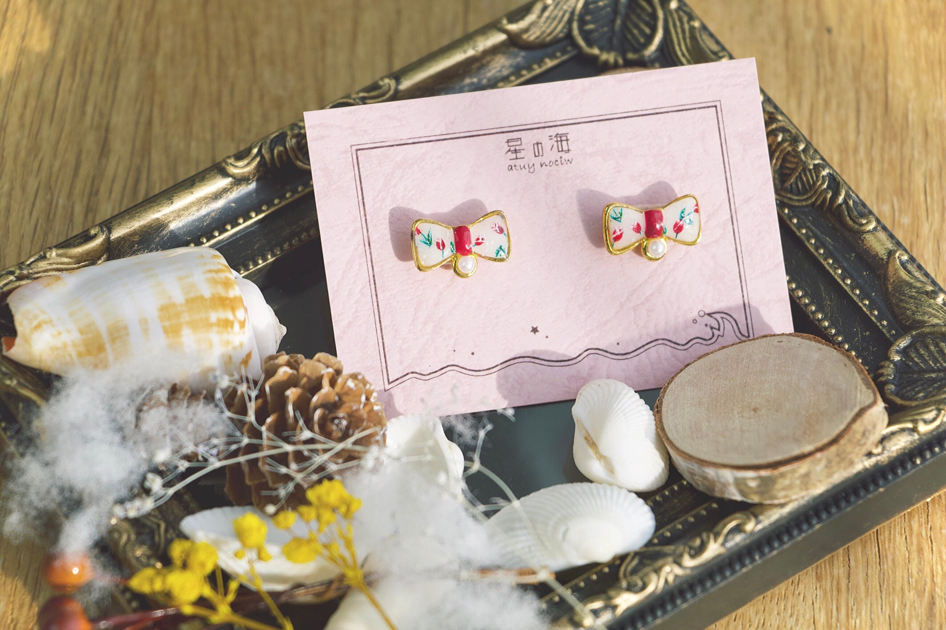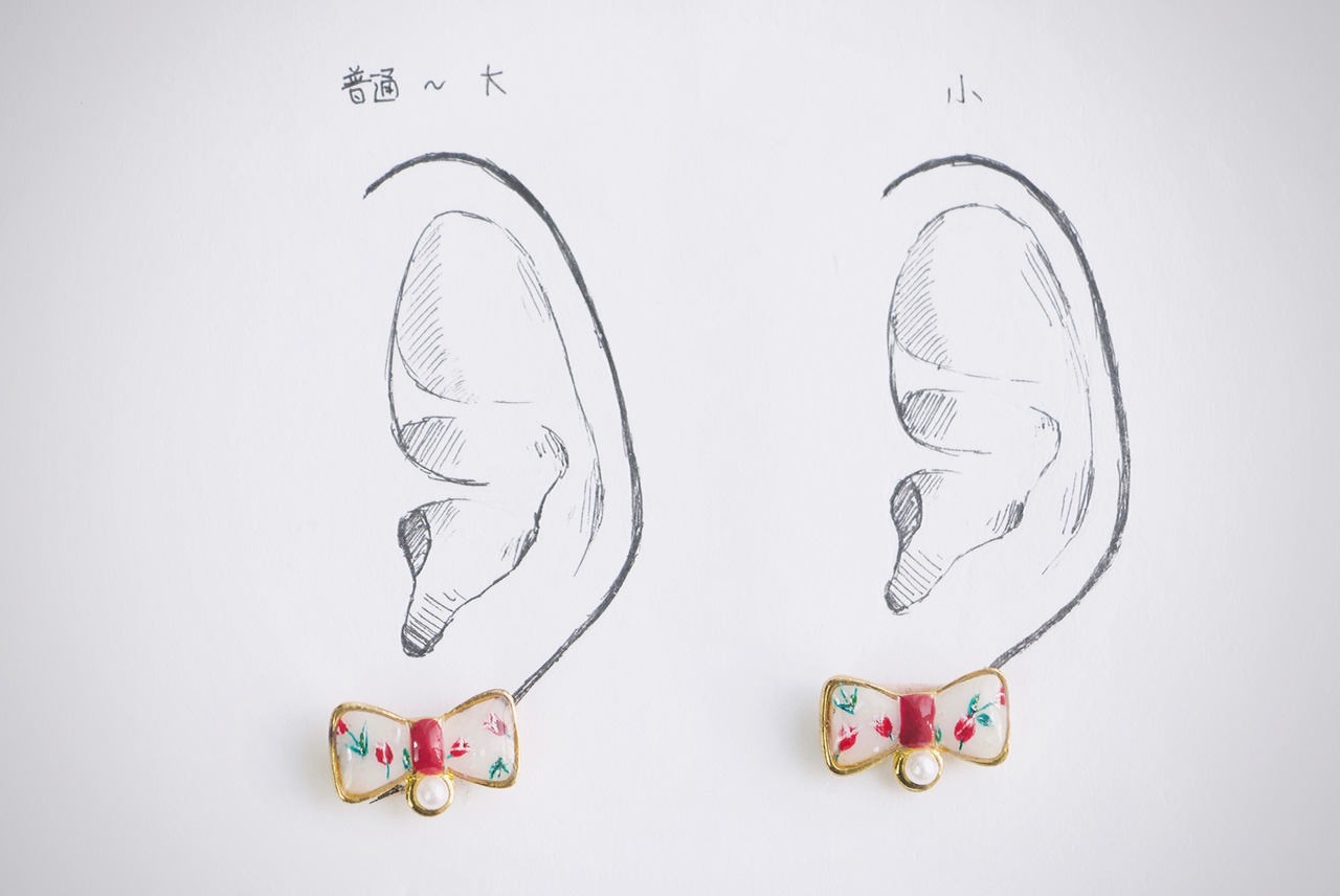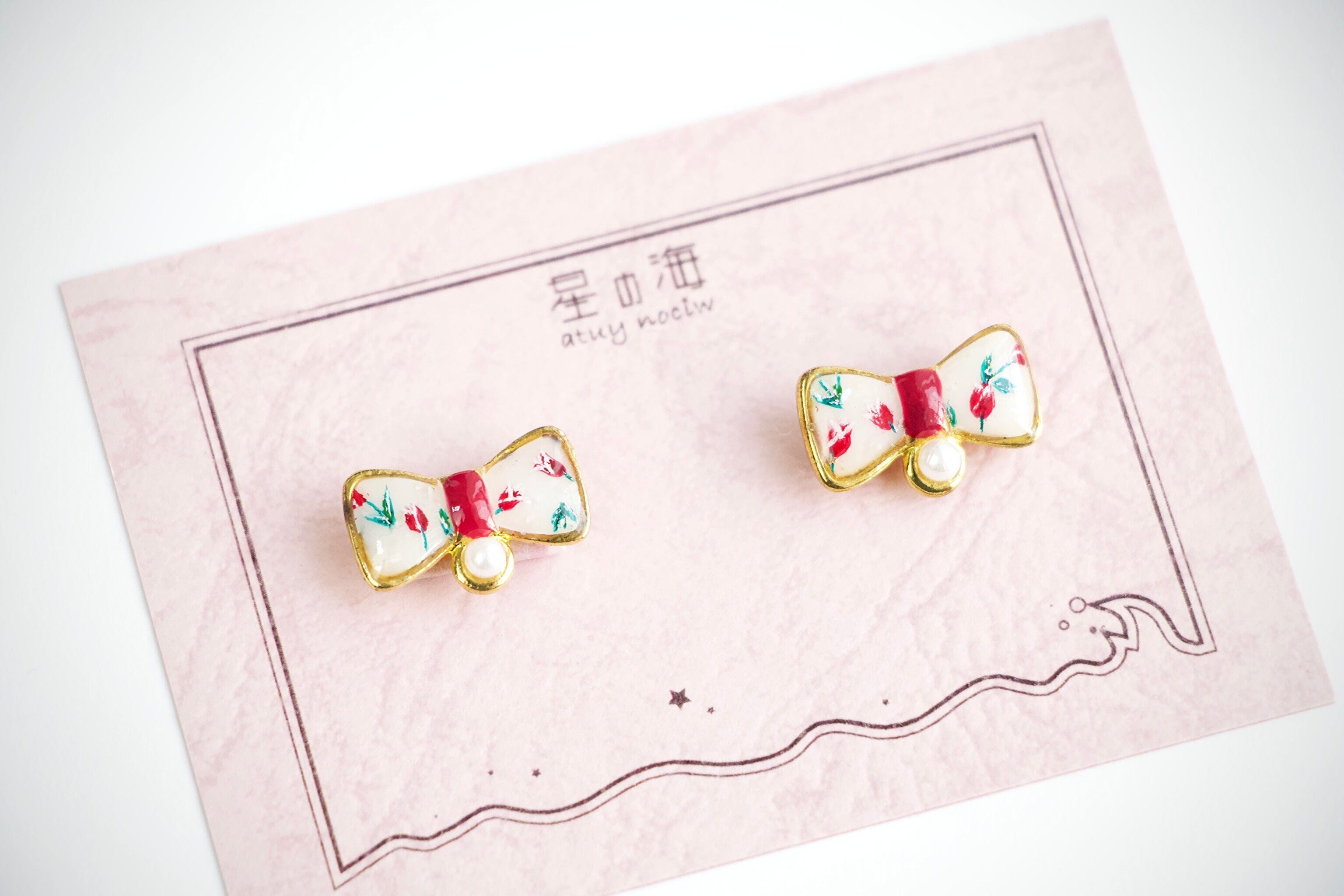 真ん中は結んで見えるようにチューリップと同じ色を塗ることで大人っぽく絞まって見えます。最後にミニパールを下に飾って全体をぷっくりとさせたら可愛らしいリボンアクセサリーの完成です♡